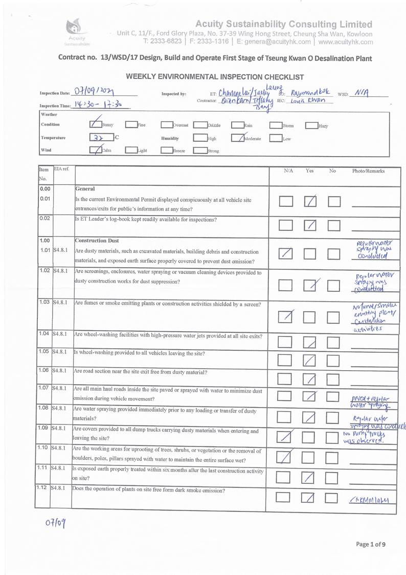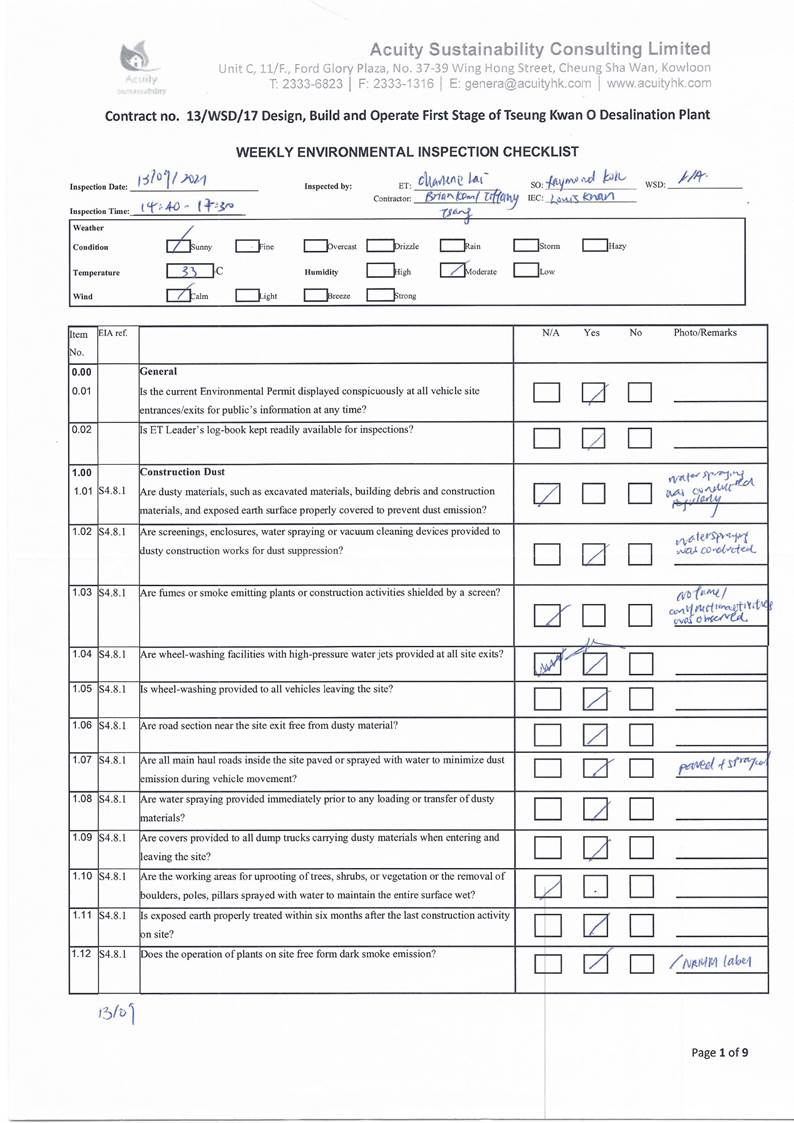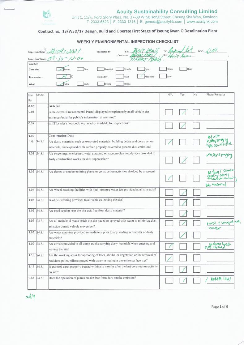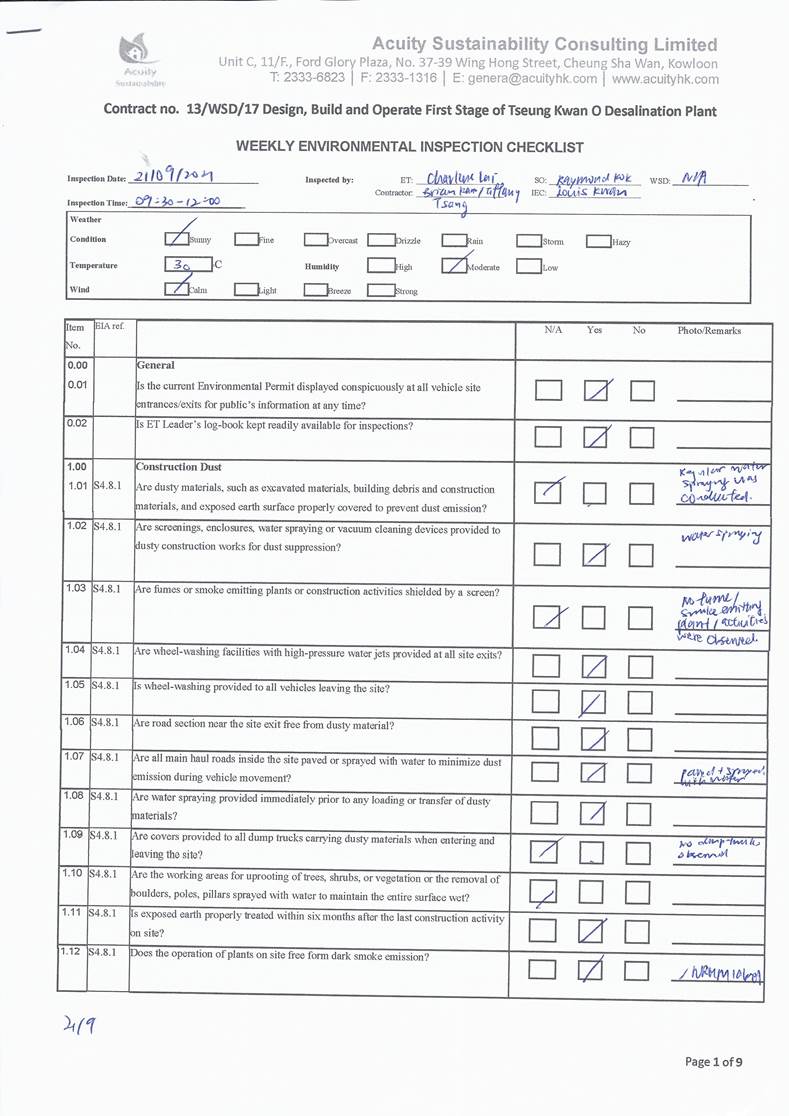 A15. Joint site inspections of the construction work by ET and IEC were carried out on 7, 13, 21, and 28 September 2021 to audit the mitigation measures implementation status. Observations were recorded in the site inspection checklists and provided to the contractors together with the appropriate follow-up actions where necessary.