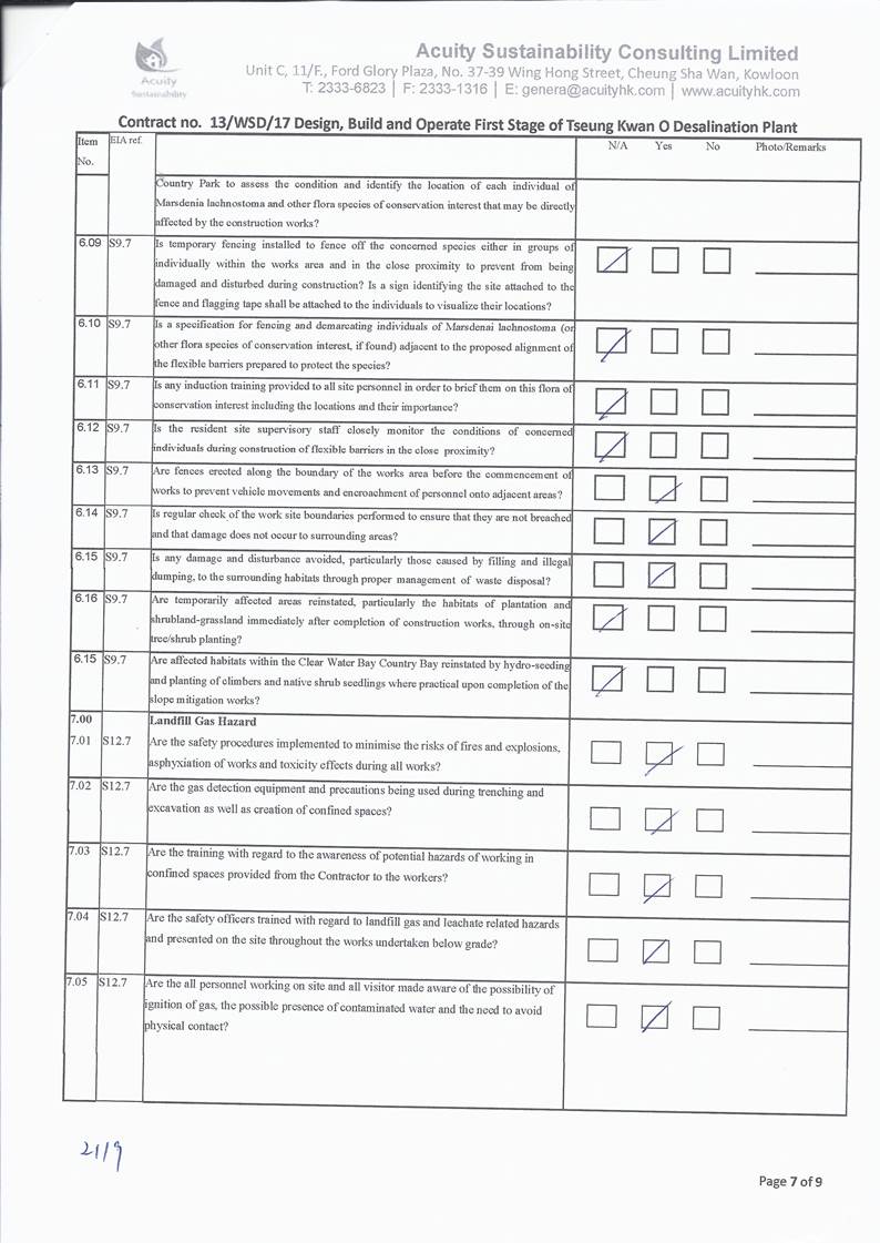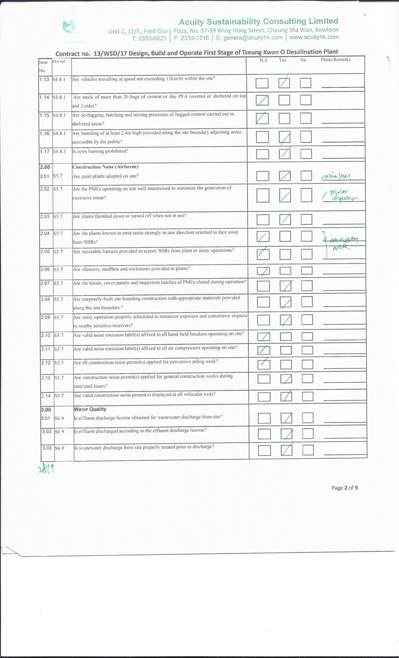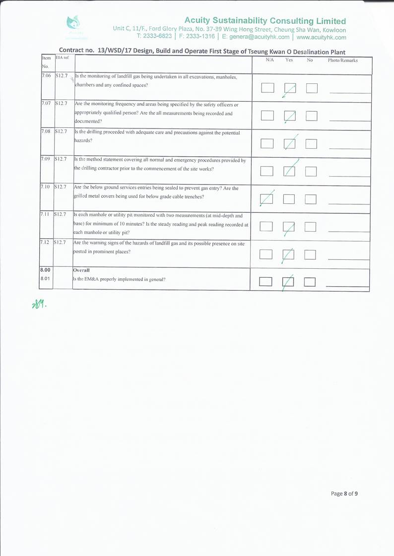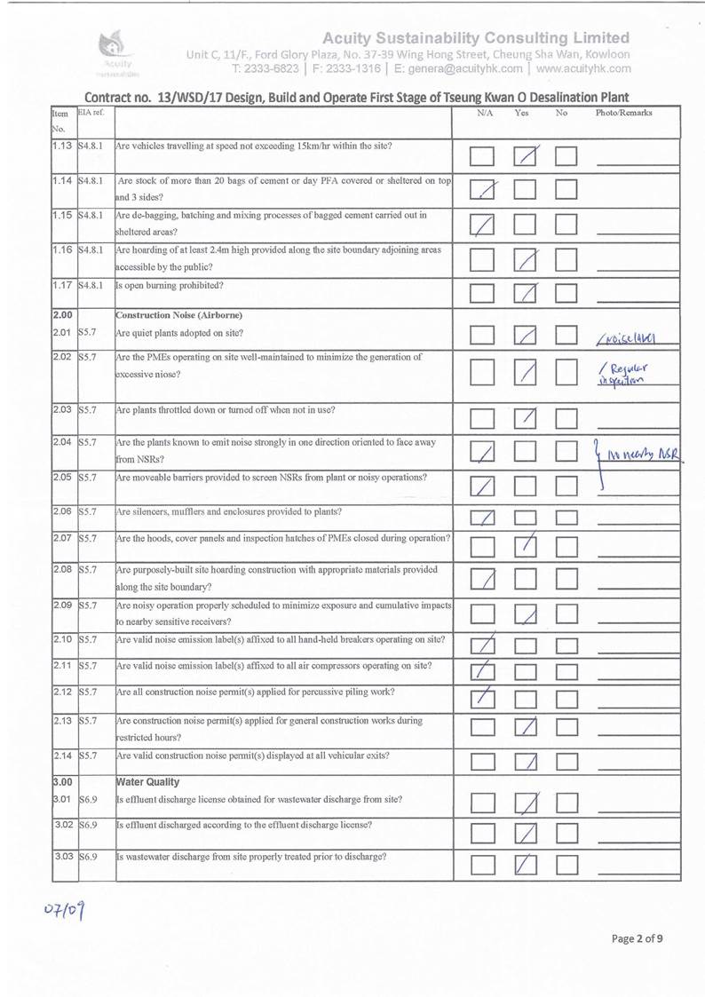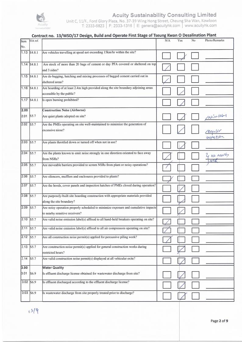 A2. In accordance with the Environmental Monitoring and Audit (EM&A) Manual for the Project, EM&A works for marine water quality, noise, waste management and ecology should be carried out by Environmental Team (ET), Acuity Sustainability Consulting Limited (ASCL), during the construction phase of the Project.