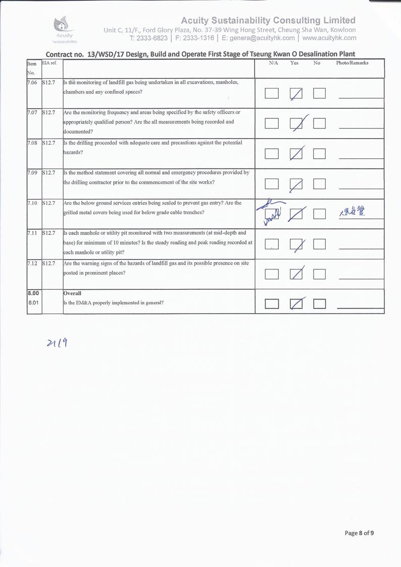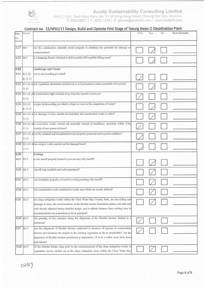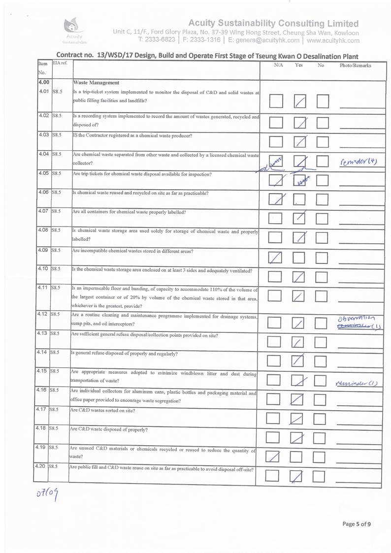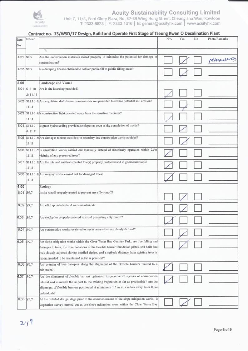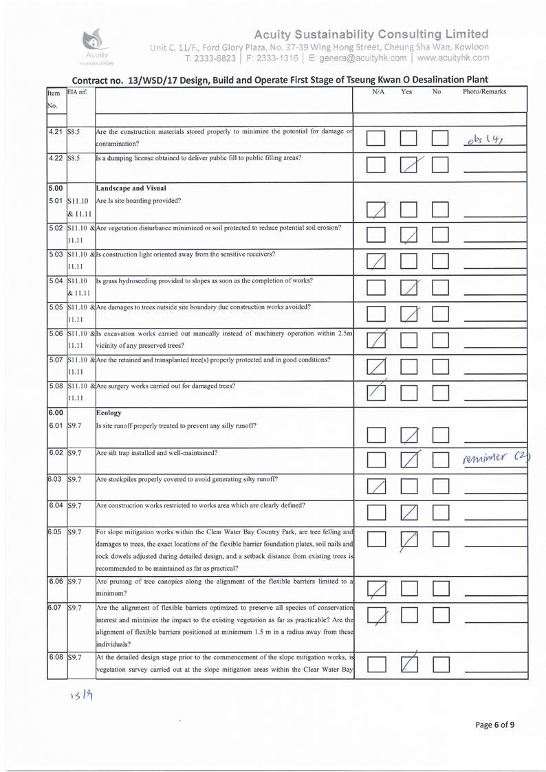 A2. In accordance with the Environmental Monitoring and Audit (EM&A) Manual for the Project, EM&A works for marine water quality, noise, waste management and ecology should be carried out by Environmental Team (ET), Acuity Sustainability Consulting Limited (ASCL), during the construction phase of the Project.