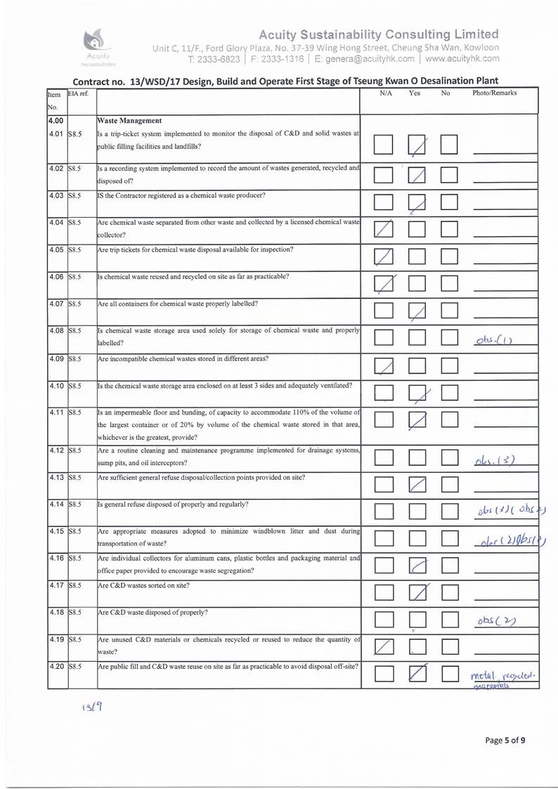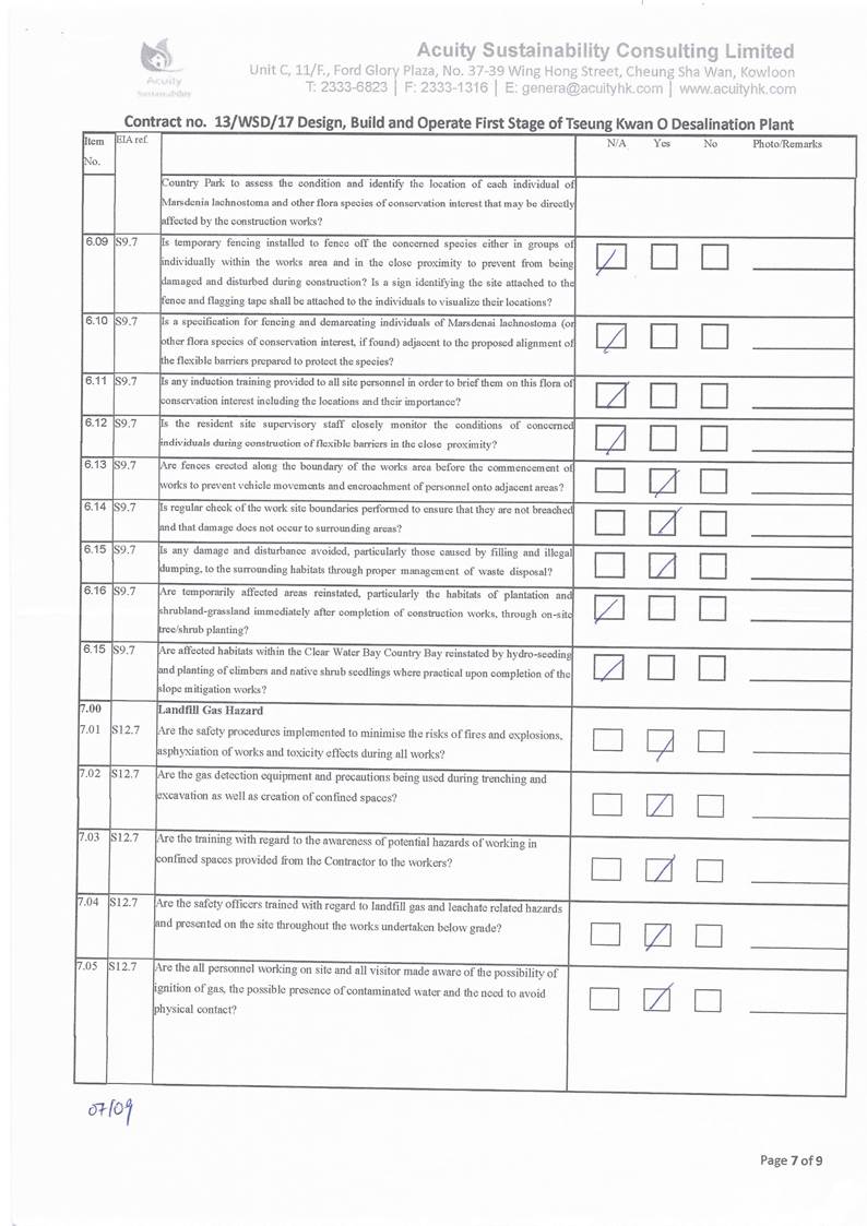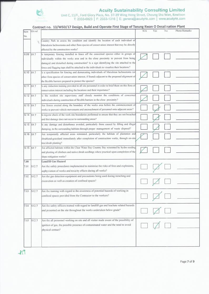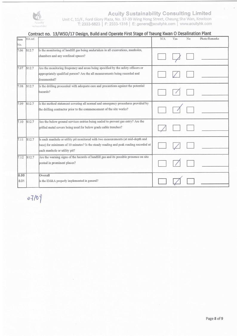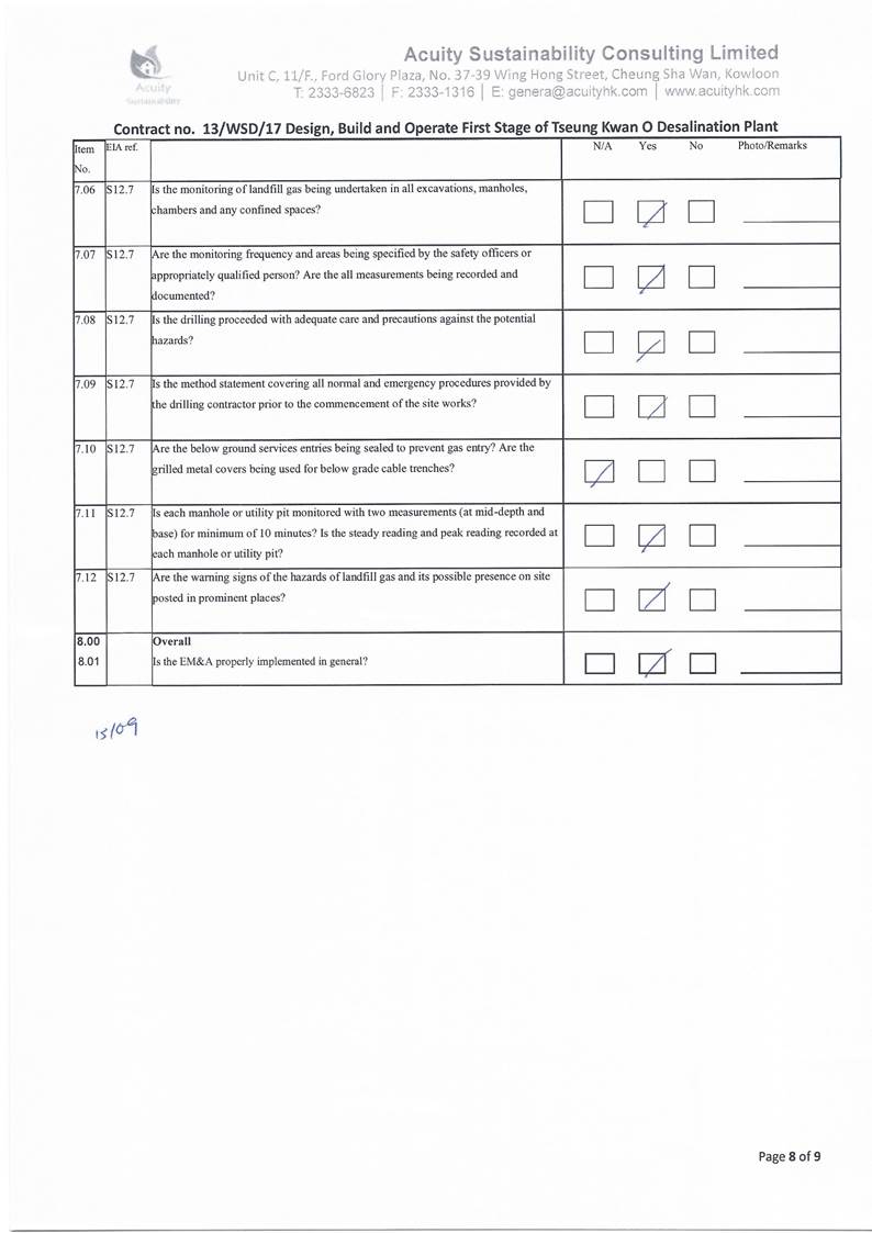 A2. In accordance with the Environmental Monitoring and Audit (EM&A) Manual for the Project, EM&A works for marine water quality, noise, waste management and ecology should be carried out by Environmental Team (ET), Acuity Sustainability Consulting Limited (ASCL), during the construction phase of the Project.