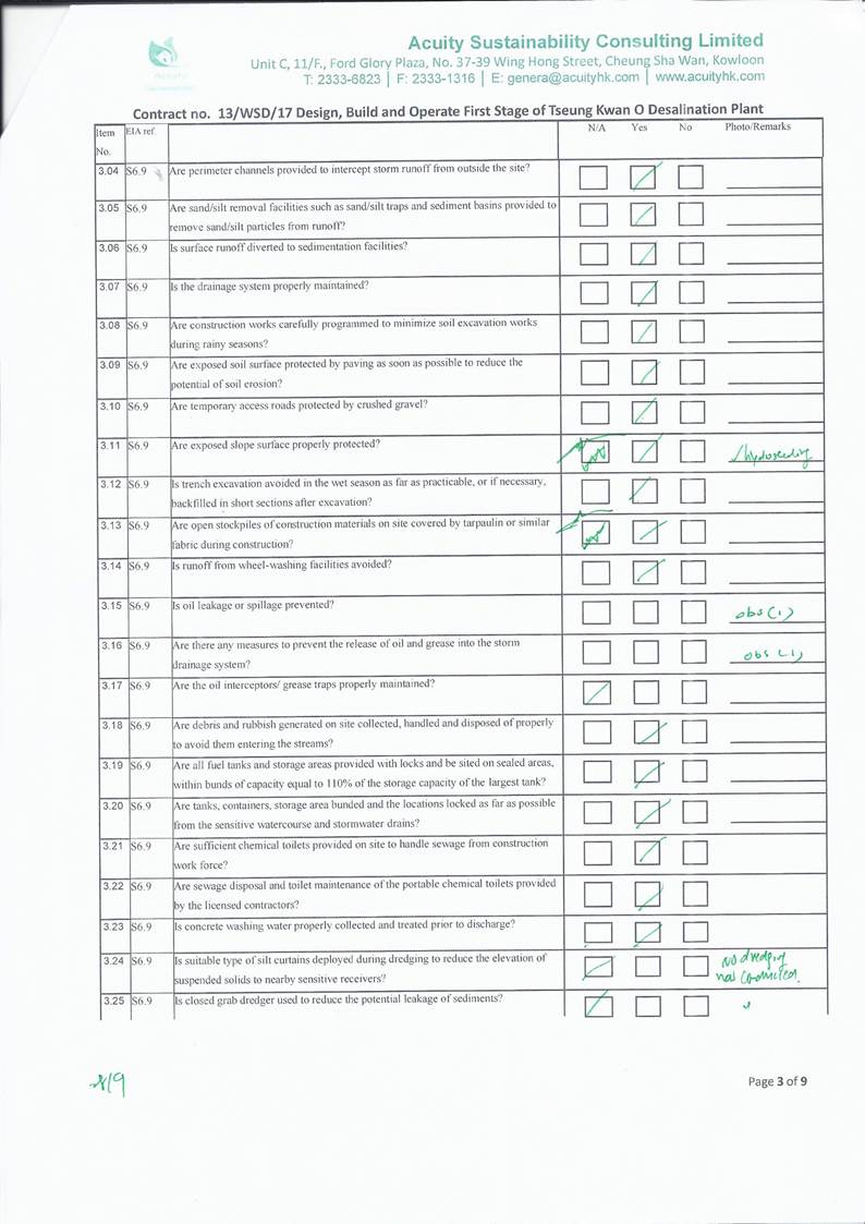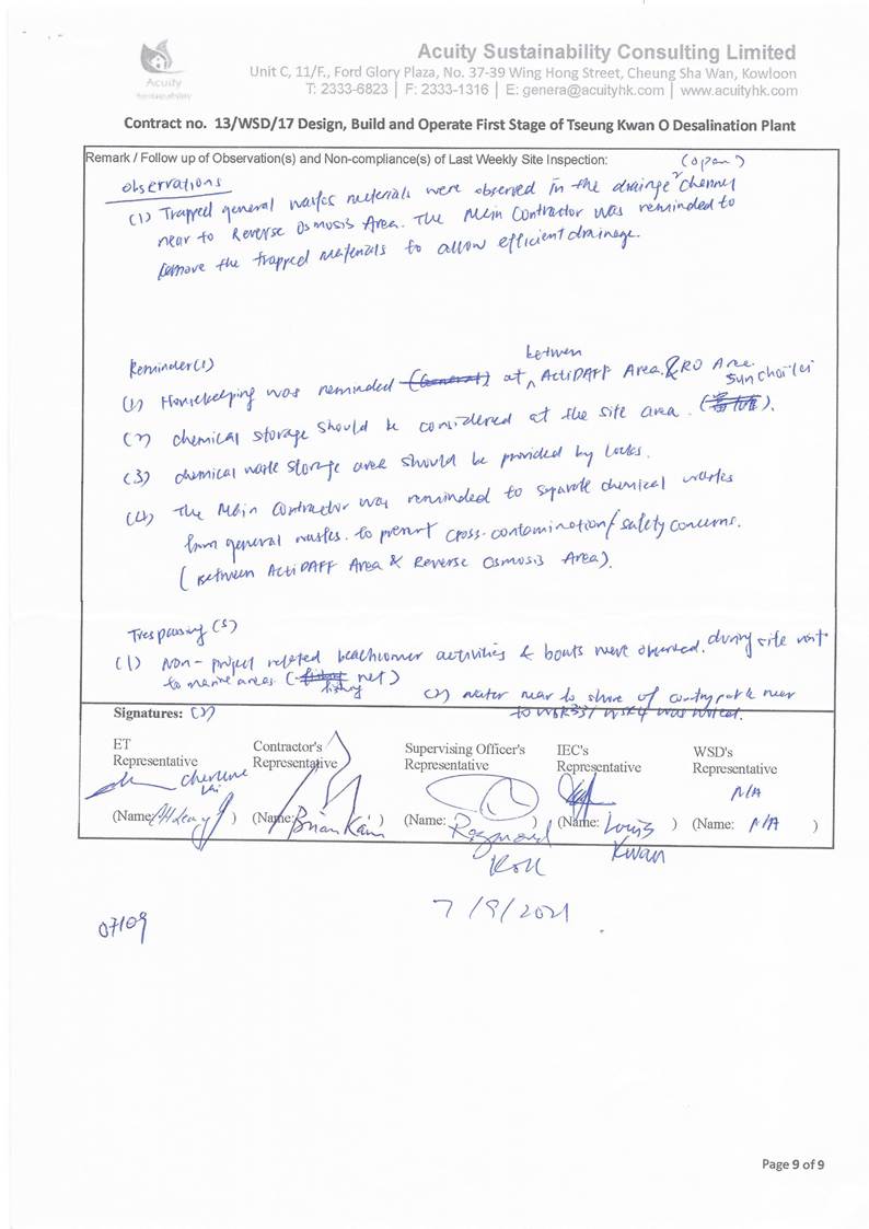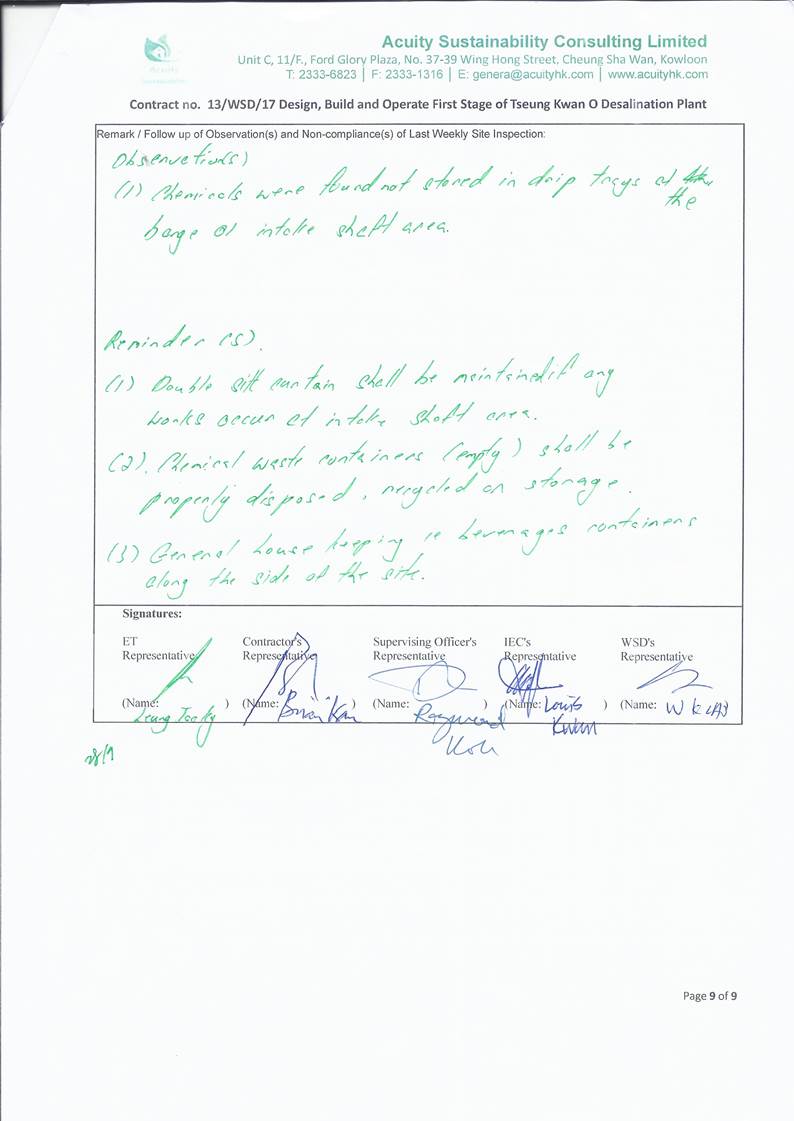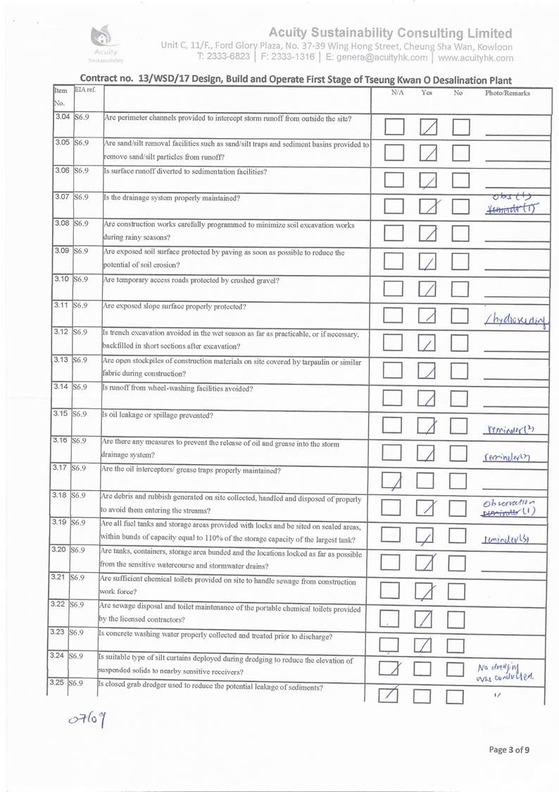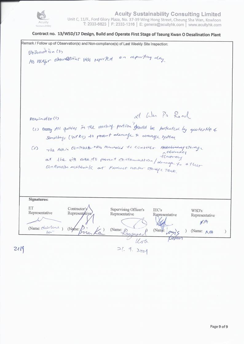A9. The EM&A works for water quality were conducted during the reporting period in accordance with the EM&A Manual.