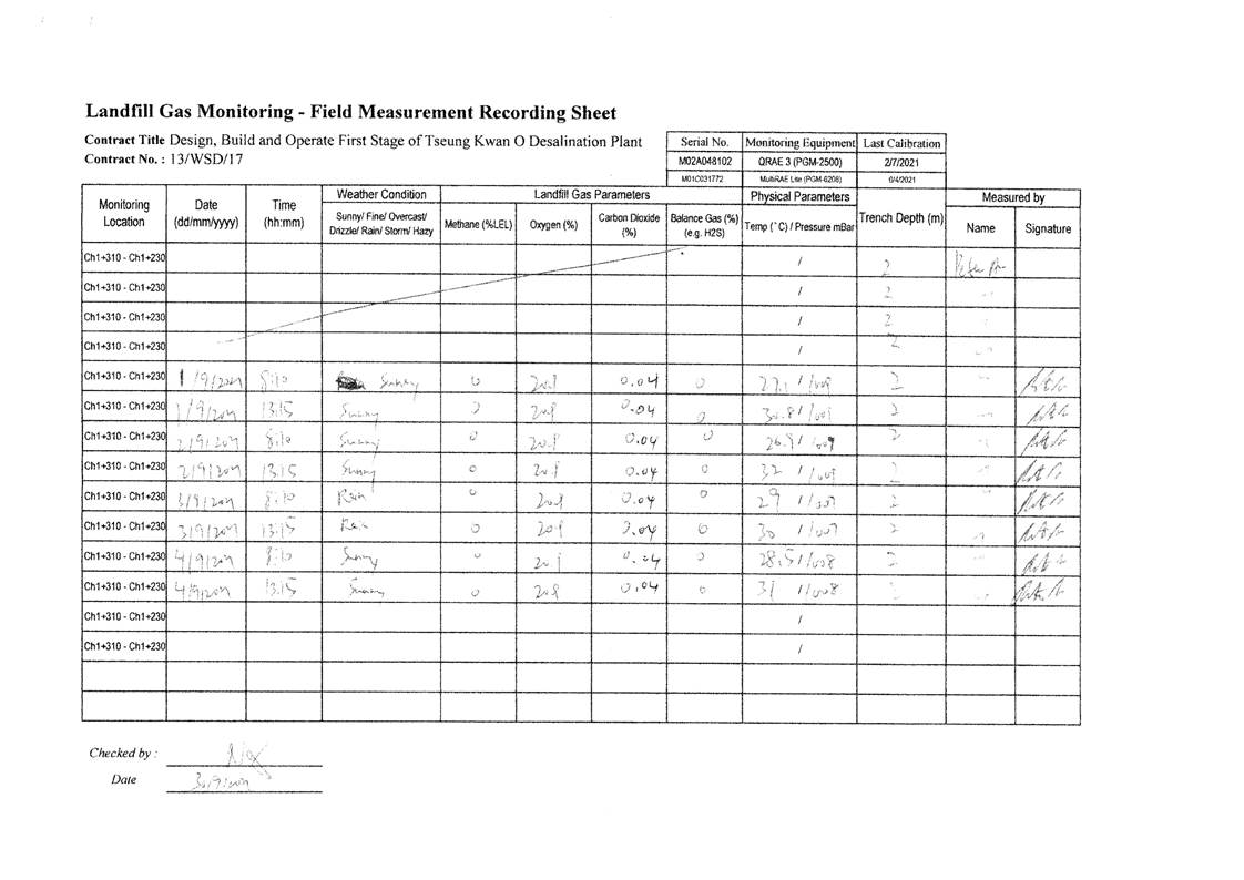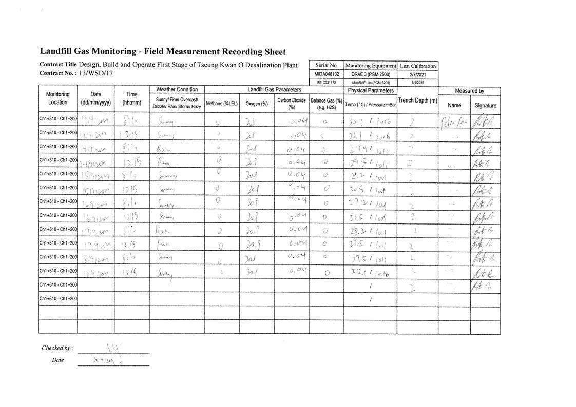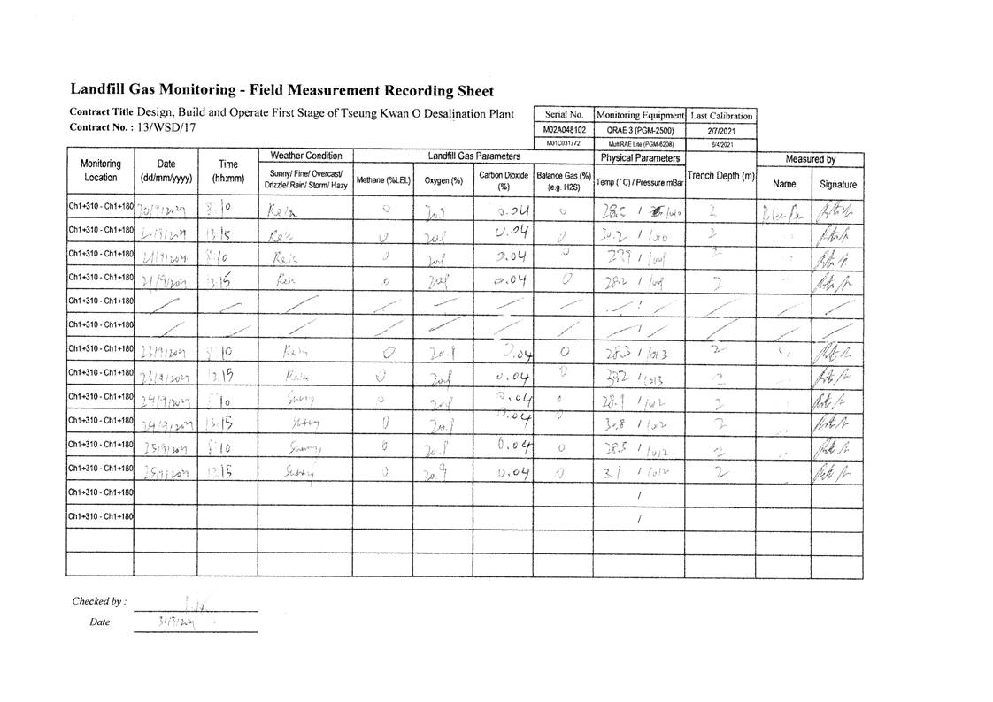 A14. In this reporting period, 50 times of landfill gas monitoring was recorded. No exceedance of action and limit levels for methane, oxygen and carbon dioxide was observed. Monitoring was conducted when excavations at 1m depth or more within the consultation zone were conducted and workers entered the excavation on the day.