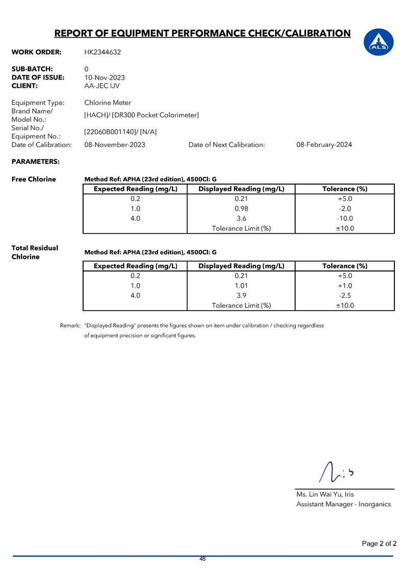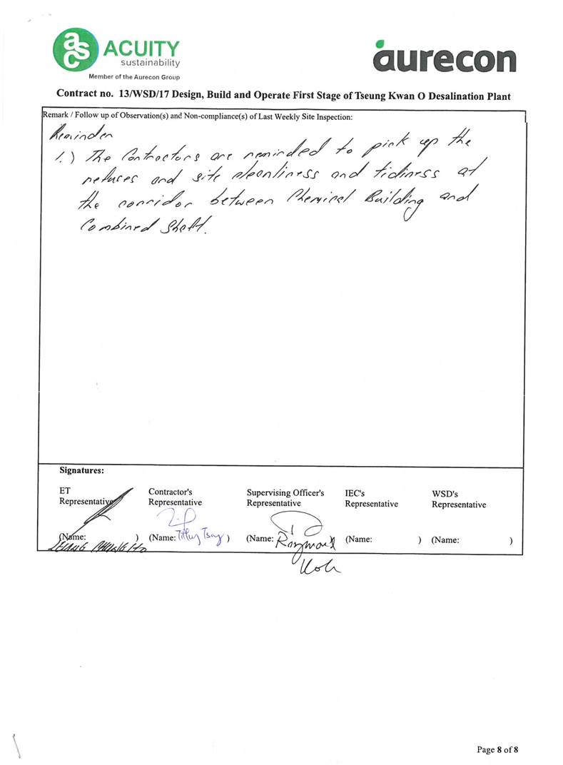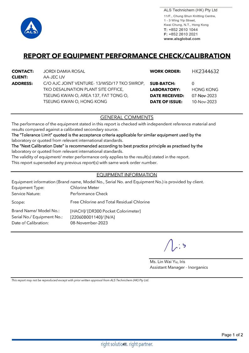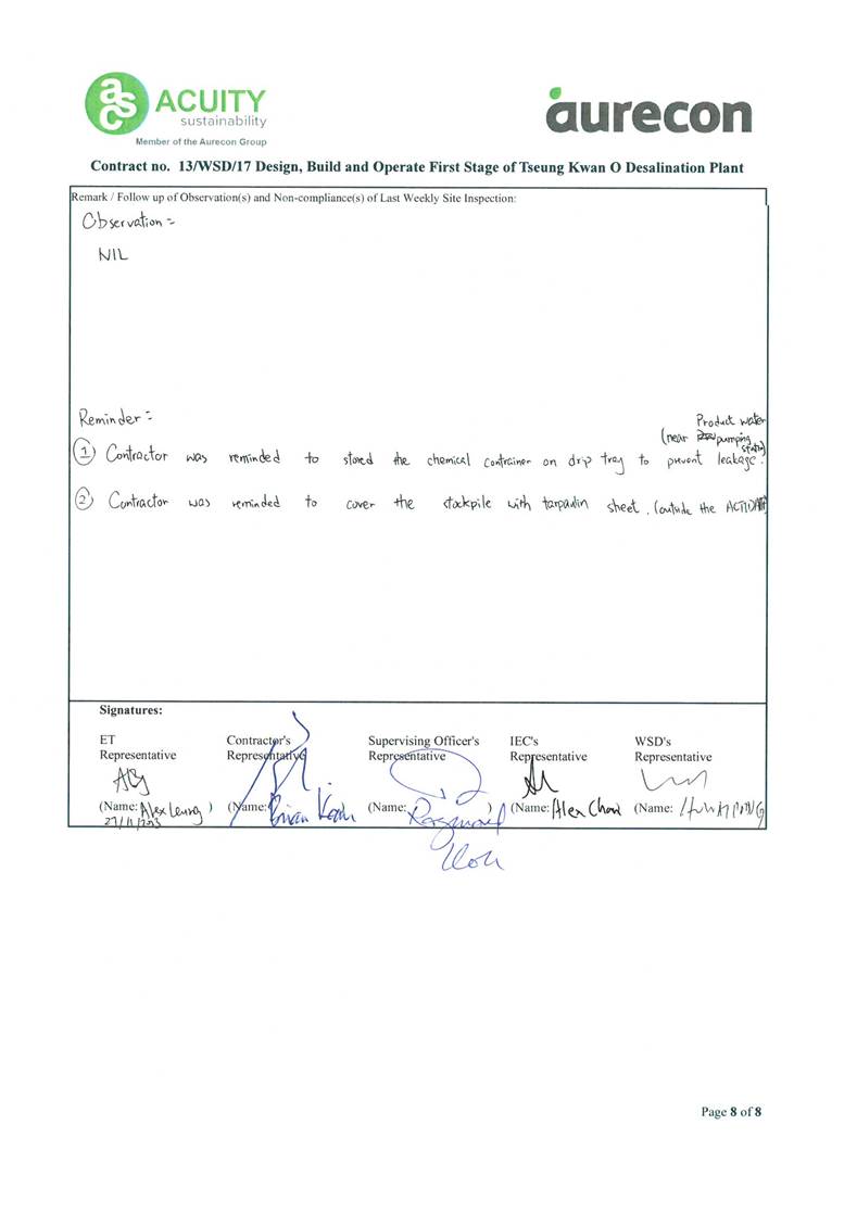 A1. The Project, Design, Build and Operate First Stage of Tseung Kwan O Desalination Plant (TKODP), is a Designated Project under the Environmental Impact Assessment Ordinance (Cap. 499) (EIAO) and is currently governed by a Further Environmental Permit (EP No. FEP - 01/503/2015/A) for the construction and operation of the Contract.