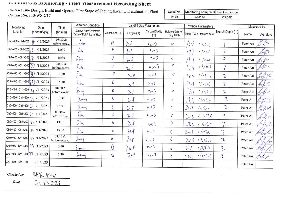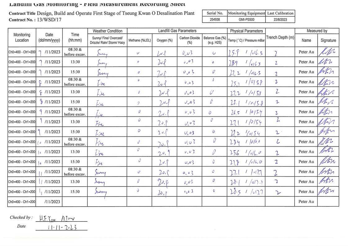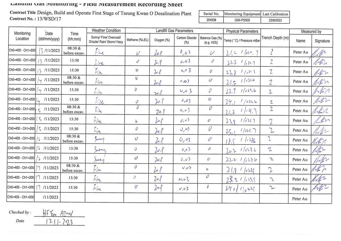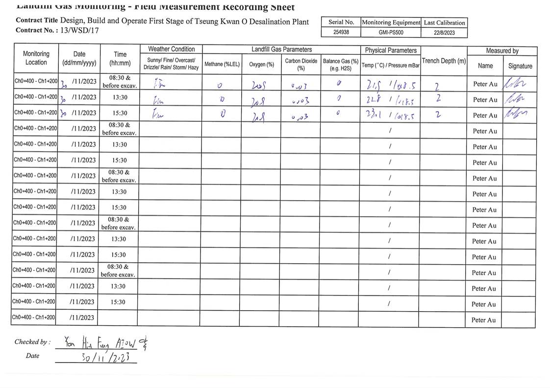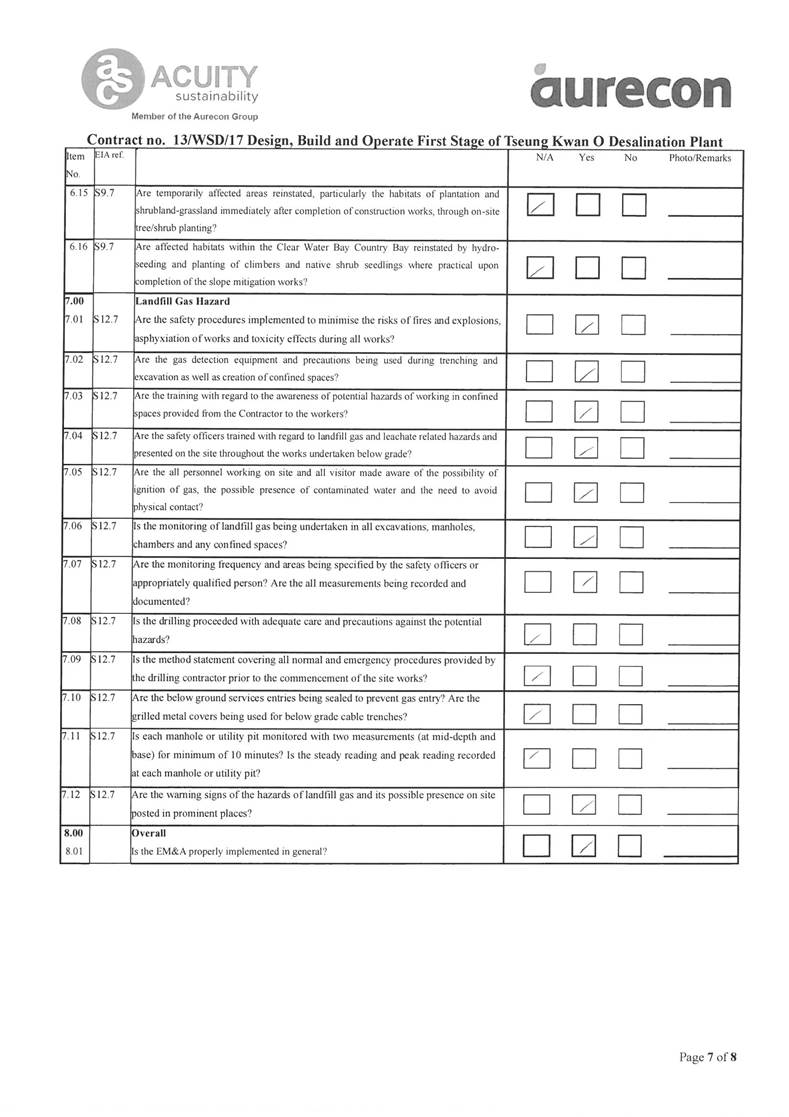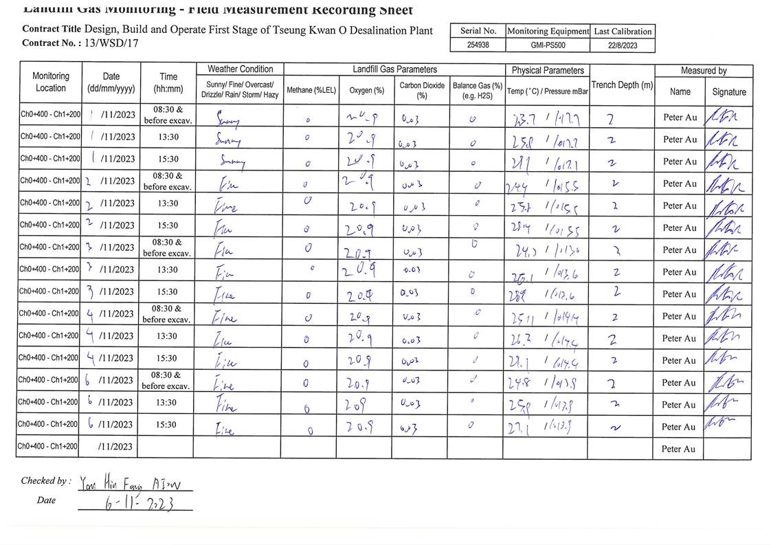 It is recommended regular landfill gas monitoring should be carried out at the Incoming Switchgear Room, 132 kV Substation and Chlorine Store (I) and (II). The monitoring frequency will be monthly for the first year of operation. If the monitoring results show no sign of landfill gas migration, reduce the monitoring frequency to once every six months. |