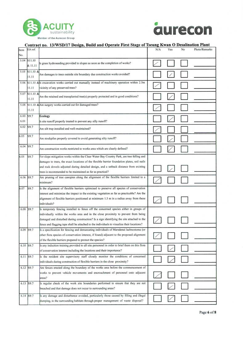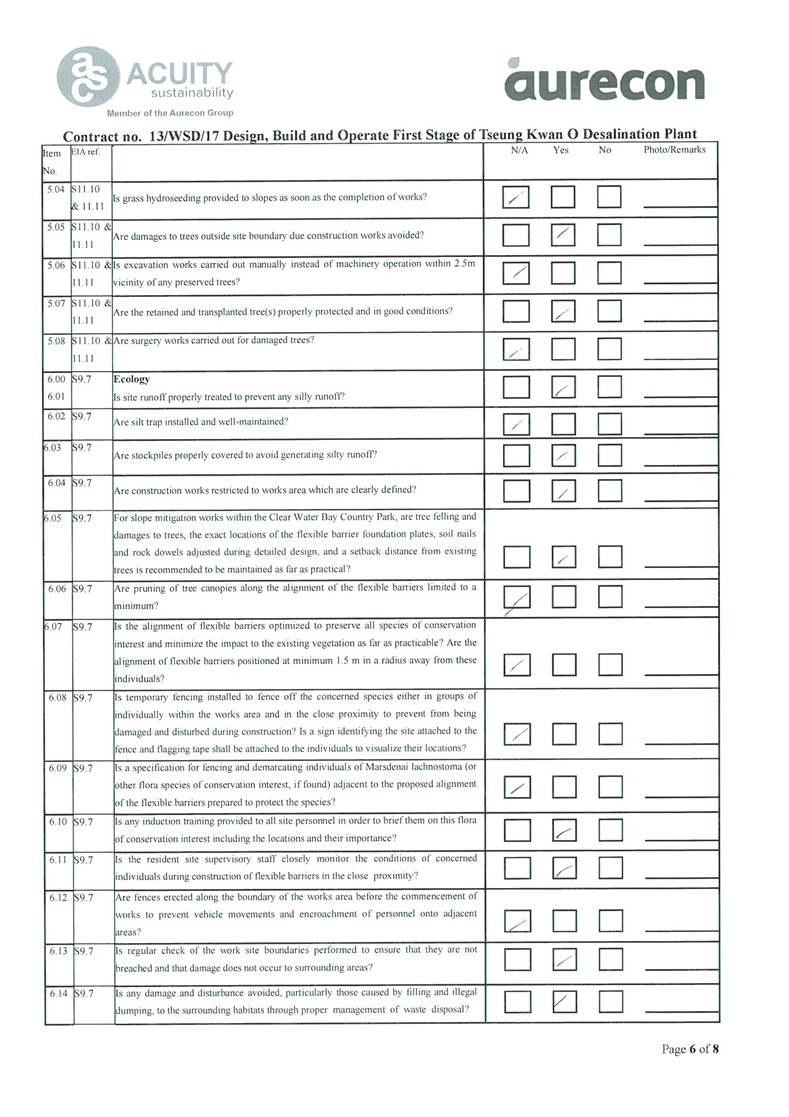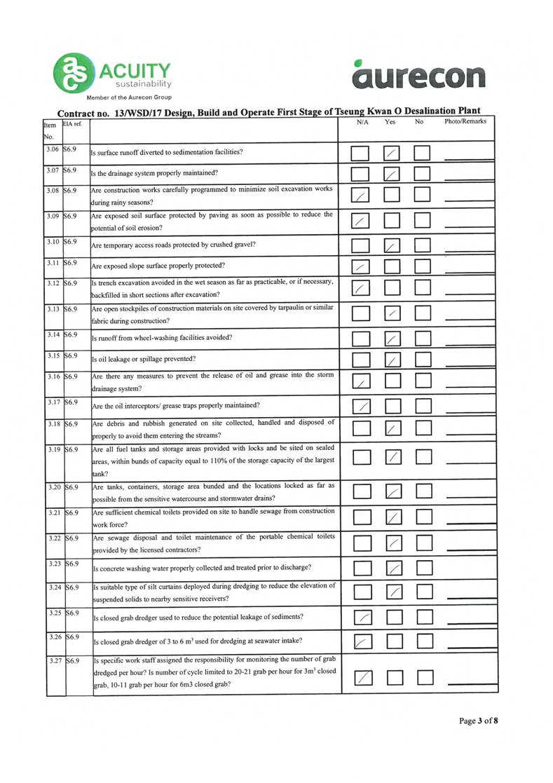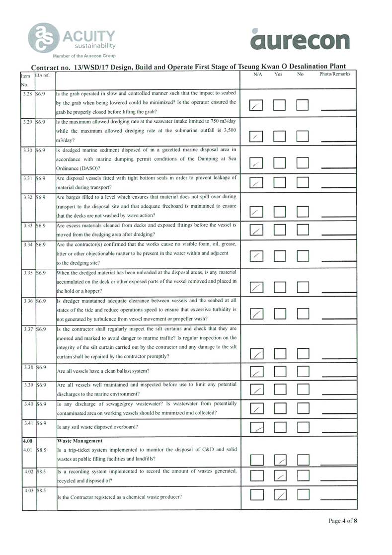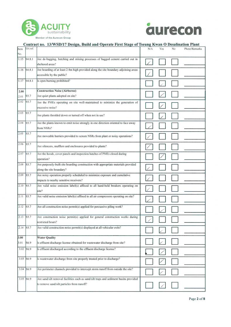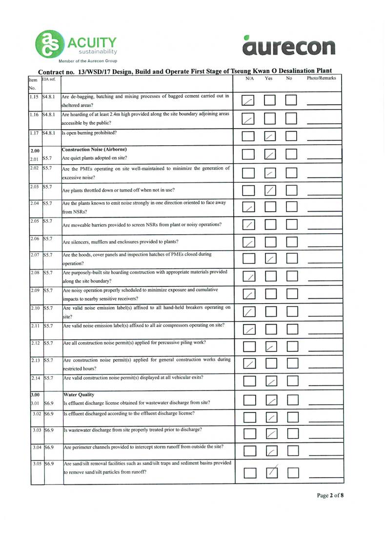 A2. In accordance with the Environmental Monitoring and Audit (EM&A) Manual for the Contract, EM&A works for marine water quality, noise, waste management and ecology should be carried out by Environmental Team (ET), Acuity Sustainability Consulting Limited (ASCL), during the construction phase of the Contract.