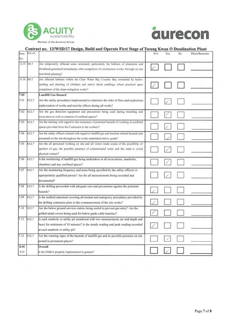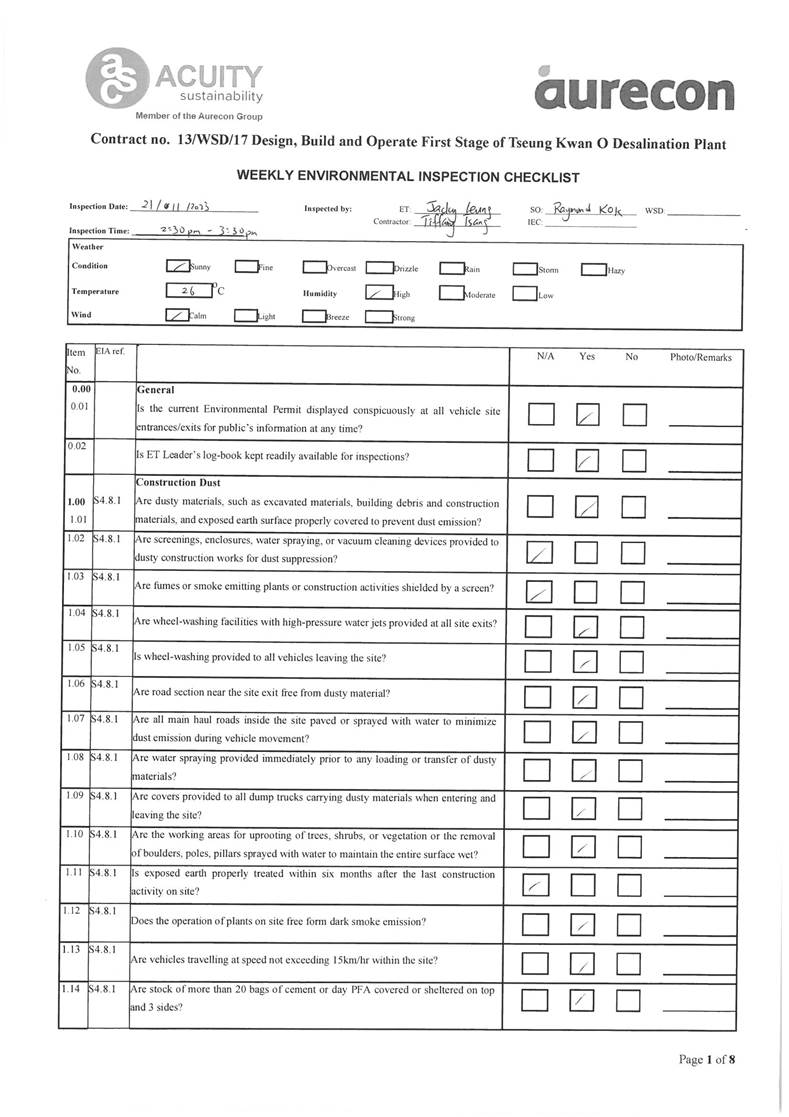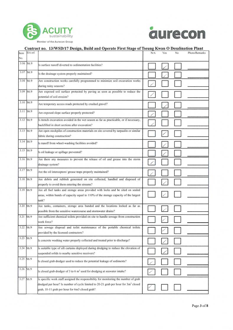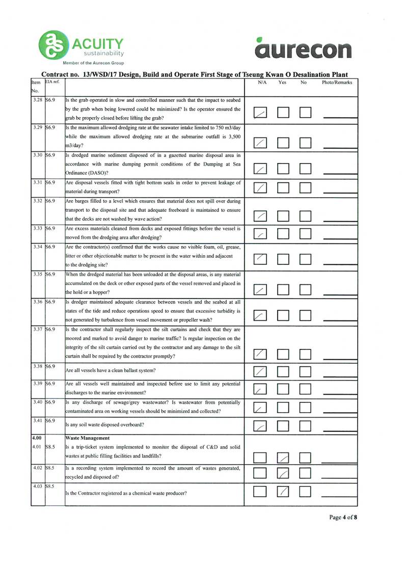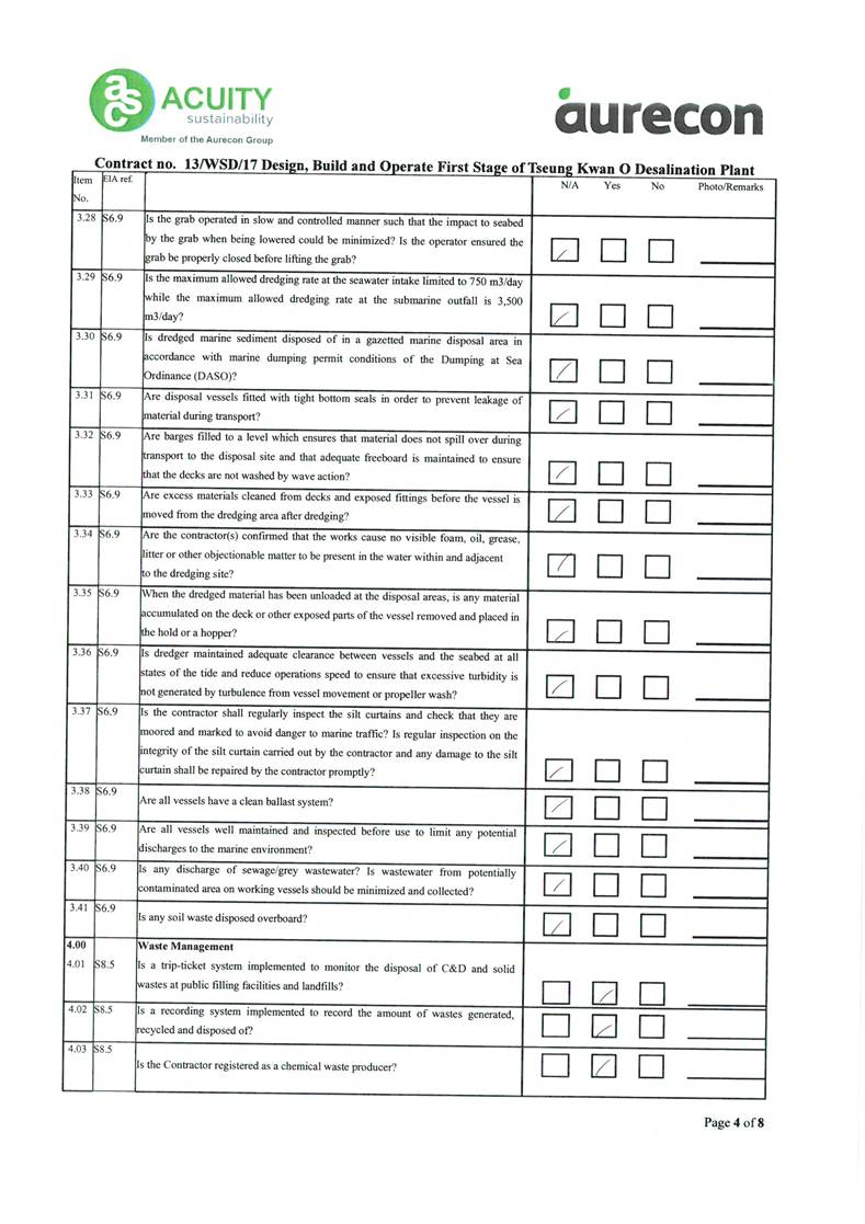 A2. In accordance with the Environmental Monitoring and Audit (EM&A) Manual for the Contract, EM&A works for marine water quality, noise, waste management and ecology should be carried out by Environmental Team (ET), Acuity Sustainability Consulting Limited (ASCL), during the construction phase of the Contract.