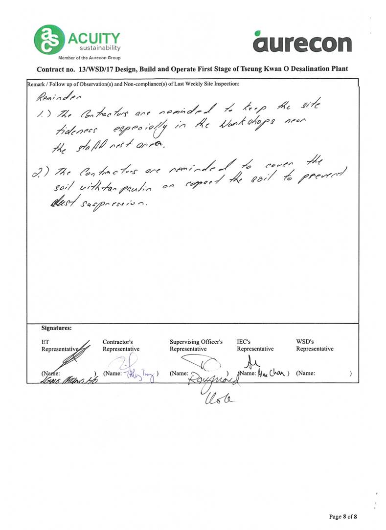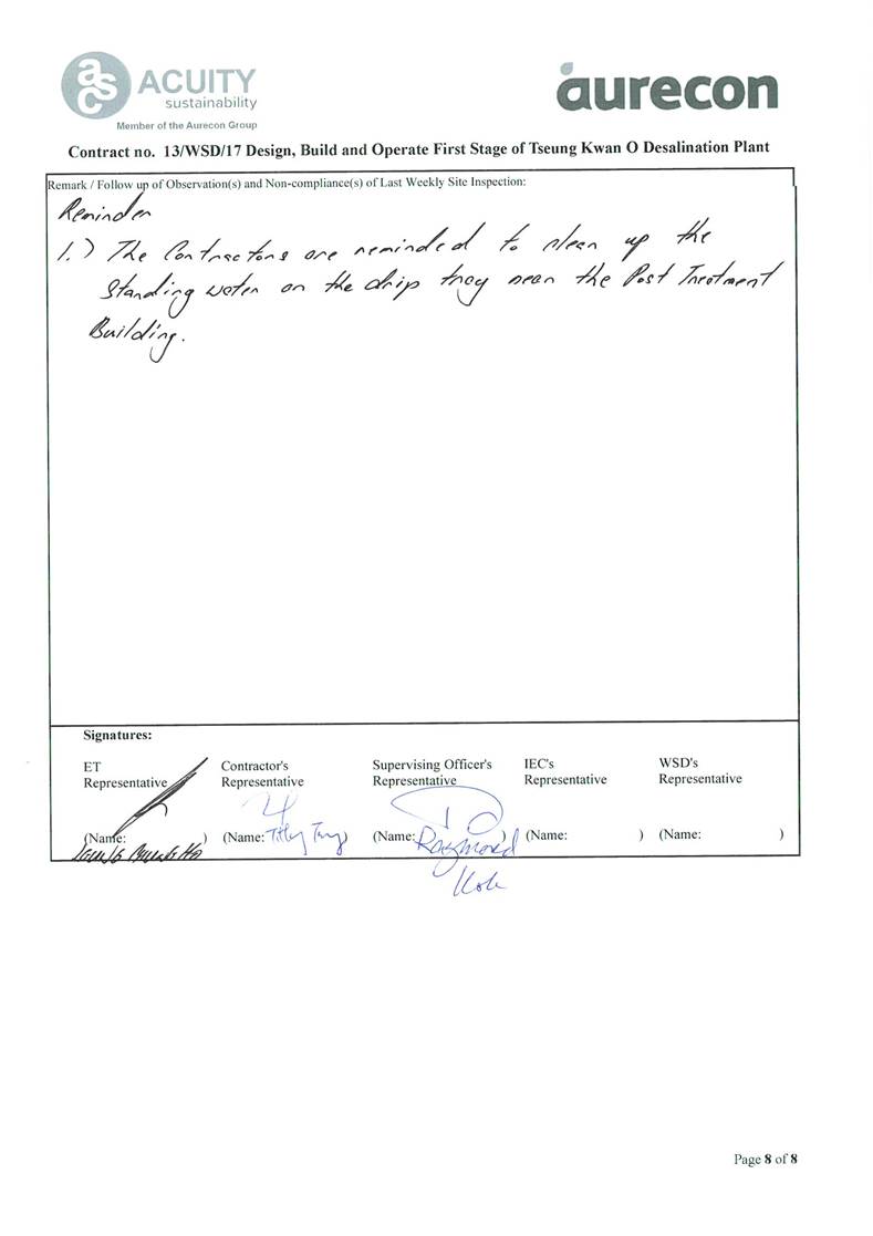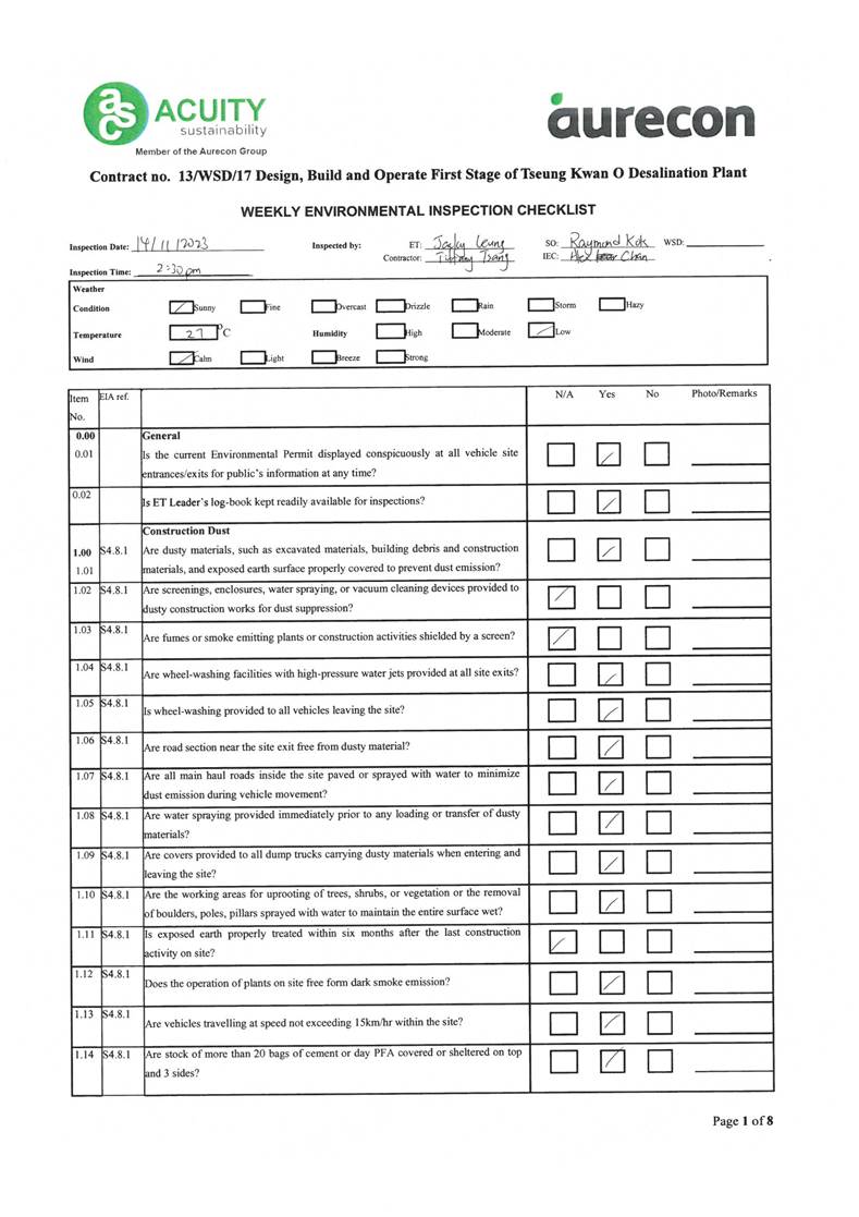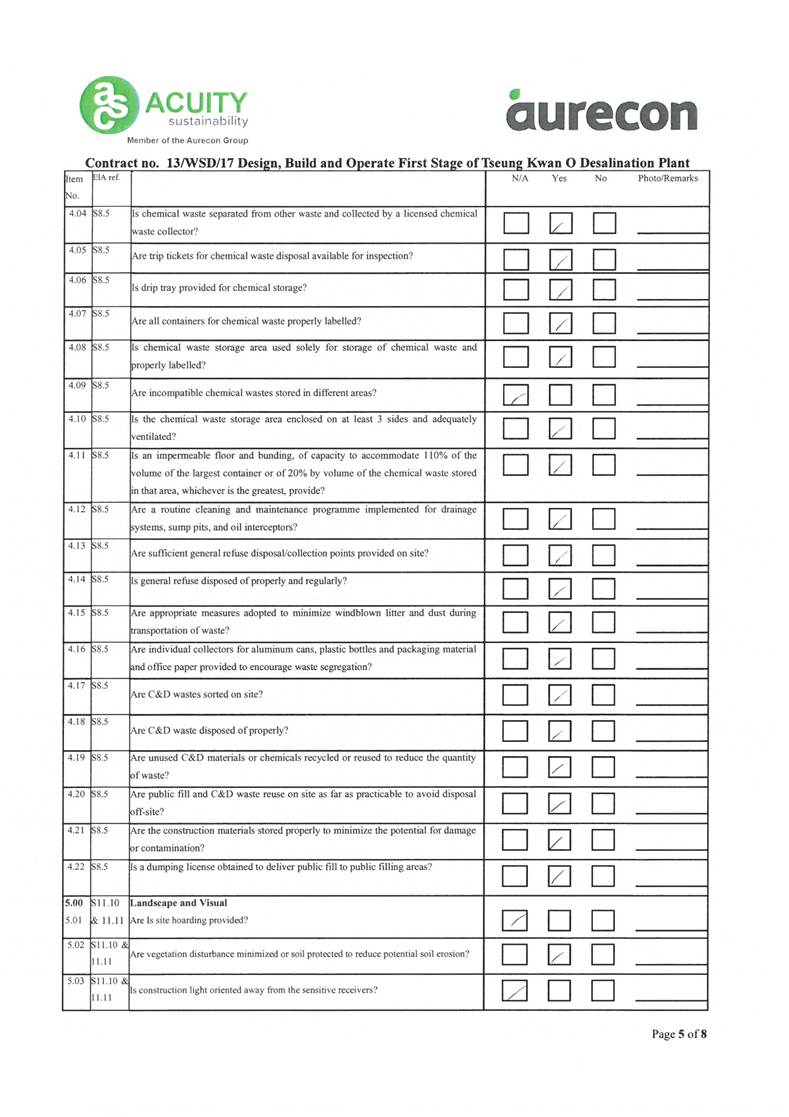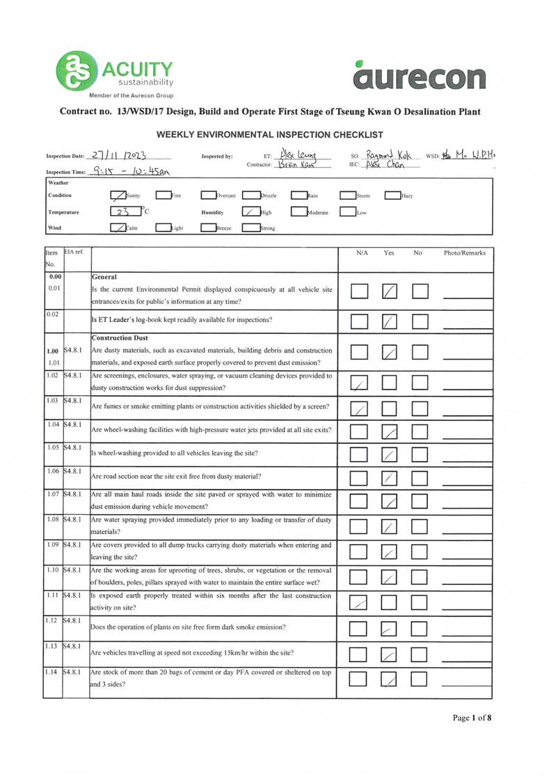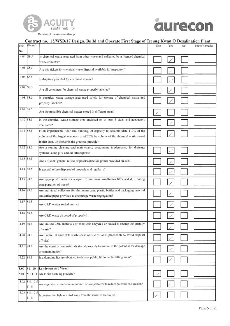 A2. In accordance with the Environmental Monitoring and Audit (EM&A) Manual for the Contract, EM&A works for marine water quality, noise, waste management and ecology should be carried out by Environmental Team (ET), Acuity Sustainability Consulting Limited (ASCL), during the construction phase of the Contract.