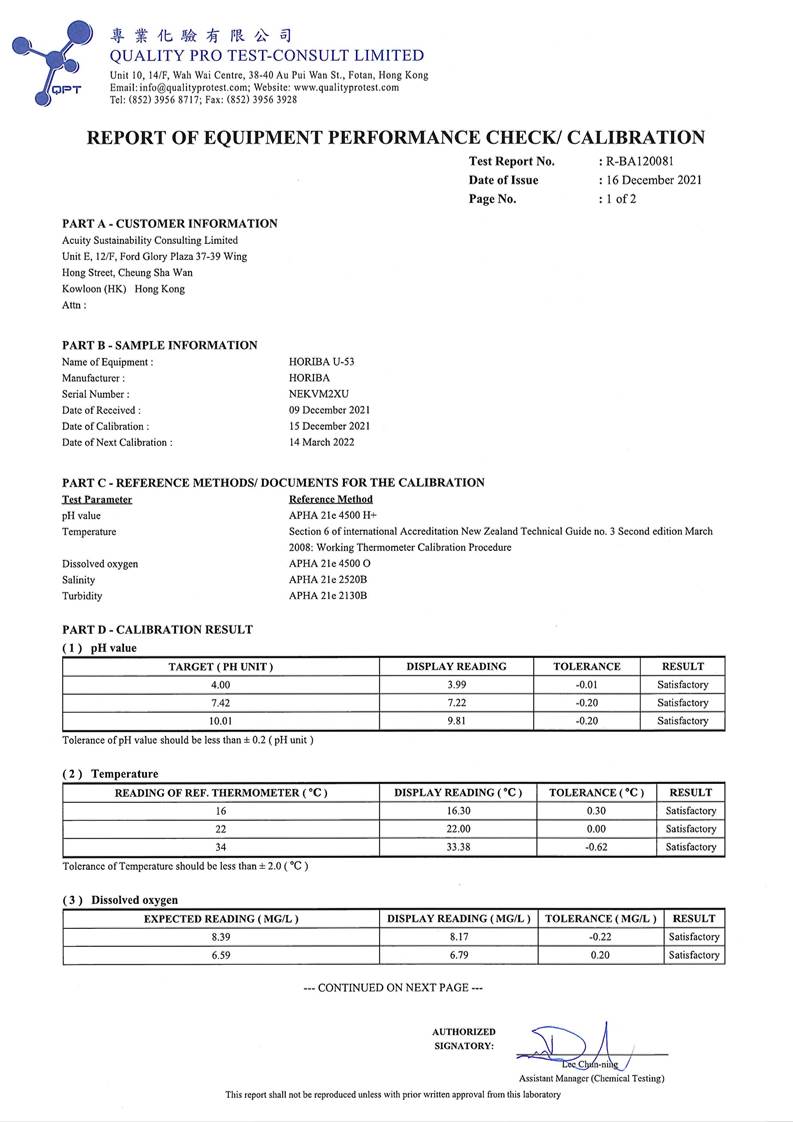 Water Quality and Landfill Gas Equipment Calibration Certificate