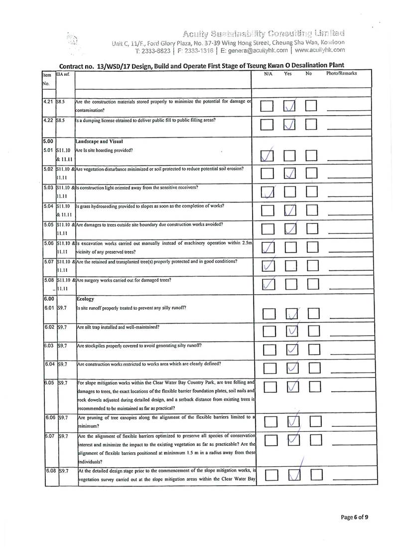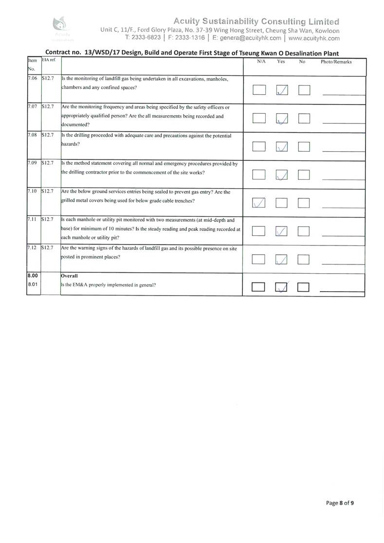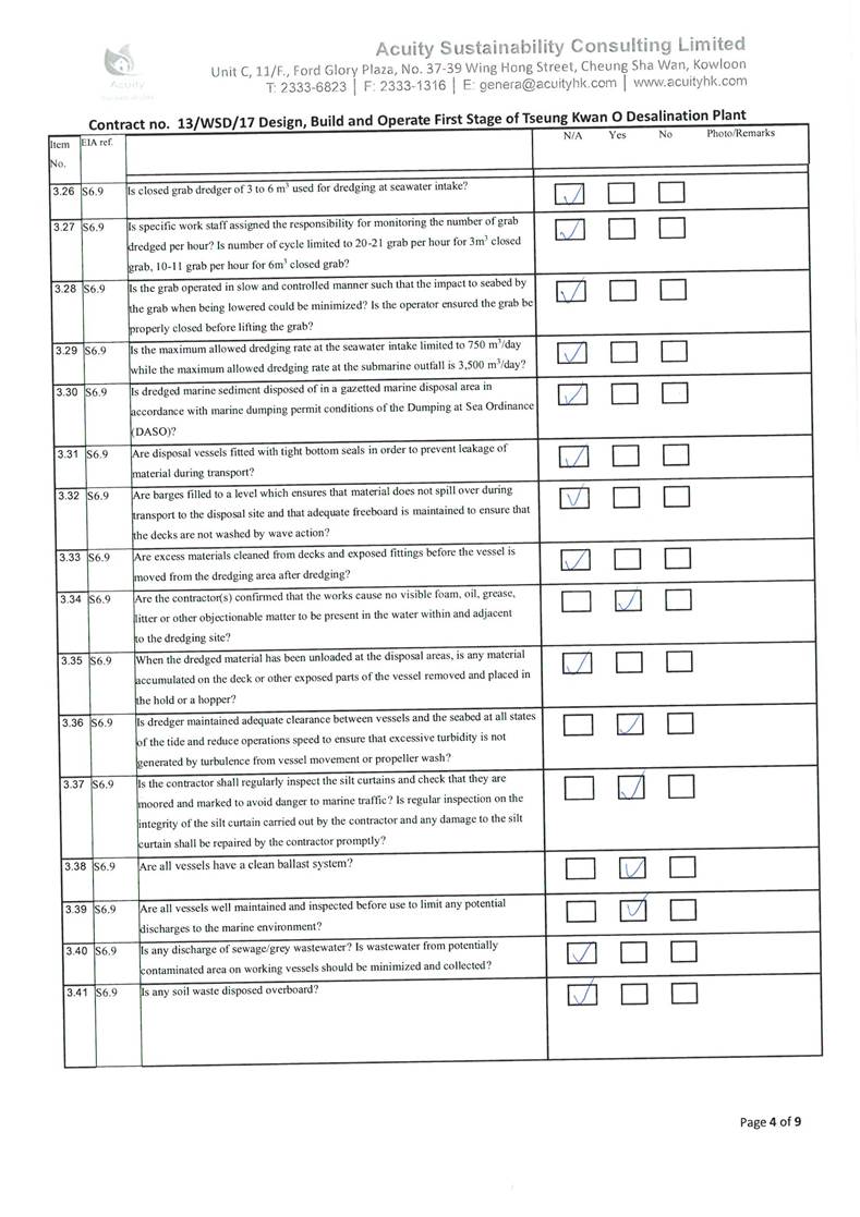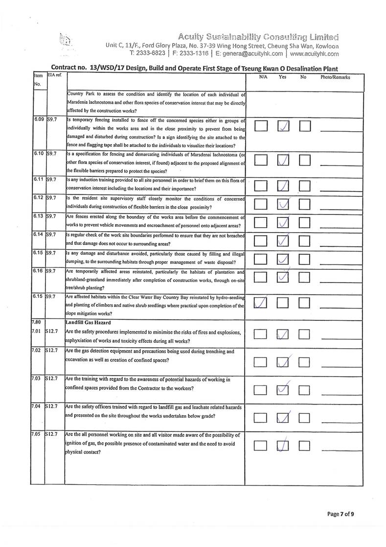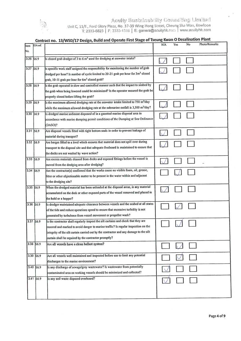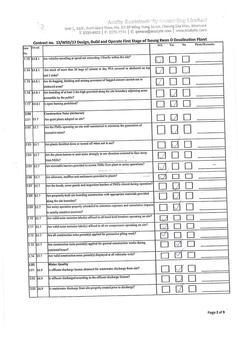 A2. In accordance with the Environmental Monitoring and Audit (EM&A) Manual for the Contract, EM&A works for marine water quality, noise, waste management and ecology should be carried out by Environmental Team (ET), Acuity Sustainability Consulting Limited (ASCL), during the construction phase of the Contract.