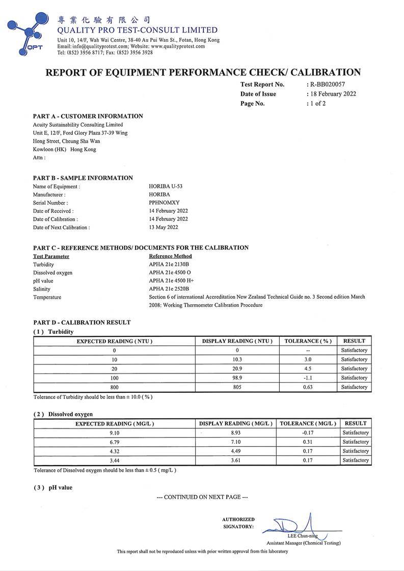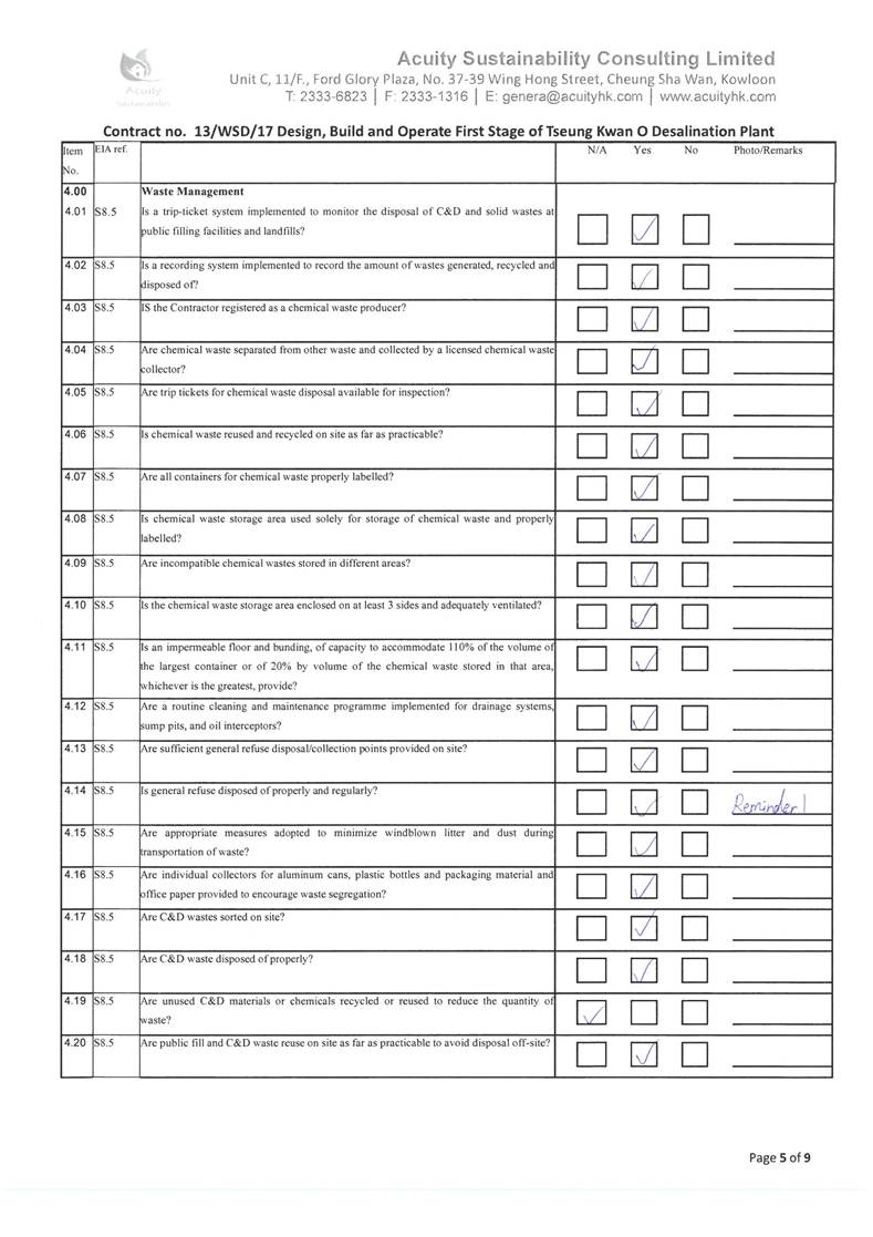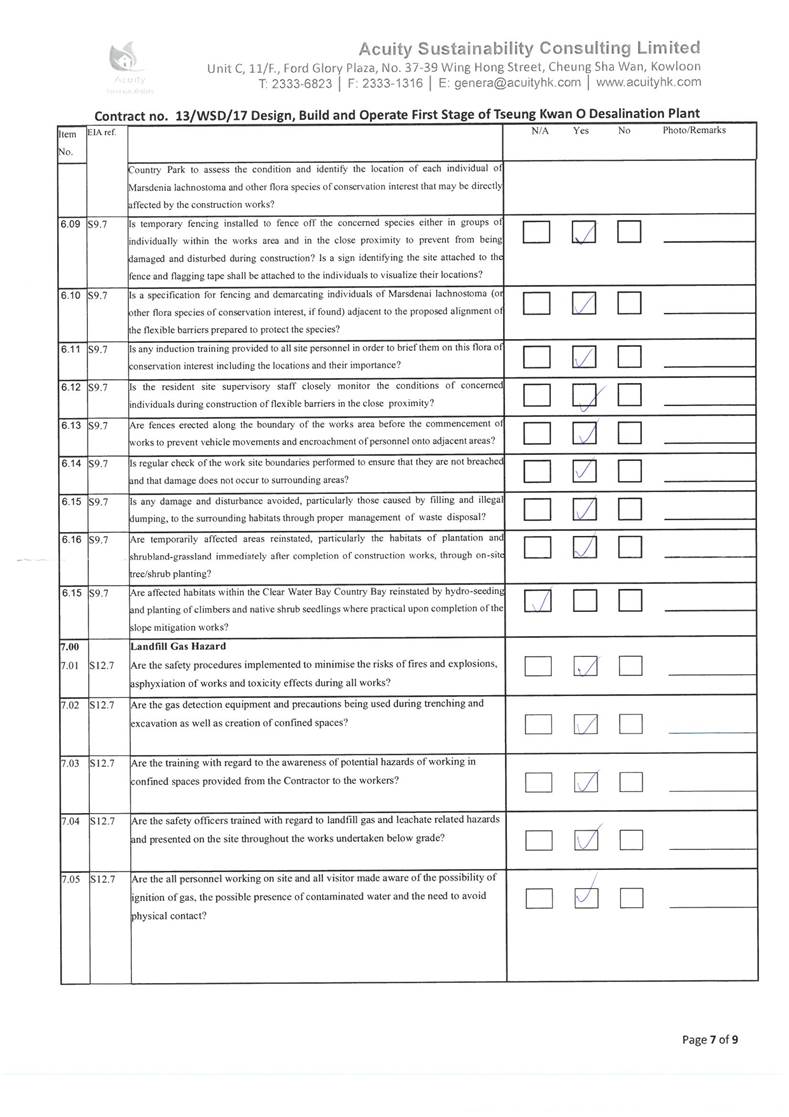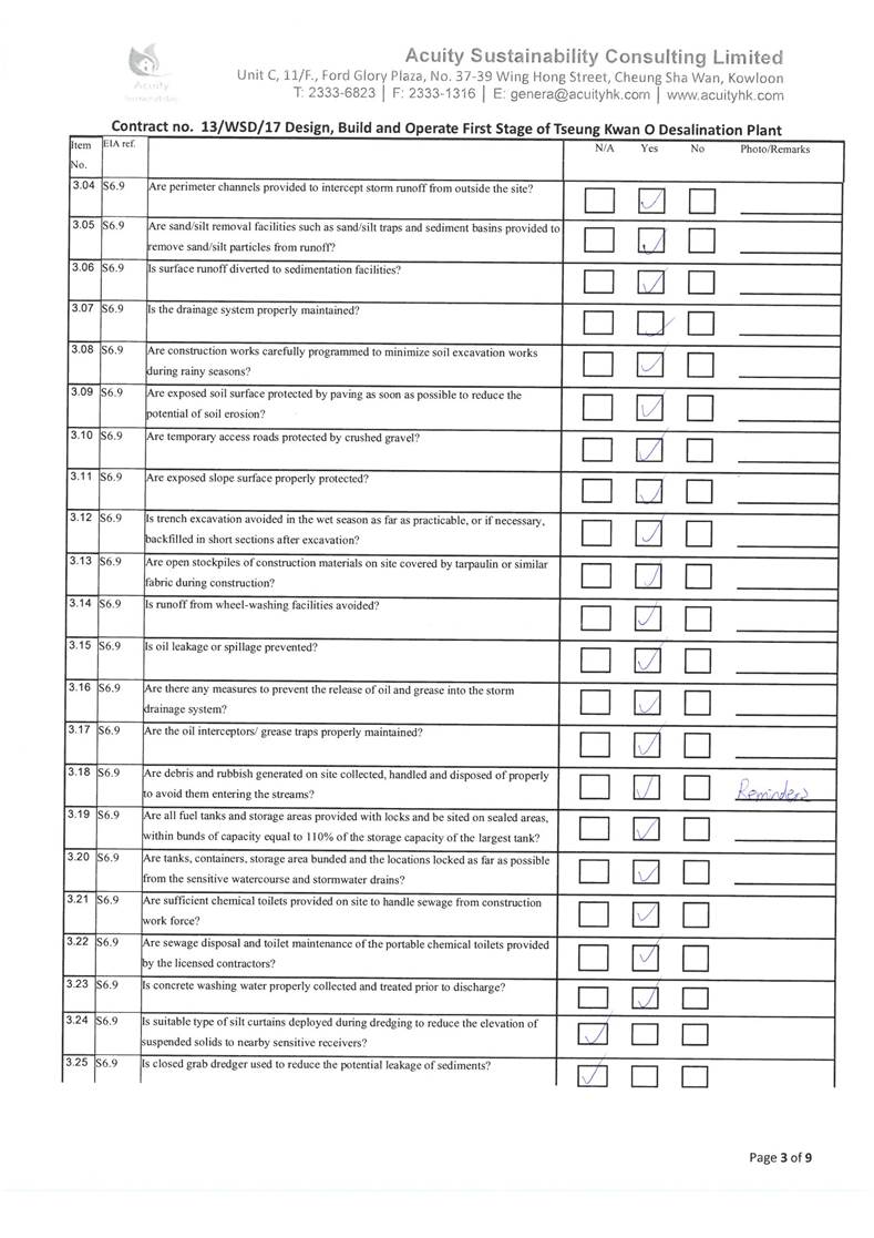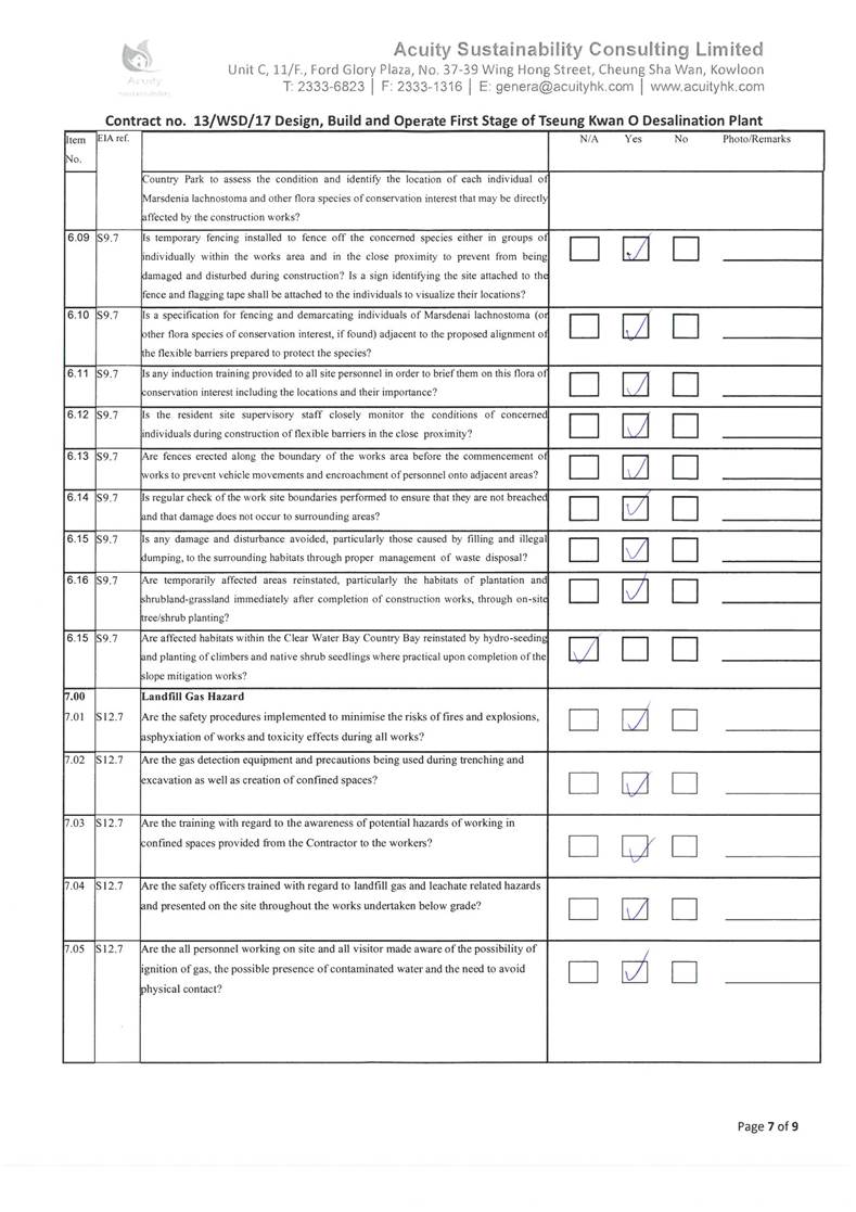 A2. In accordance with the Environmental Monitoring and Audit (EM&A) Manual for the Contract, EM&A works for marine water quality, noise, waste management and ecology should be carried out by Environmental Team (ET), Acuity Sustainability Consulting Limited (ASCL), during the construction phase of the Contract.