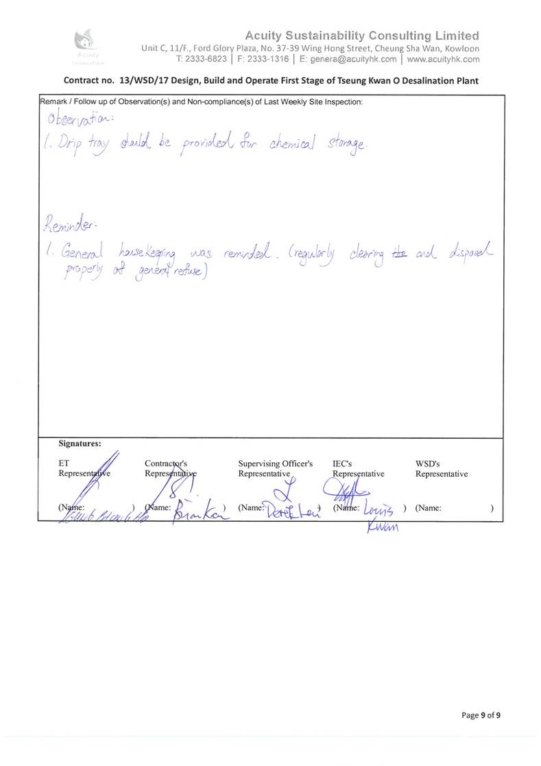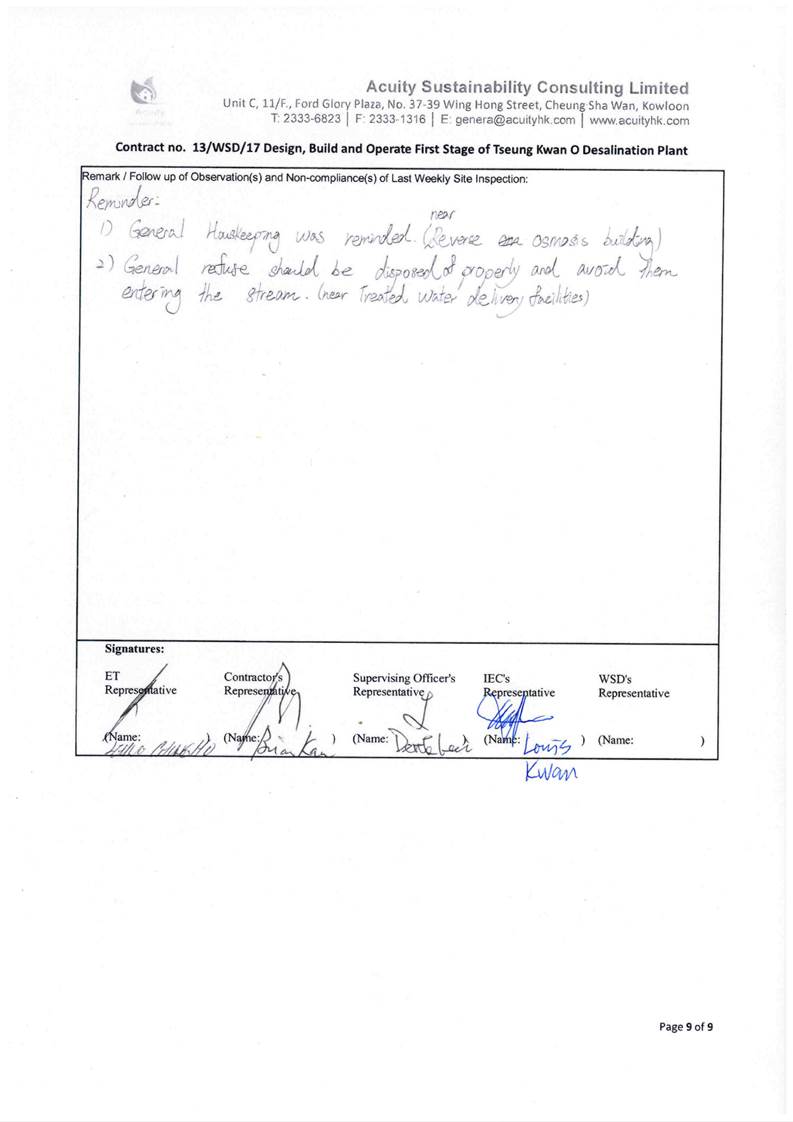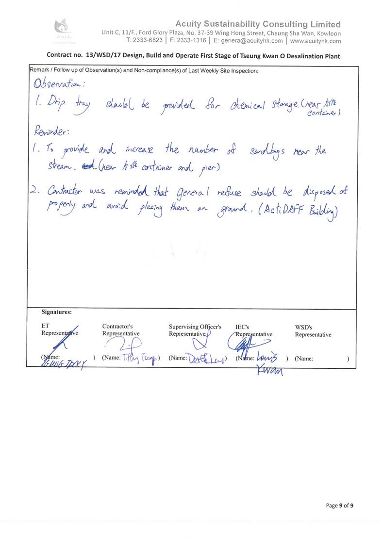 A9. The EM&A works for water quality were conducted during the reporting period in accordance with the EM&A Manual.