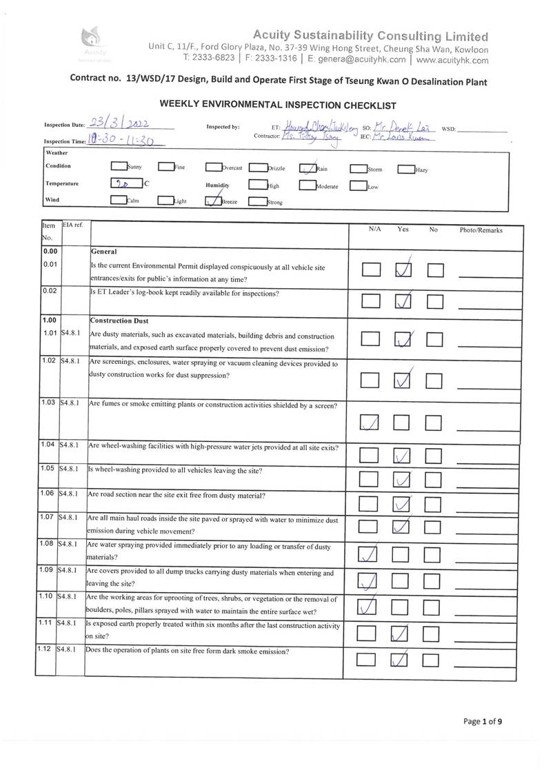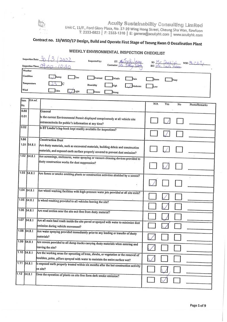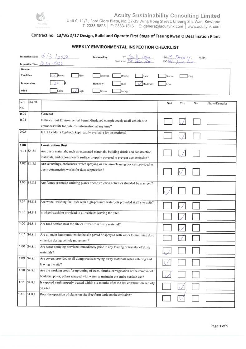 A15. Joint site inspections of the construction work by ET and IEC were carried out on 8, 15, 23 and 30 March 2022 to audit the mitigation measures implementation status. Observations and recommendations were recorded in the site inspection checklists and provided to the contractors together with the appropriate follow-up actions where necessary.