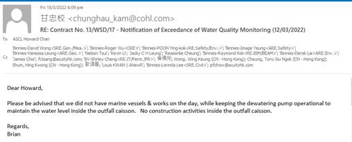 dewatering of unpolluted seawater inside the outfall caisson. Hence the SS exceedances