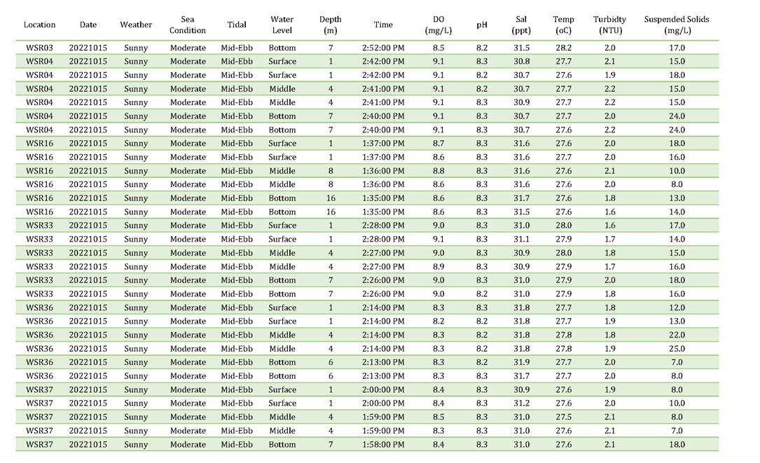 A2. In accordance with the Environmental Monitoring and Audit (EM&A) Manual for the Contract, EM&A works for marine water quality, noise, waste management and ecology should be carried out by Environmental Team (ET), Acuity Sustainability Consulting Limited (ASCL), during the construction phase of the Contract.