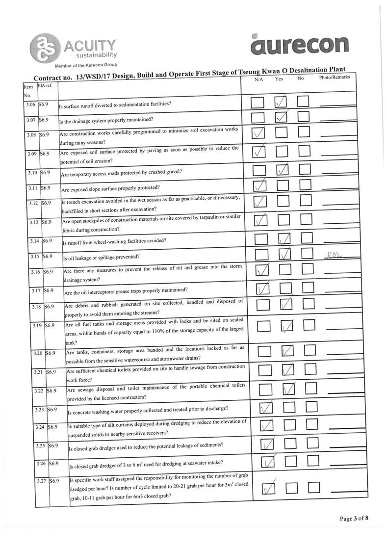 - Impact on water quality from marine construction works and inland construction works.