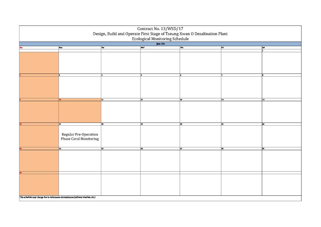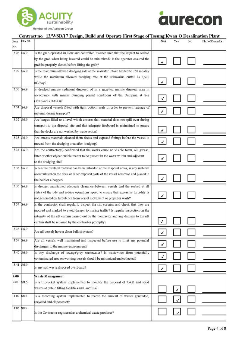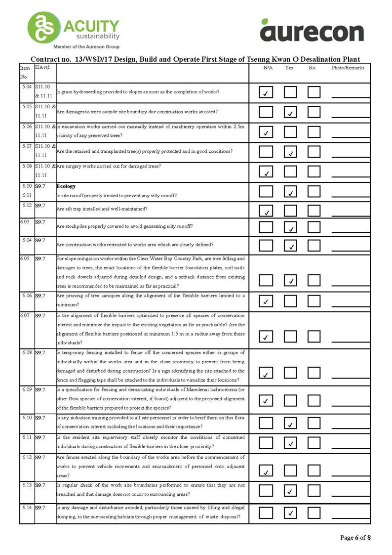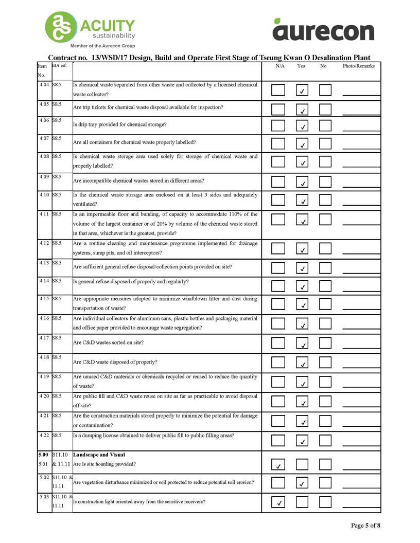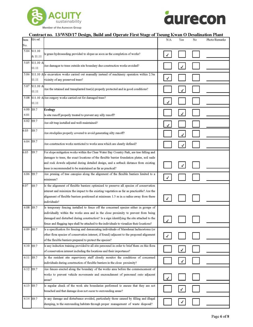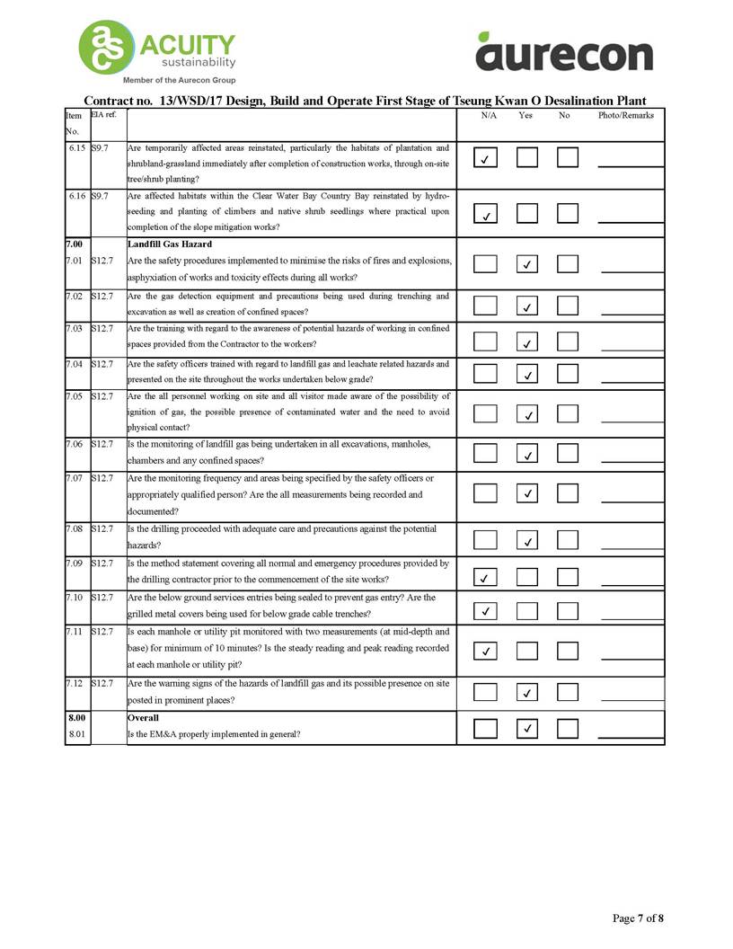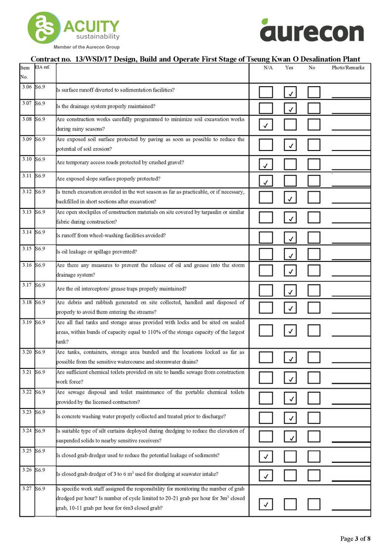 A2. In accordance with the Environmental Monitoring and Audit (EM&A) Manual for the Contract, EM&A works for marine water quality, noise, waste management and ecology should be carried out by Environmental Team (ET), Acuity Sustainability Consulting Limited (ASCL), during the construction phase of the Contract.
