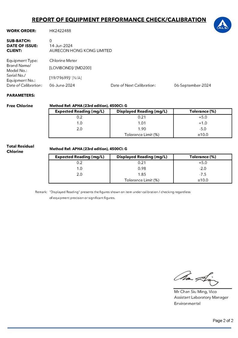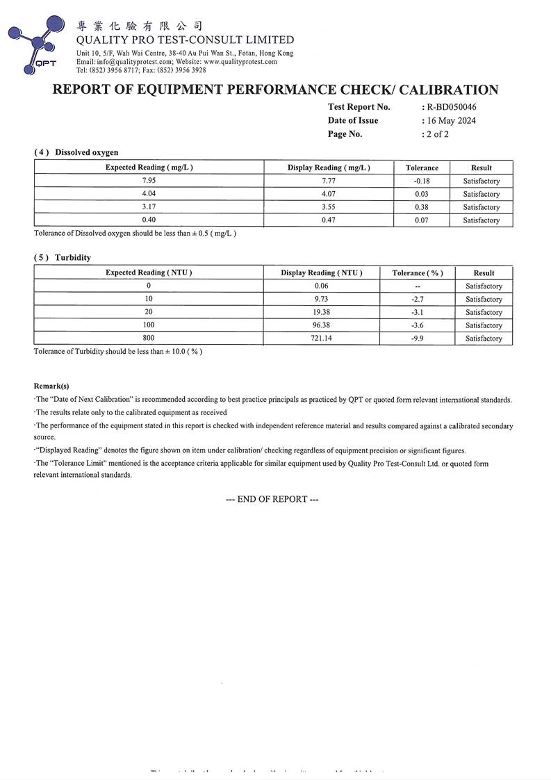 Water Quality Monitoring Equipment and Landfill Gas Equipment Calibration Certificate |