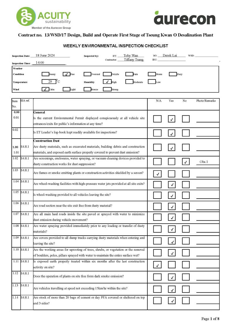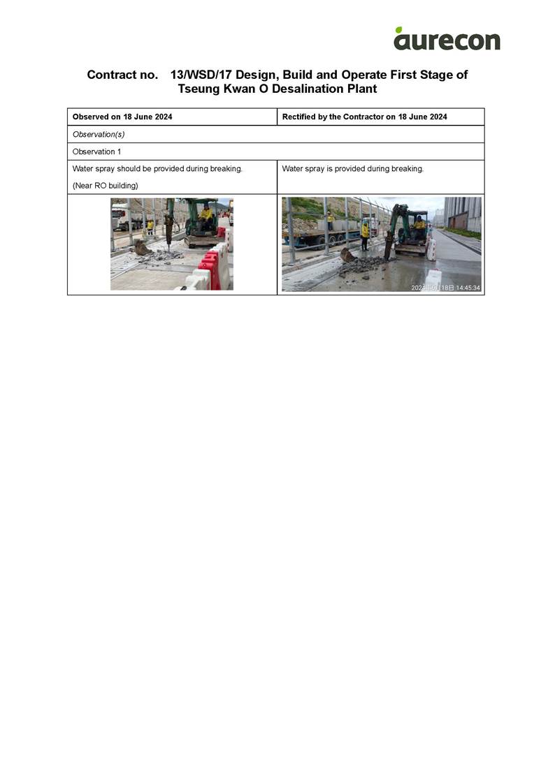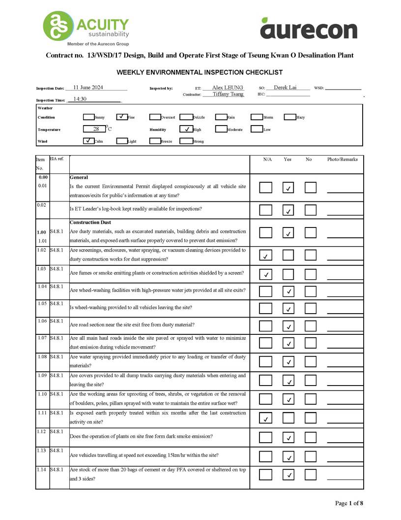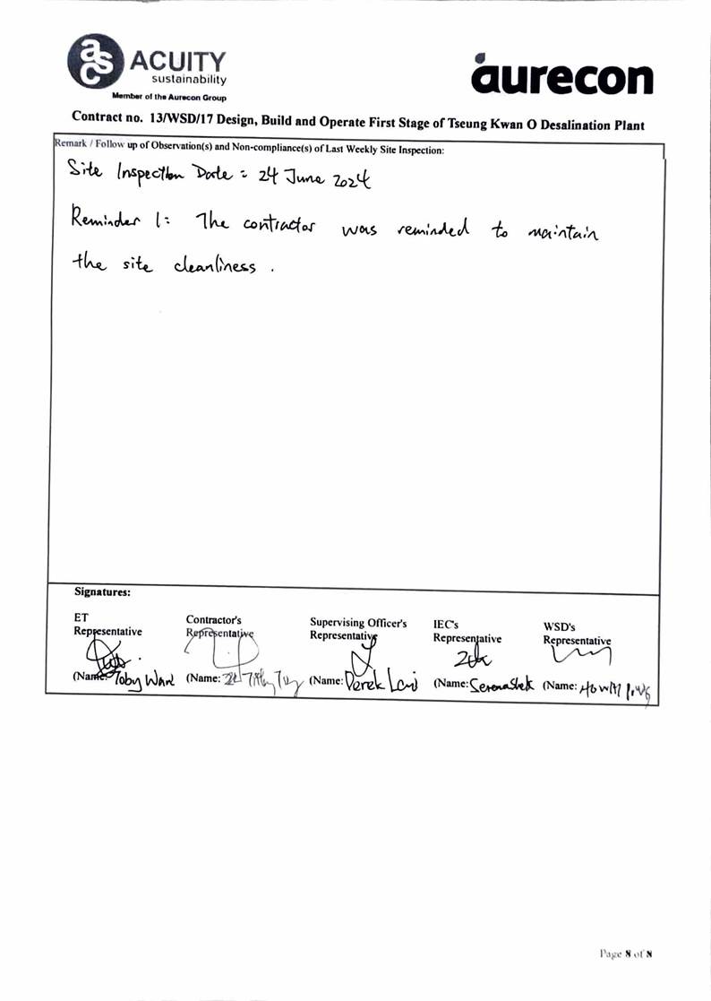 A15. Joint site inspections of the construction work by ET and IEC were carried out on 24 June 2024 to audit the mitigation measures implementation status. Reminders were recorded in the site inspection checklists and provided to the contractors together with the appropriate follow-up actions where necessary.