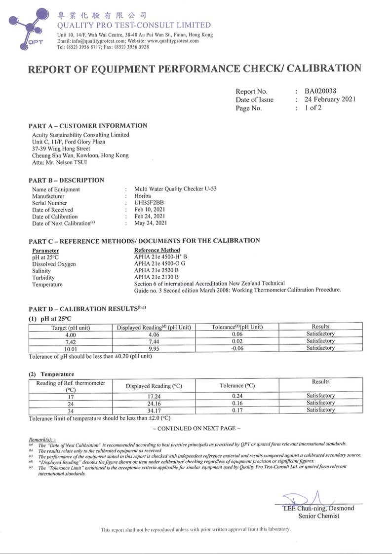 A2. In accordance with the Environmental Monitoring and Audit (EM&A) Manual for the Project, EM&A works for marine water quality, noise, waste management and ecology should be carried out by Environmental Team (ET), Acuity Sustainability Consulting Limited (ASCL), during the construction phase of the Project.