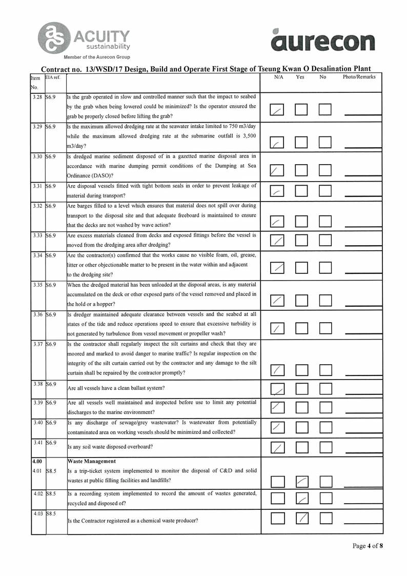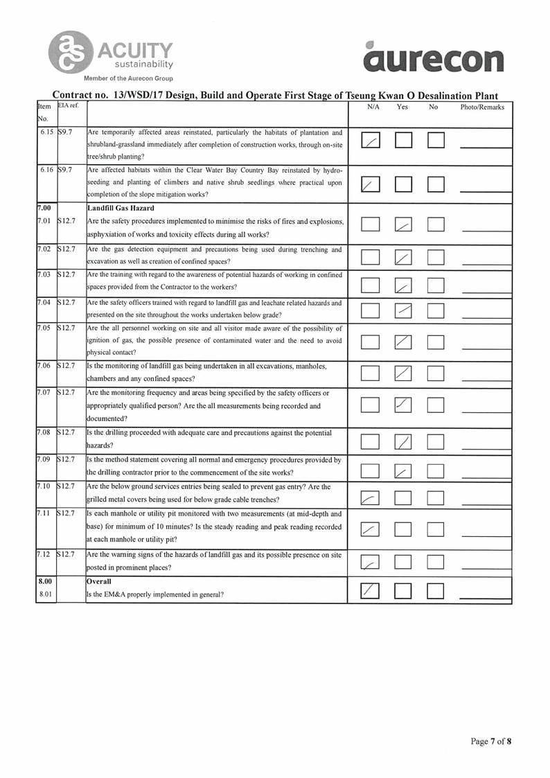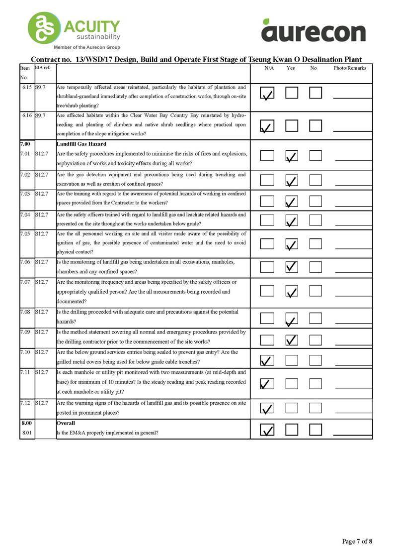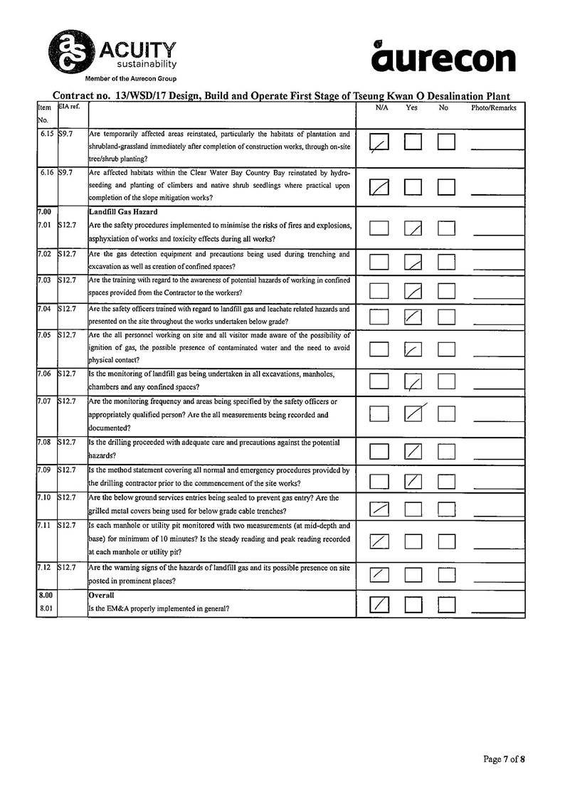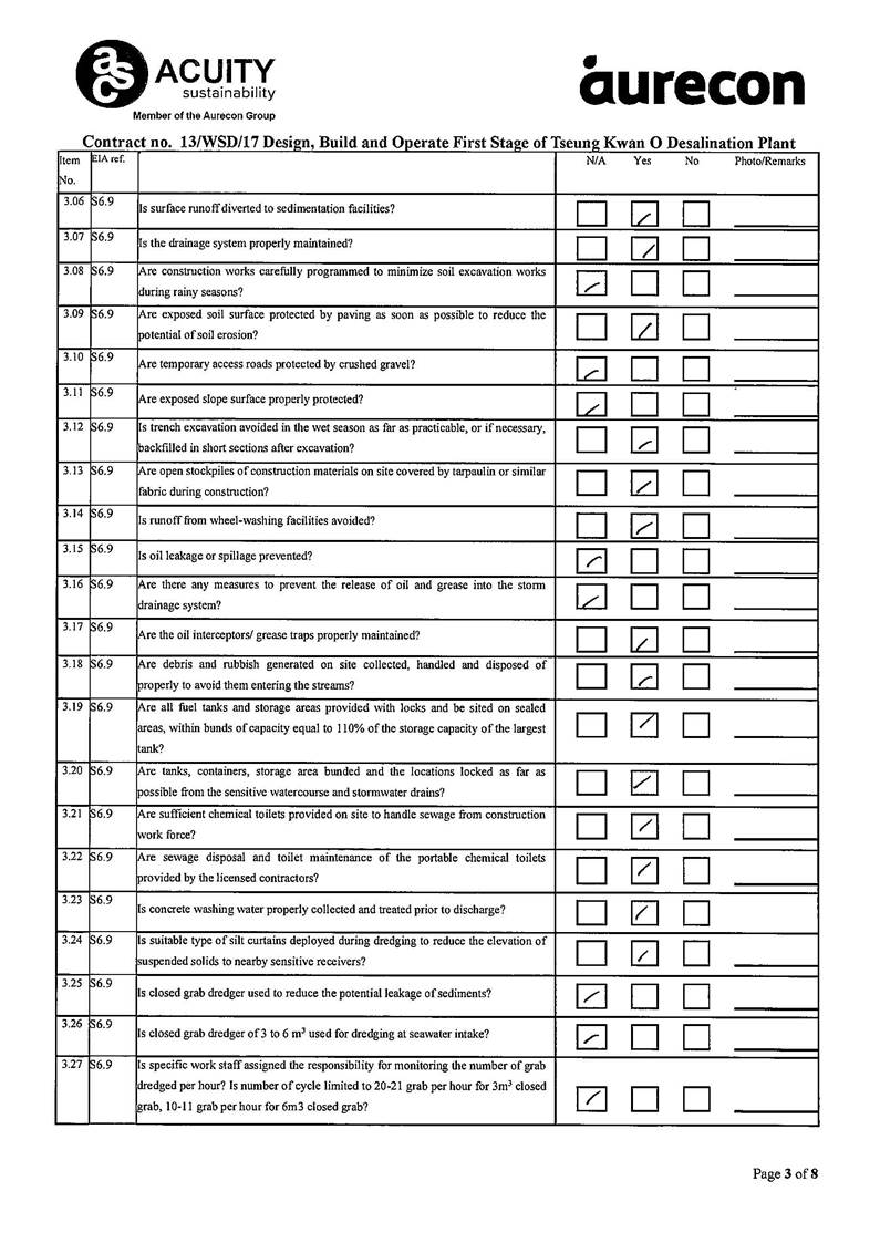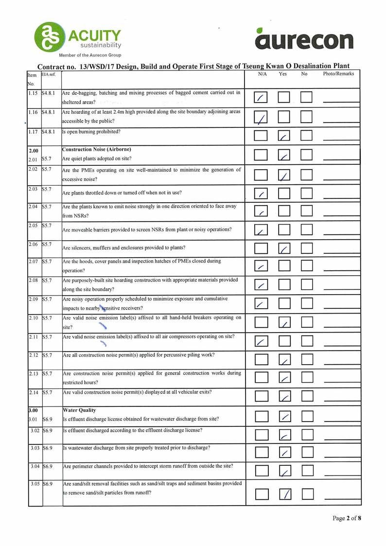 A2. In accordance with the Environmental Monitoring and Audit (EM&A) Manual for the Contract, EM&A works for marine water quality, noise, waste management and ecology should be carried out by Environmental Team (ET), Acuity Sustainability Consulting Limited (ASCL), during the construction phase of the Contract.