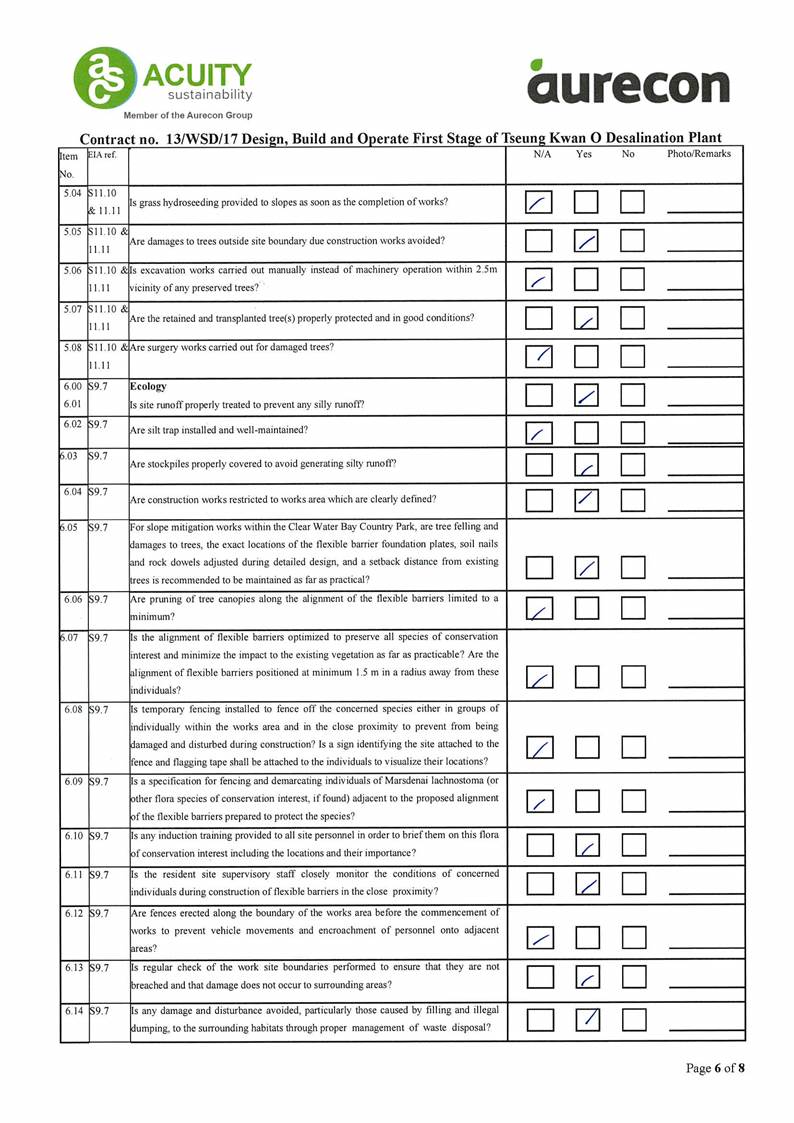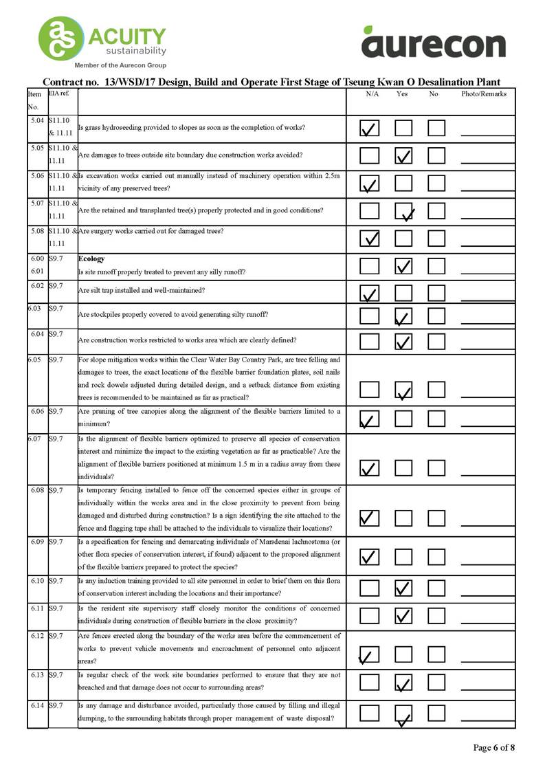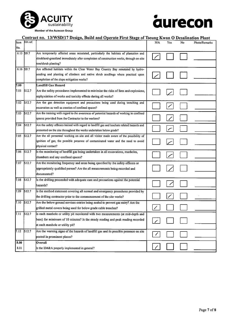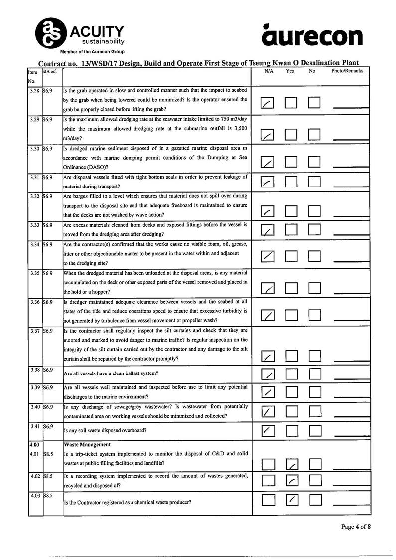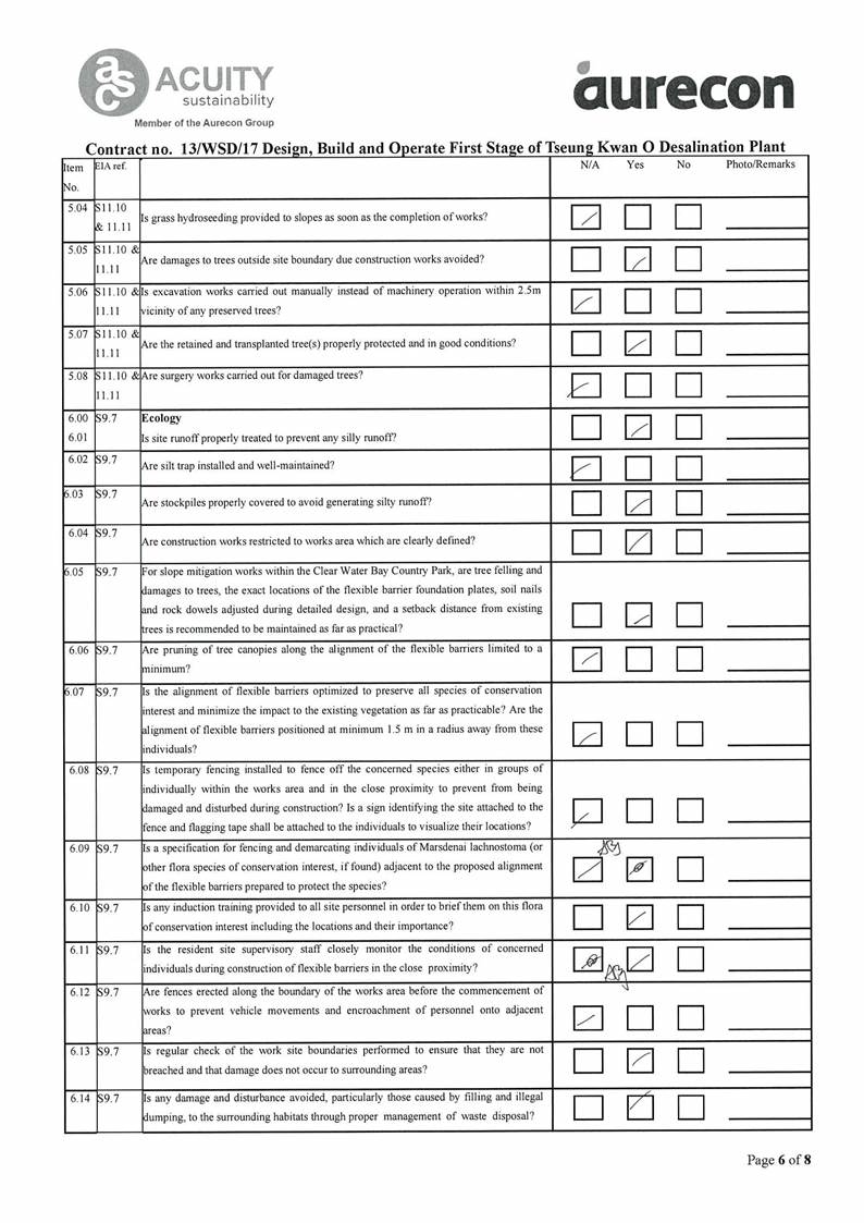 A2. In accordance with the Environmental Monitoring and Audit (EM&A) Manual for the Contract, EM&A works for marine water quality, noise, waste management and ecology should be carried out by Environmental Team (ET), Acuity Sustainability Consulting Limited (ASCL), during the construction phase of the Contract.