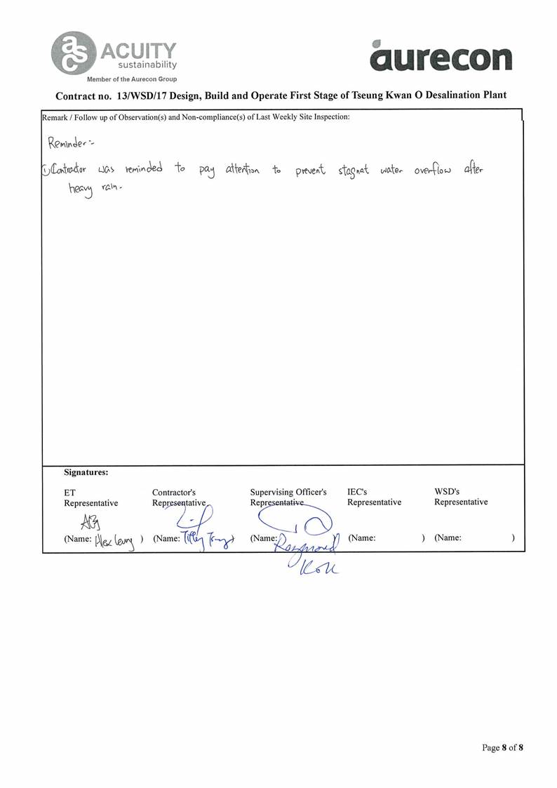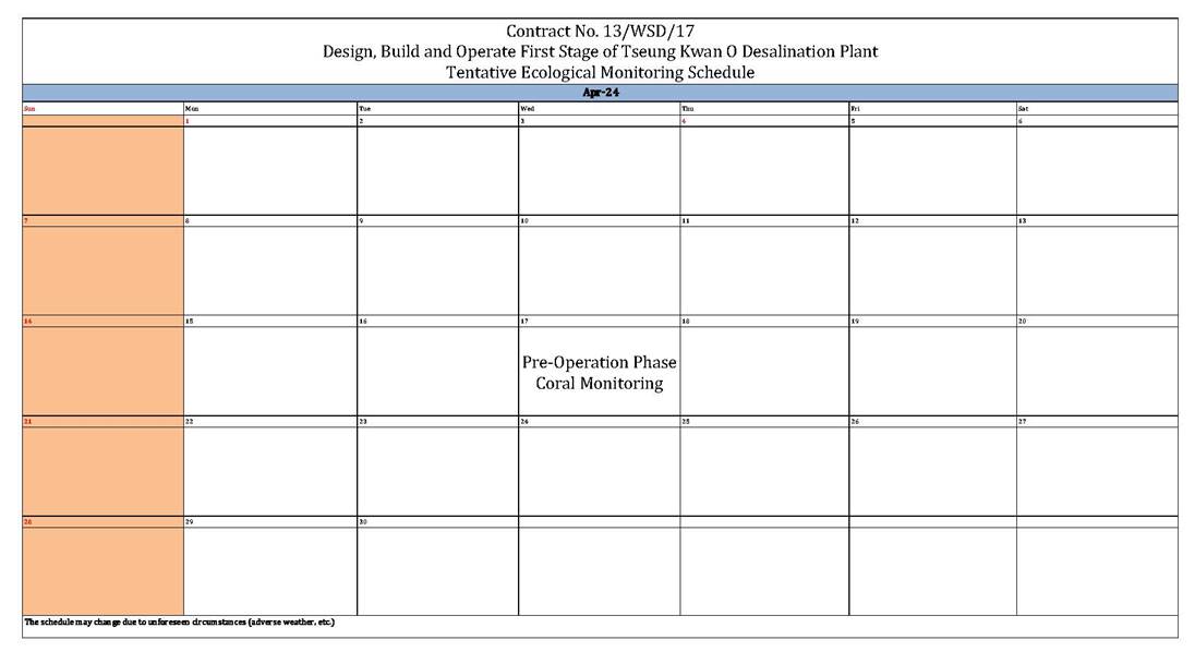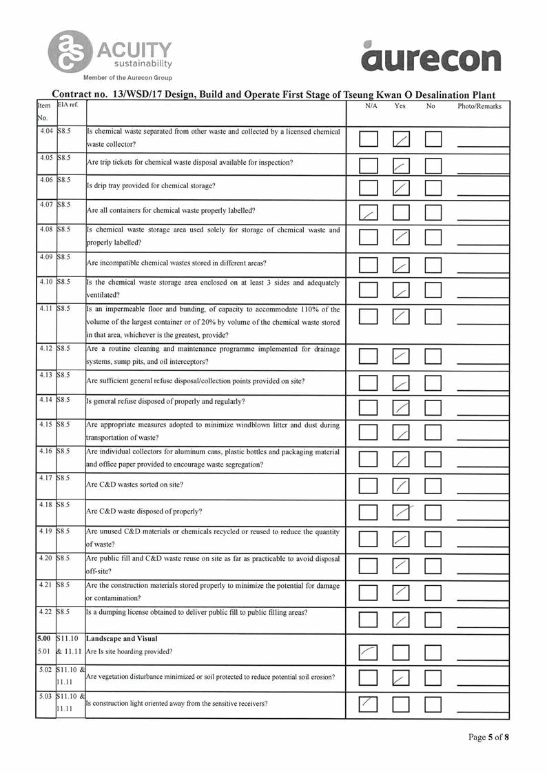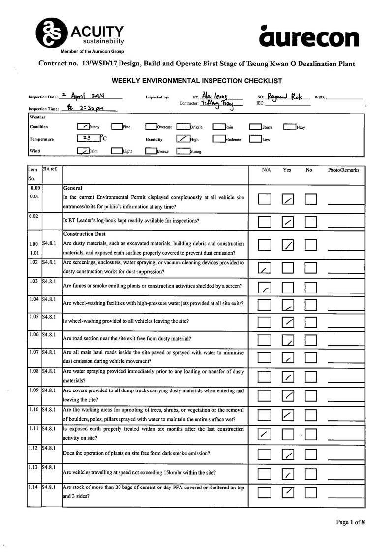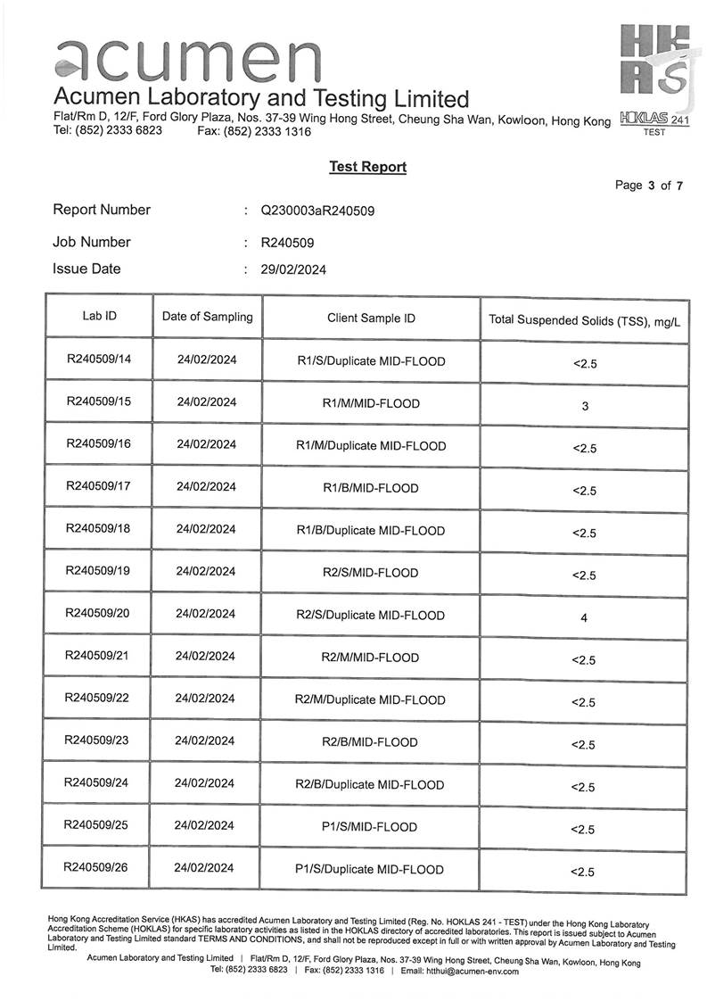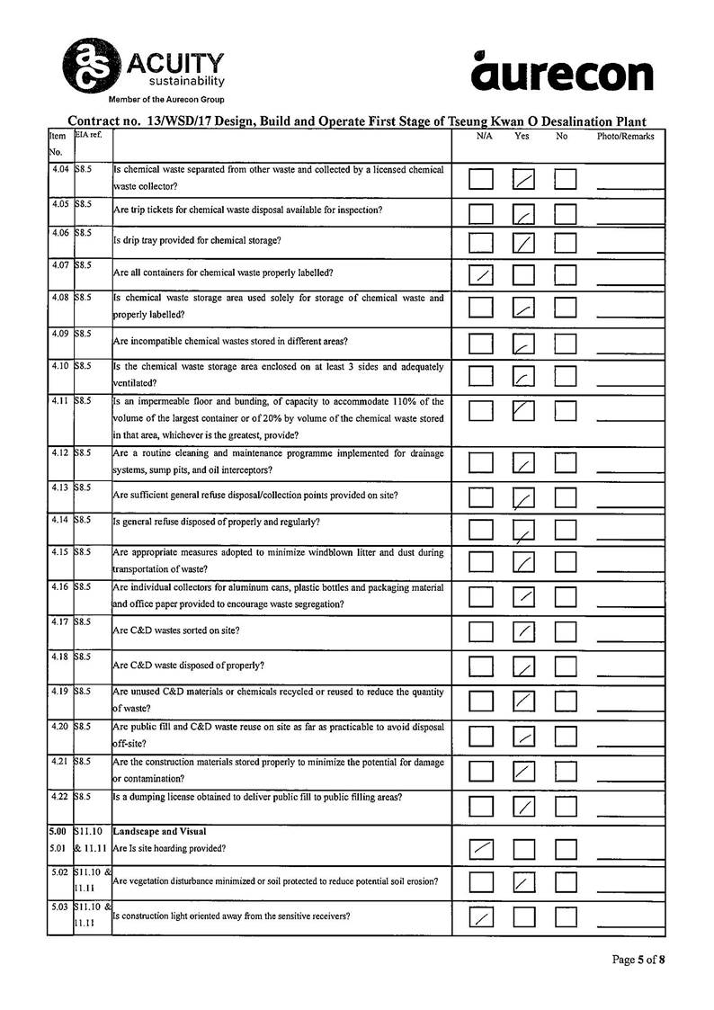 A2. In accordance with the Environmental Monitoring and Audit (EM&A) Manual for the Contract, EM&A works for marine water quality, noise, waste management and ecology should be carried out by Environmental Team (ET), Acuity Sustainability Consulting Limited (ASCL), during the construction phase of the Contract.