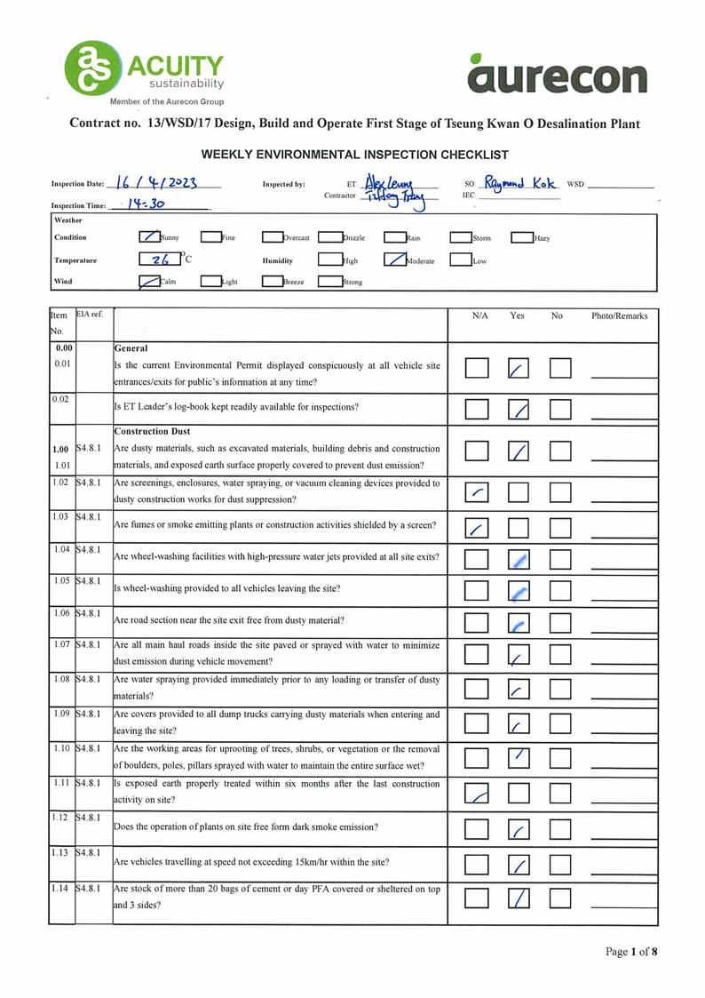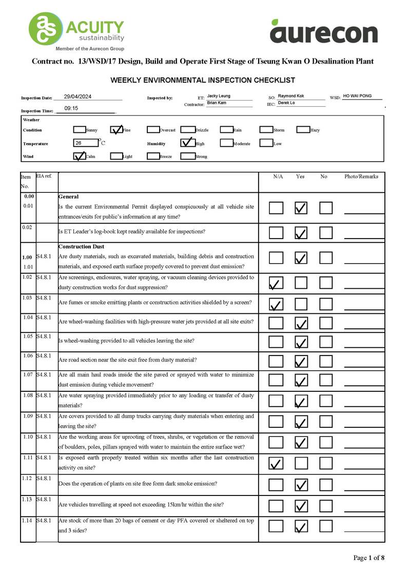 A15. Joint site inspections of the construction work by ET and IEC were carried out on 29 April 2024 to audit the mitigation measures implementation status. Reminders were recorded in the site inspection checklists and provided to the contractors together with the appropriate follow-up actions where necessary.