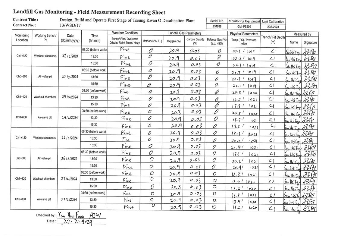 A14. In this reporting period, 126 times of landfill gas monitoring were periodically conducted at TKO Area 137 (Ch1+340 - Ch1+600). No exceedances of action level and limit level was observed.