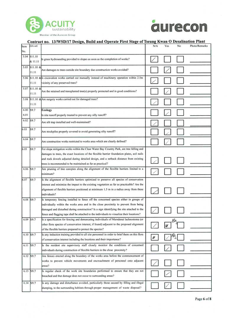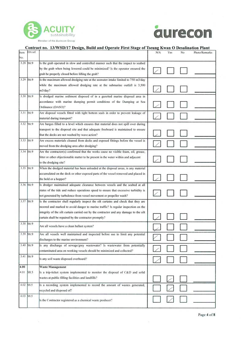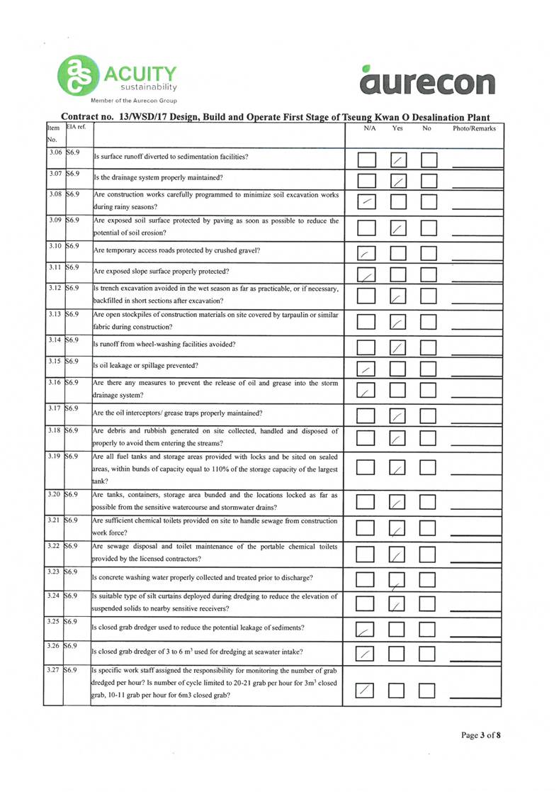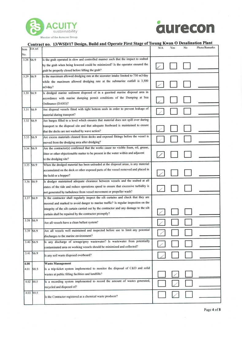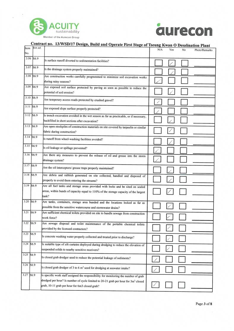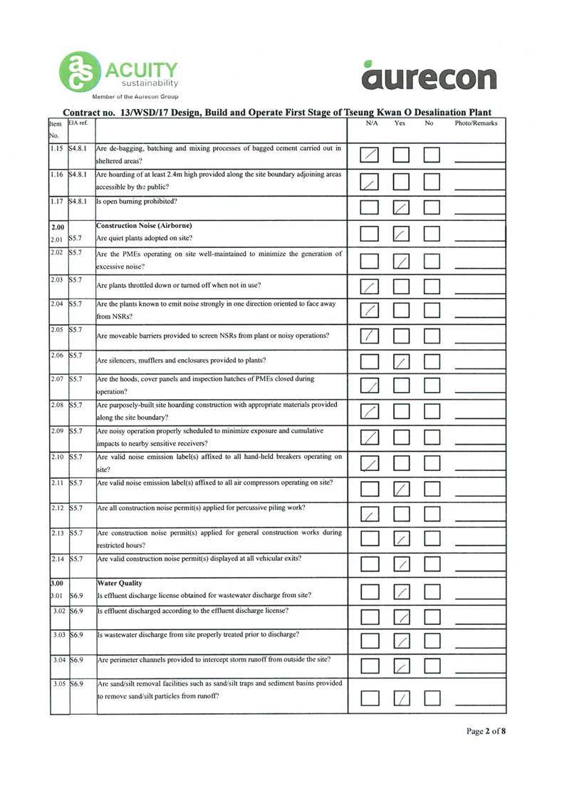 A2. In accordance with the Environmental Monitoring and Audit (EM&A) Manual for the Contract, EM&A works for marine water quality, noise, waste management and ecology should be carried out by Environmental Team (ET), Acuity Sustainability Consulting Limited (ASCL), during the construction phase of the Contract.
