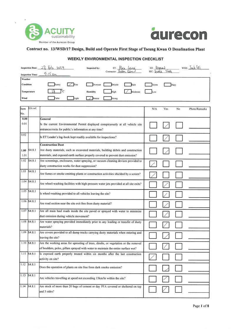 A15. Joint site inspections of the construction work by ET and IEC were carried out on 16 and 28 February 2024 to audit the mitigation measures implementation status. Reminders were recorded in the site inspection checklists and provided to the contractors together with the appropriate follow-up actions where necessary.
