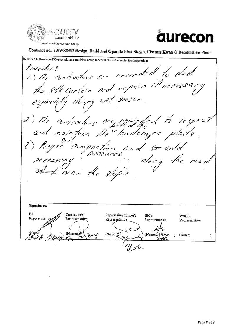 A15. Joint site inspections of the construction work by ET and IEC were carried out on 28 May 2024 to audit the mitigation measures implementation status. Reminders were recorded in the site inspection checklists and provided to the contractors together with the appropriate follow-up actions where necessary.