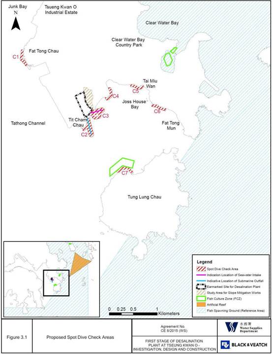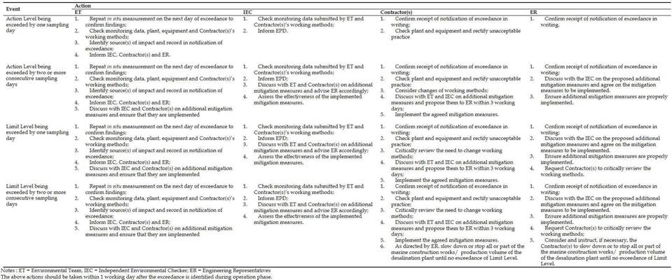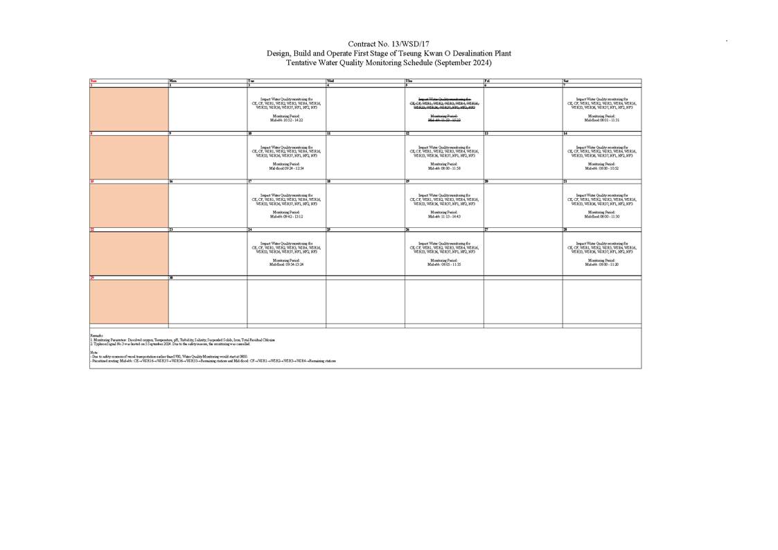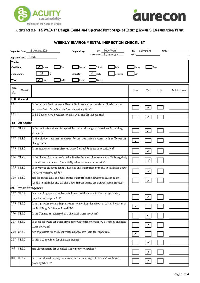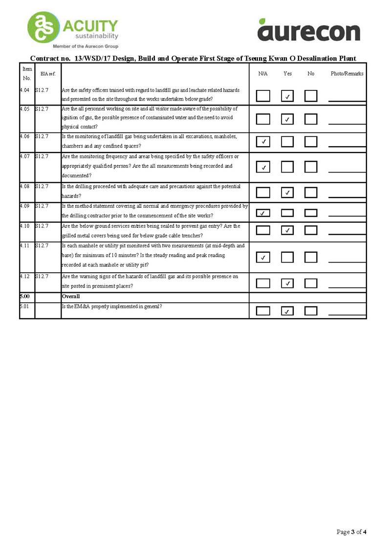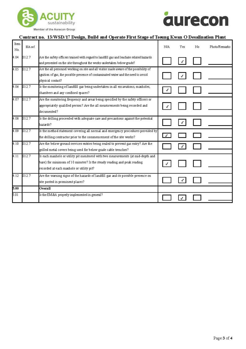 A2. In accordance with the Environmental Monitoring and Audit (EM&A) Manual for the Contract, EM&A works for marine water quality, waste management and ecology should be carried out by Environmental Team (ET), Aurecon Hong Kong Limited (Aurecon), during the Tseung Kwan O Desalination Plant.