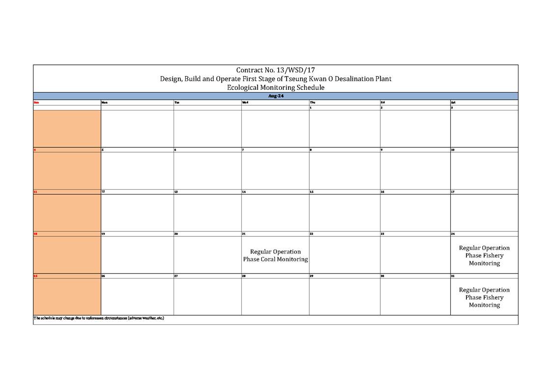A3. The TKODP commenced the operation stage on 1 July 2024. This is the 2nd Operation Phase Monthly EM&A Report, prepared by Aurecon, for the Contract summarizing the monitoring results and audit findings of the EM&A programme at and around Tseung Kwan O Area 137 (TKO 137) during first-year operation of Tseung Kwan O Desalination Plant in August 2024.