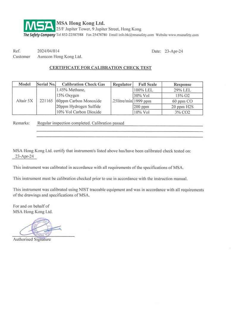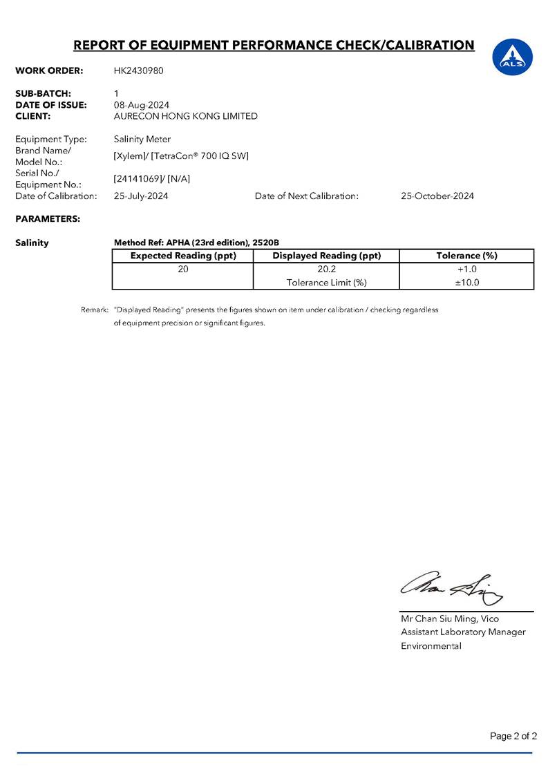 Water Quality Monitoring Equipment and Landfill Gas Equipment Calibration Certificate |
