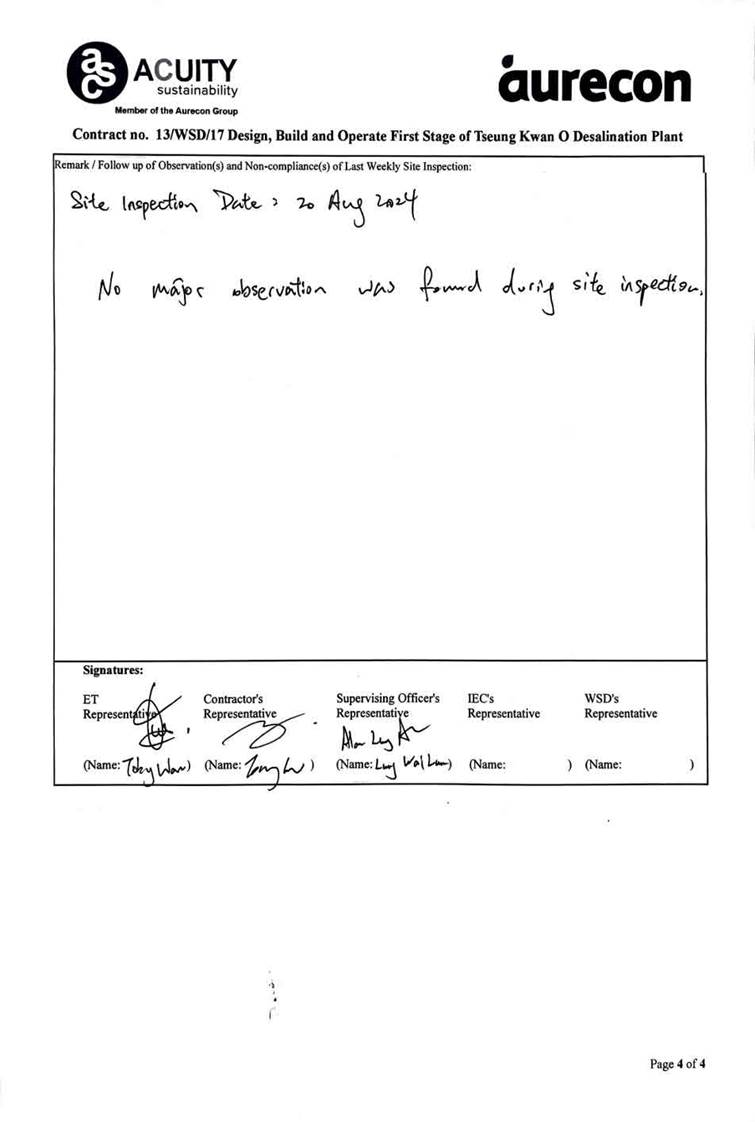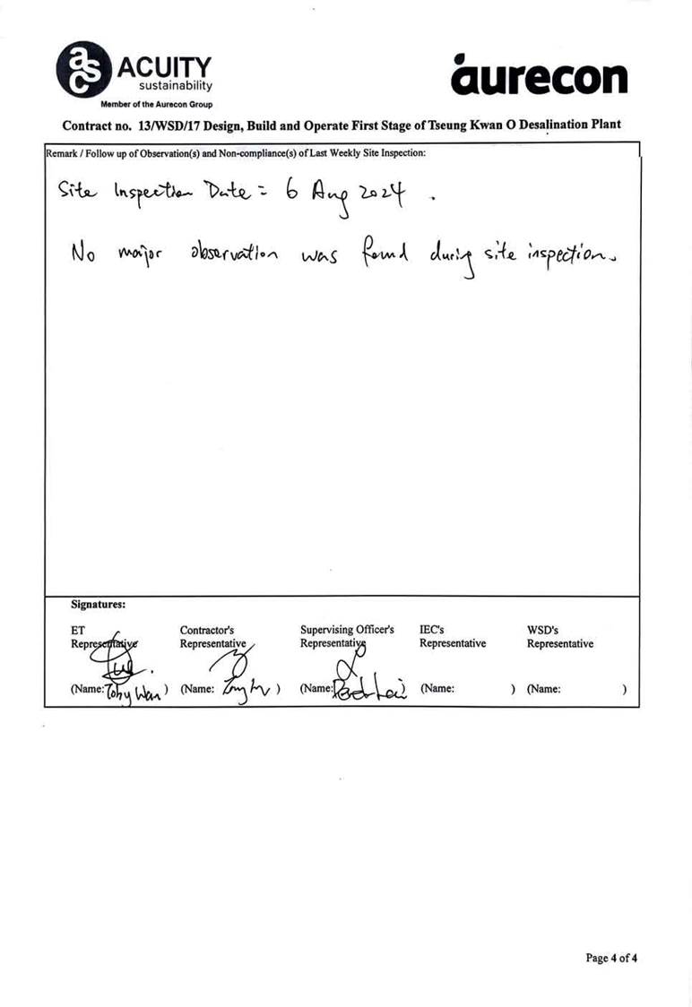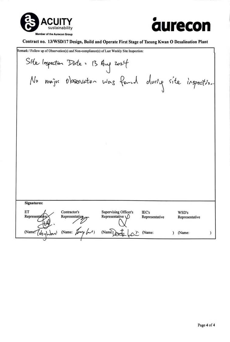 A10. In this reporting period, site inspections were carried out by ET on 6, 13, 20 and 26 August 2024. Joint site inspections of the operation work by ET were and IEC were carried out on 26 August 2024 to audit the mitigation measures implementation status.