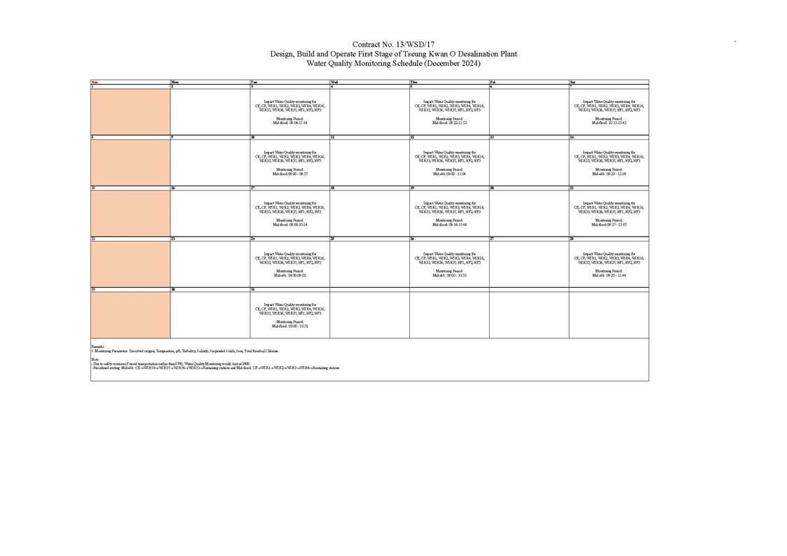 A3. The TKODP commenced the operation stage on 1 July 2024. This is the 6th Operation Phase Monthly EM&A Report, prepared by Aurecon, for the Contract summarizing the monitoring results and audit findings of the EM&A programme at and around Tseung Kwan O Area 137 (TKO 137) during first-year operation of Tseung Kwan O Desalination Plant in December 2024.