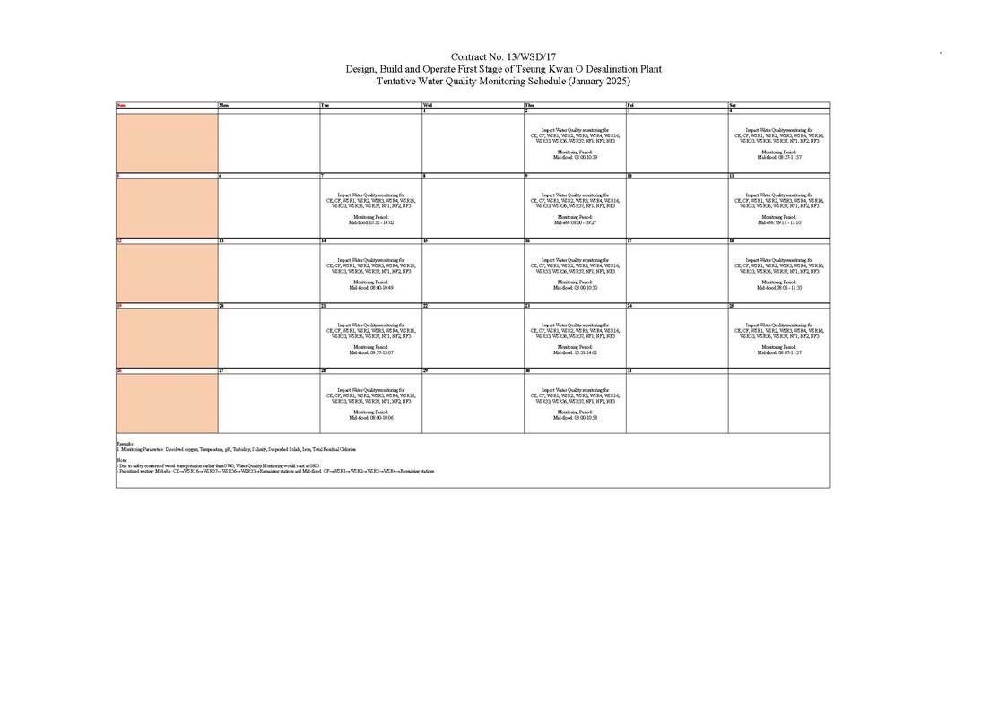 A2. In accordance with the Environmental Monitoring and Audit (EM&A) Manual for the Contract, EM&A works for marine water quality, waste management and ecology should be carried out by Environmental Team (ET), Aurecon Hong Kong Limited (Aurecon), during the Tseung Kwan O Desalination Plant.