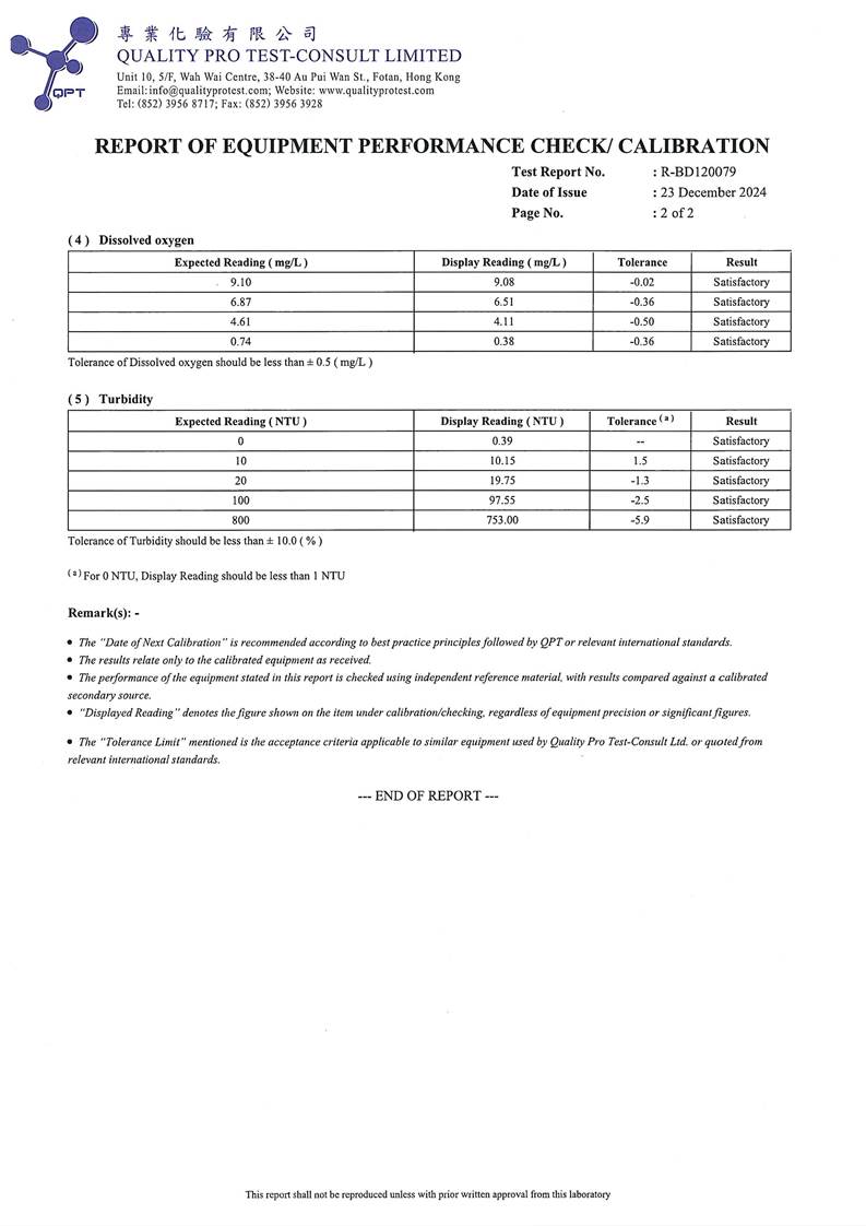 Water Quality Monitoring Equipment and Landfill Gas Equipment Calibration Certificate |