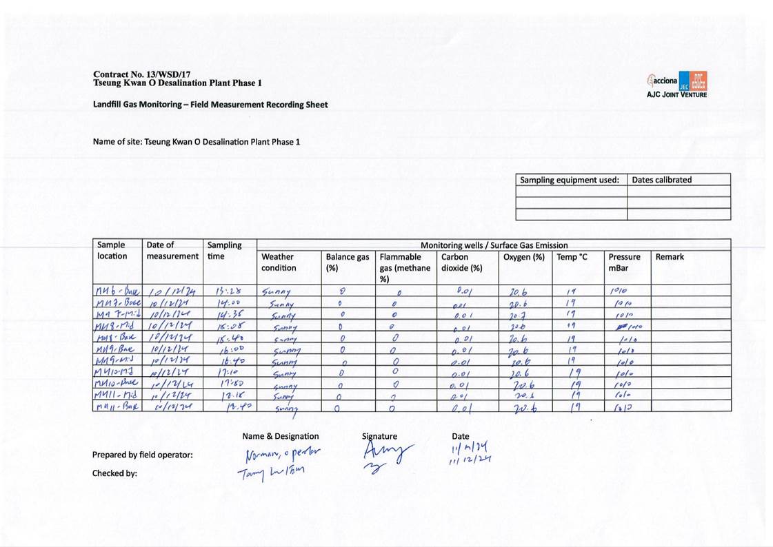 A10. In this reporting period, monthly landfill gas monitoring was conducted on 10 and 11 December 2024. No exceedances of action level and limit level was observed.