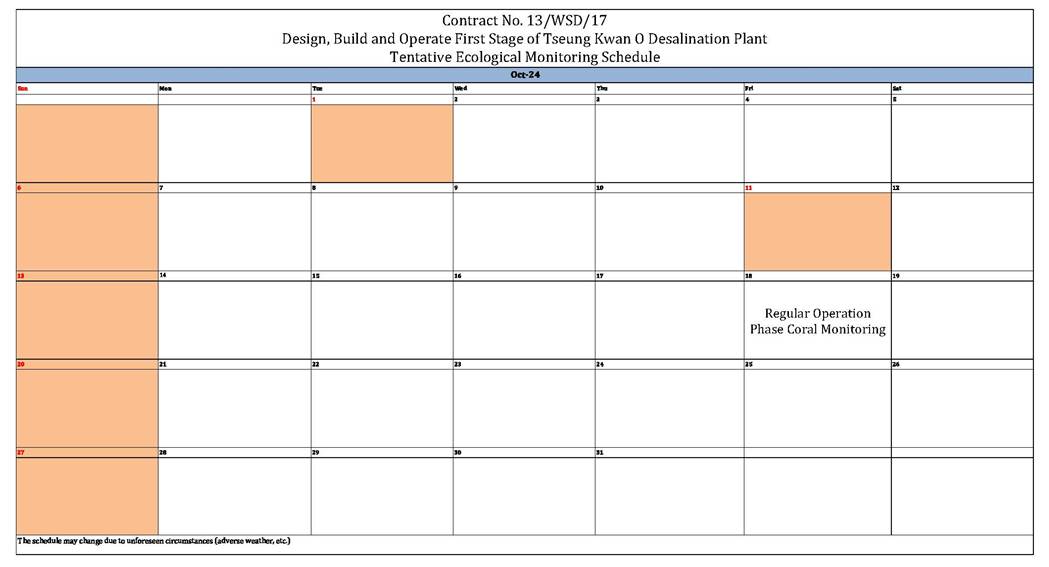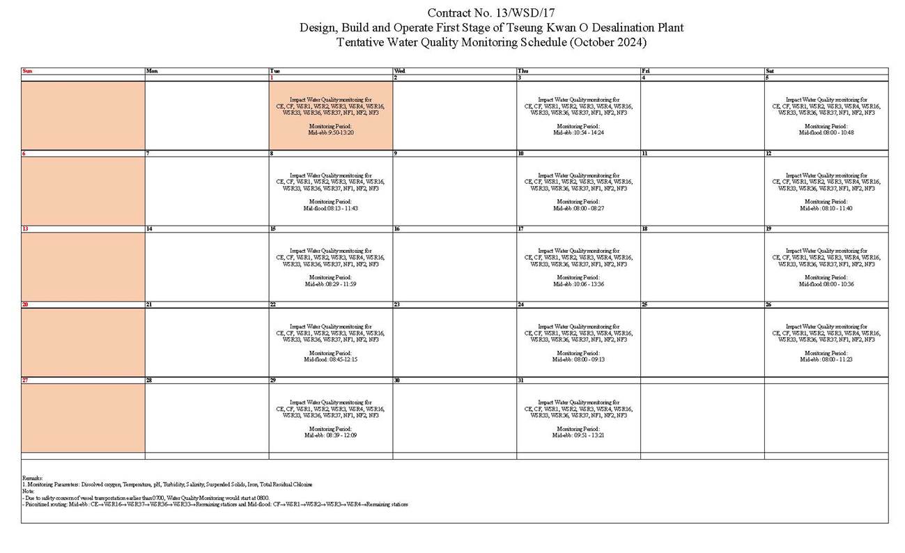 A2. In accordance with the Environmental Monitoring and Audit (EM&A) Manual for the Contract, EM&A works for marine water quality, waste management and ecology should be carried out by Environmental Team (ET), Aurecon Hong Kong Limited (Aurecon), during the Tseung Kwan O Desalination Plant.