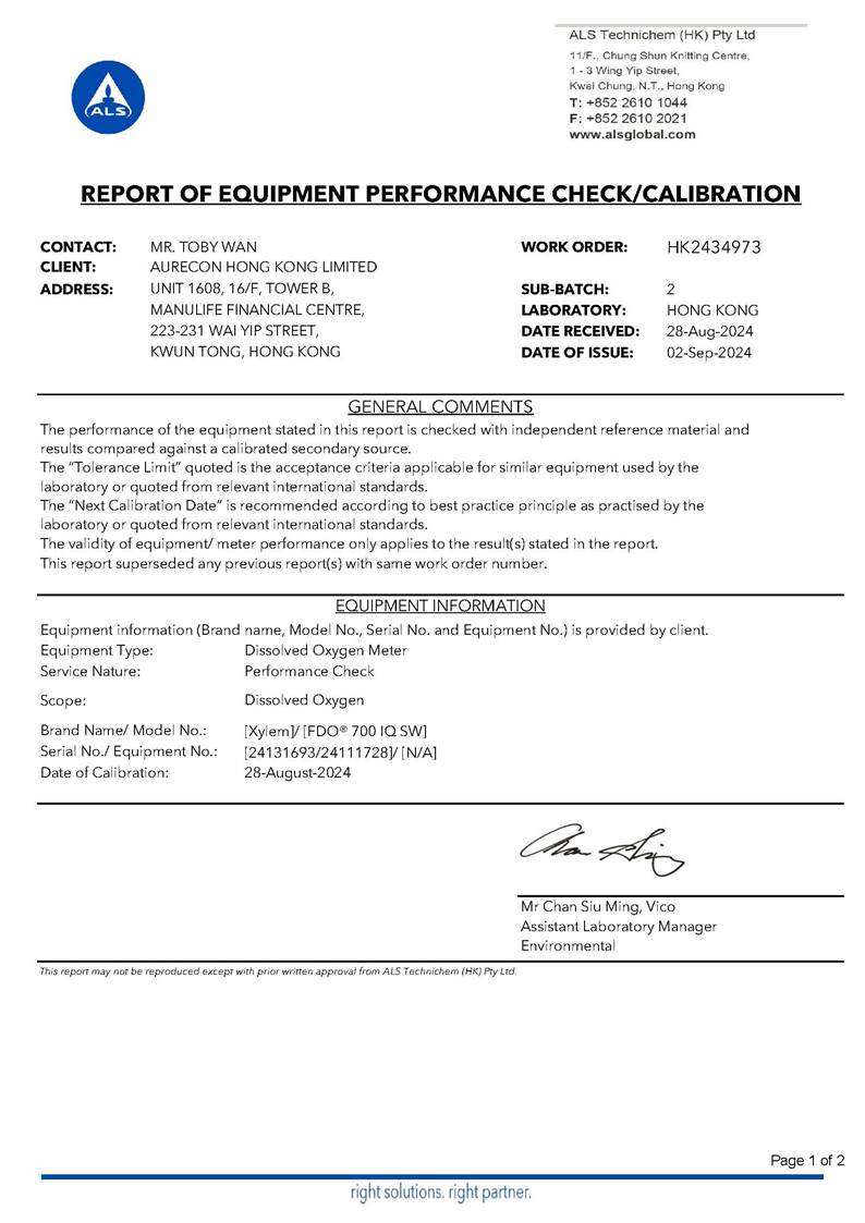 Water Quality Monitoring Equipment and Landfill Gas Equipment Calibration Certificate |