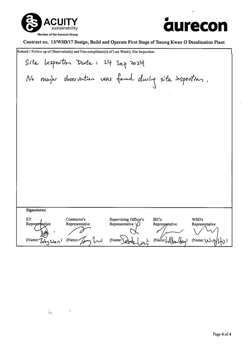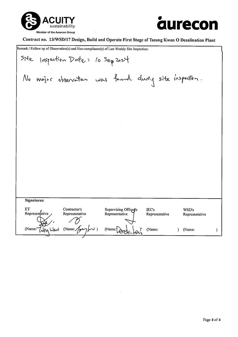 A10. In this reporting period, site inspections were carried out by ET on 3, 10, 17 and 24 September 2024. Joint site inspections of the operation work by ET were and IEC were carried out on 24 September 2024 to audit the mitigation measures implementation status.