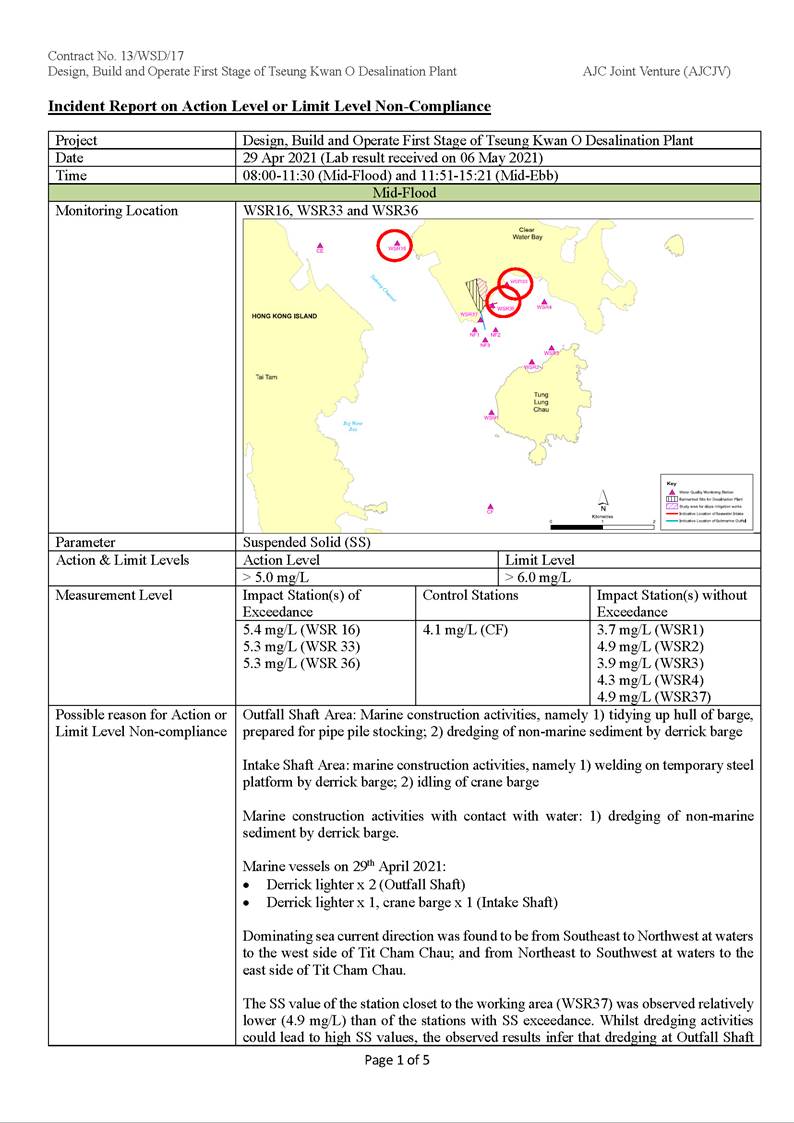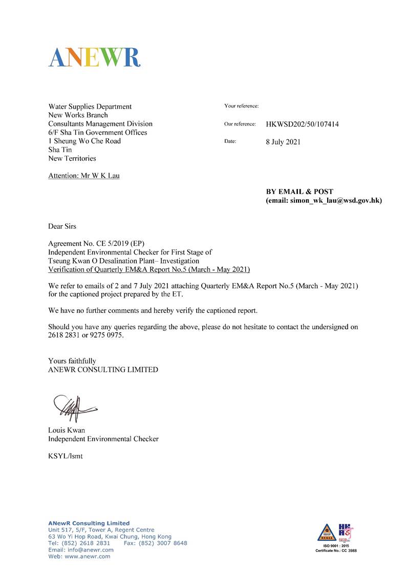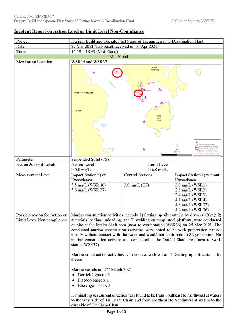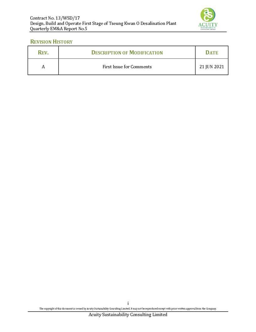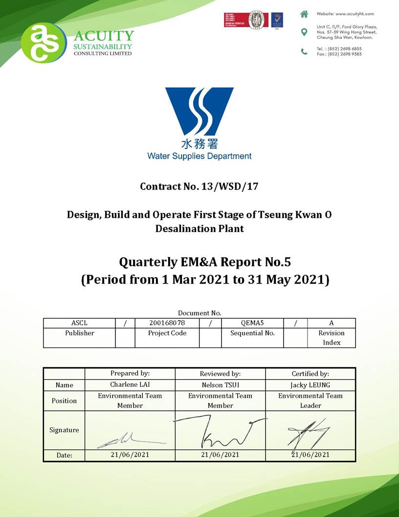 A3. This is the 5th Quarterly EM&A Report, prepared by ASCL, for the Project summarizing the monitoring results and audit findings of the EM&A programme at and around Tseung Kwan O Area 137 (TKO 137) during the reporting period from 1 March 2021 to 31 May 2021.