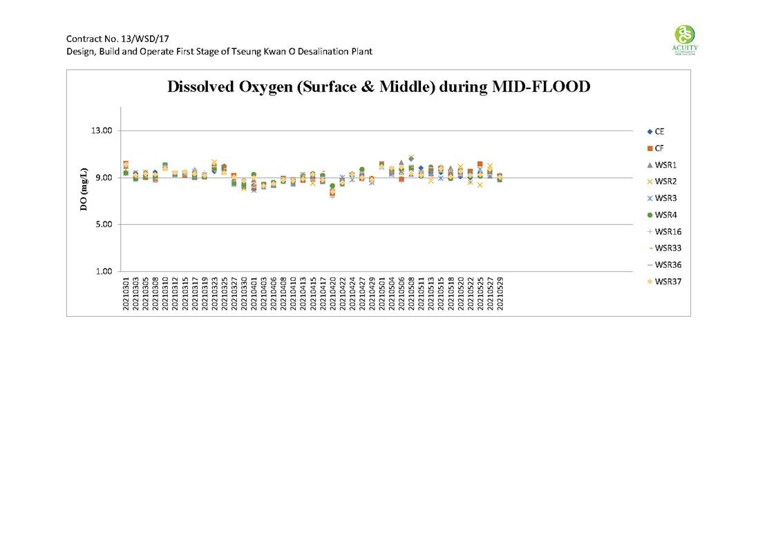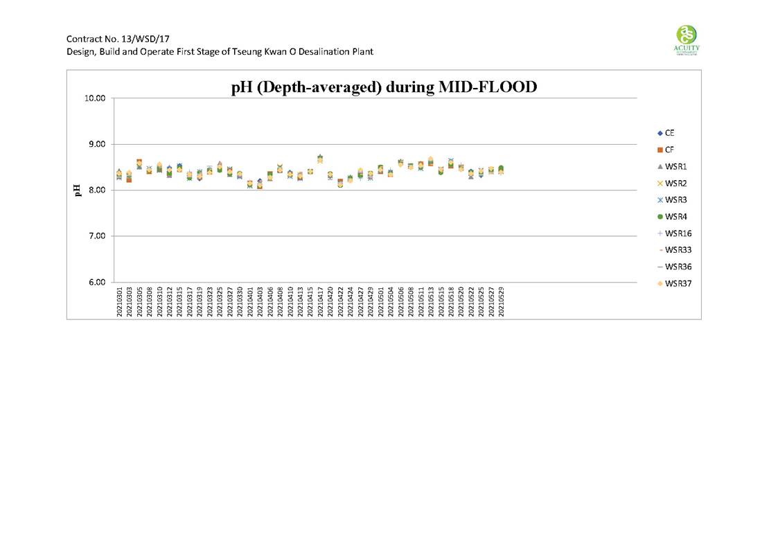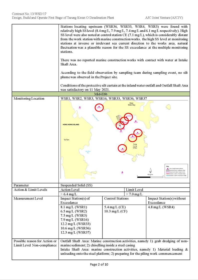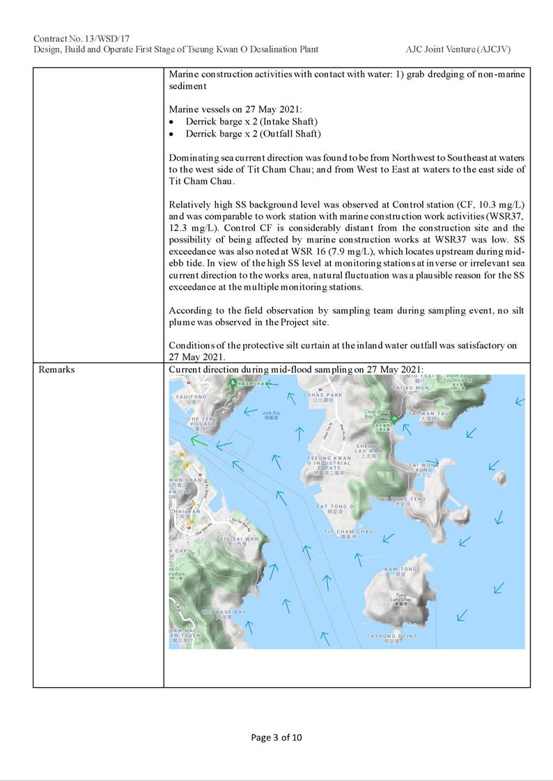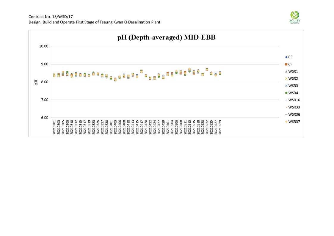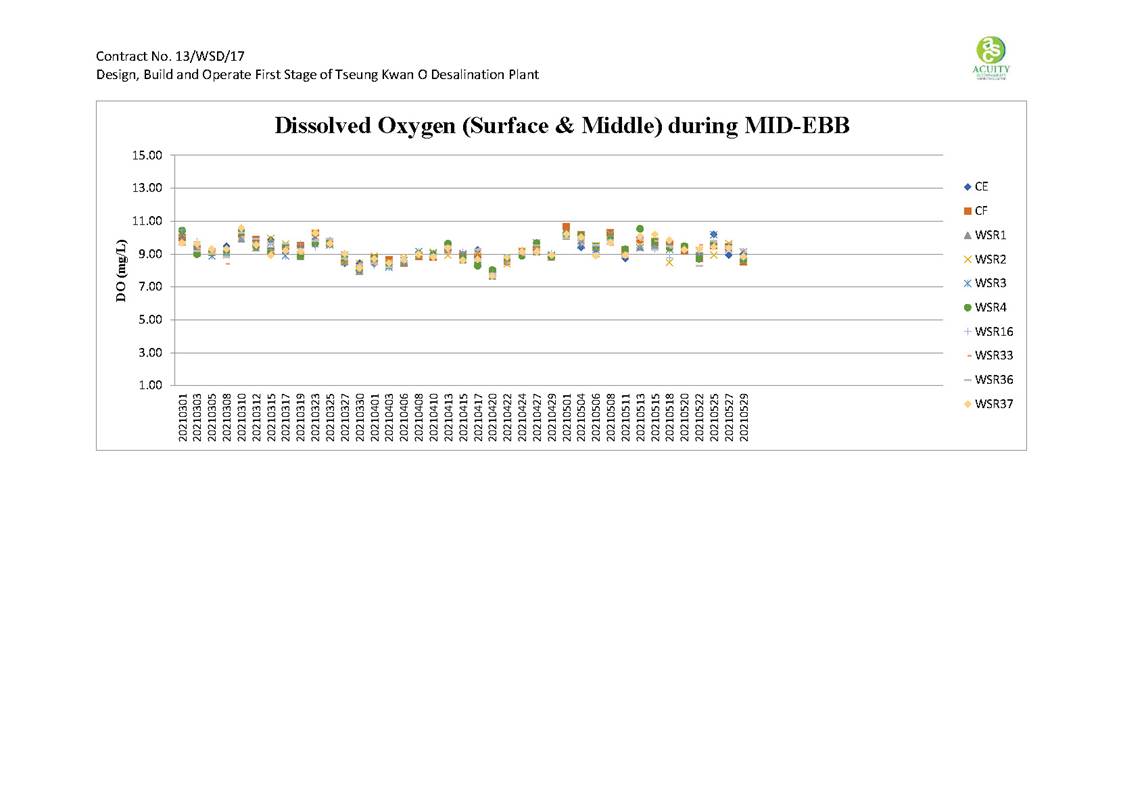 A10. General water quality monitoring at the ten monitoring stations (CE, CF, WSR1, WSR2, WSR3, WSR4, WSR16, WSR33, WSR36 and WSR37) were conducted on 1, 3, 5, 8, 10, 12, 15, 17, 19, 23, 25, 27 and 30 March 2021; 1, 3, 6, 8, 10, 13, 15, 17, 20, 22, 24, 27 and 29 April 2021 and 1, 4, 6, 8, 11, 13, 15, 18, 20, 22, 25, 27 and 29 May 2021.