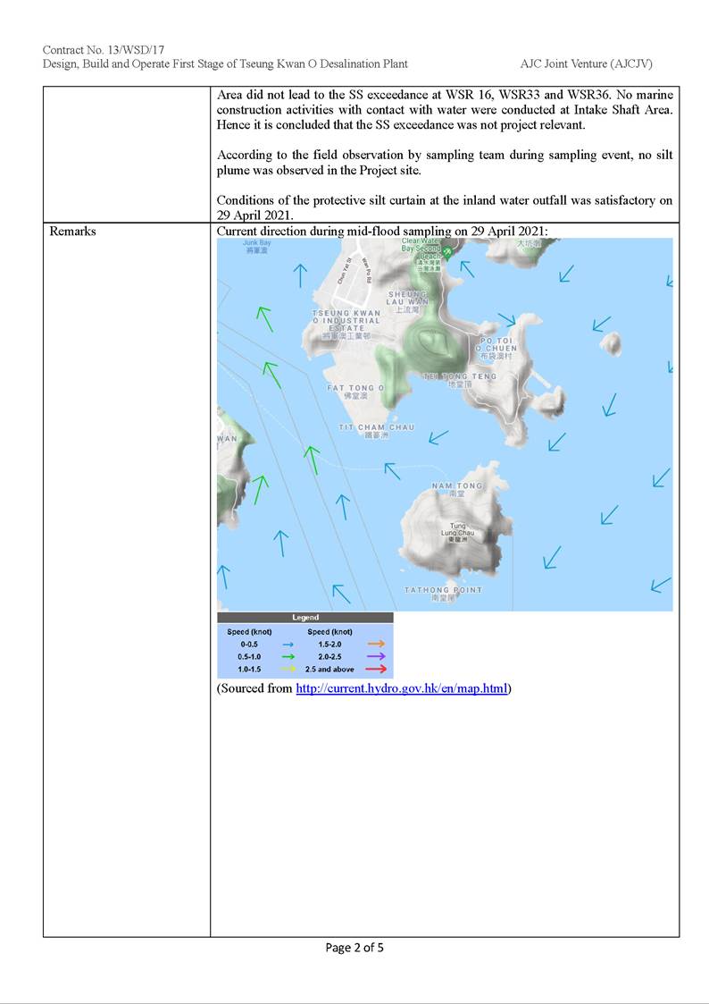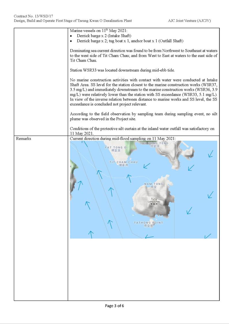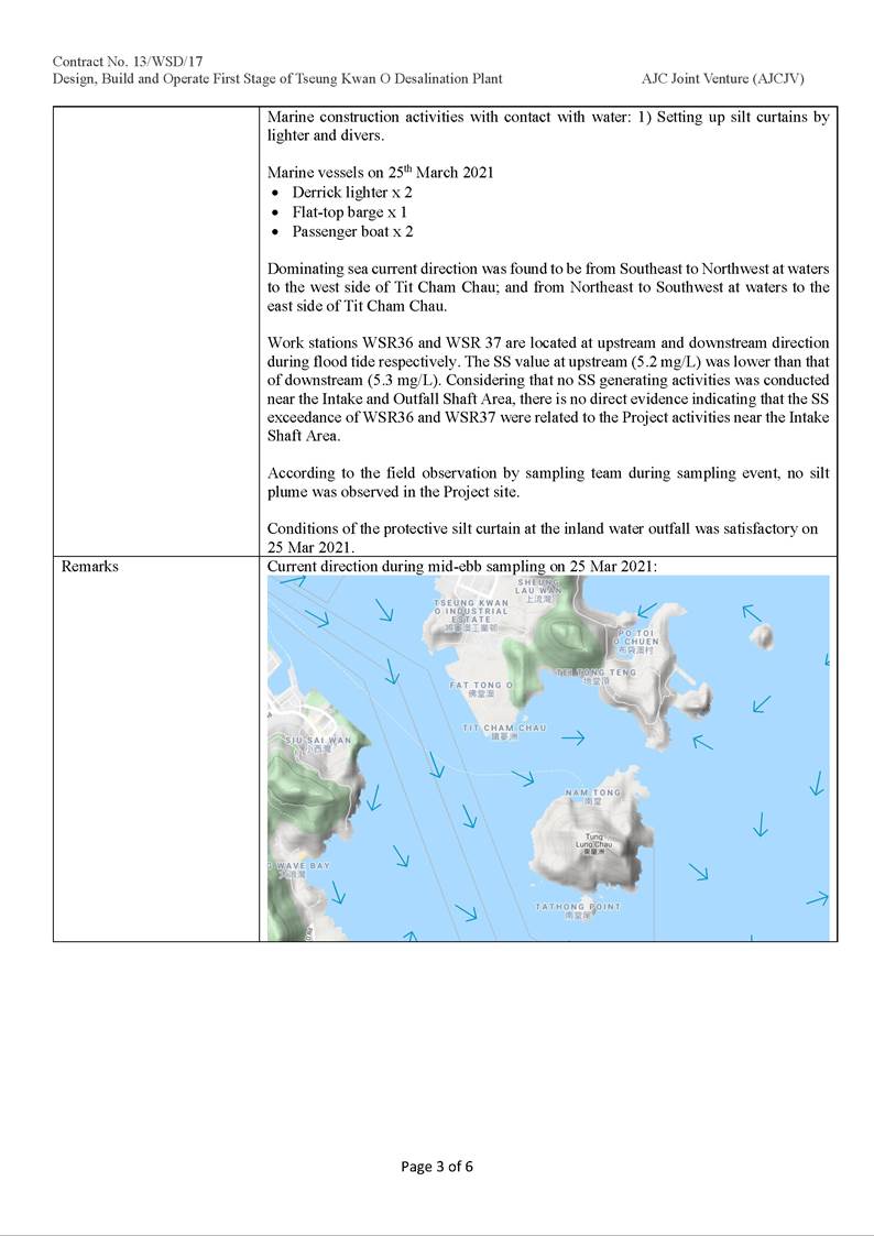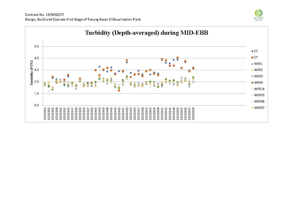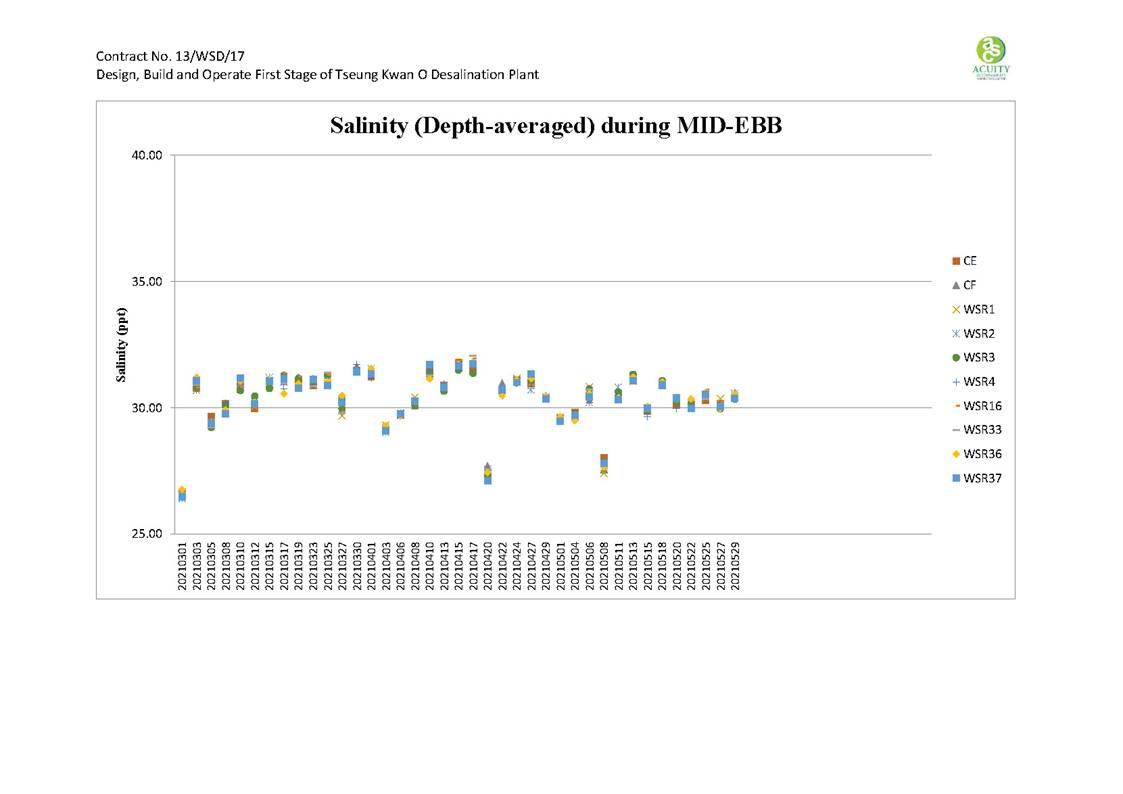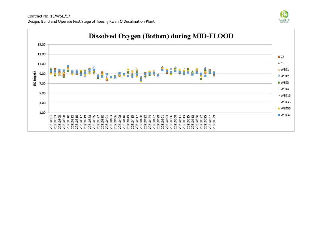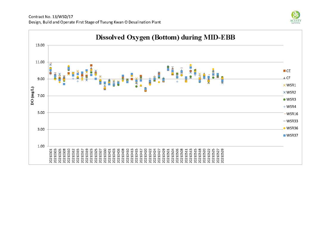 A10. General water quality monitoring at the ten monitoring stations (CE, CF, WSR1, WSR2, WSR3, WSR4, WSR16, WSR33, WSR36 and WSR37) were conducted on 1, 3, 5, 8, 10, 12, 15, 17, 19, 23, 25, 27 and 30 March 2021; 1, 3, 6, 8, 10, 13, 15, 17, 20, 22, 24, 27 and 29 April 2021 and 1, 4, 6, 8, 11, 13, 15, 18, 20, 22, 25, 27 and 29 May 2021.