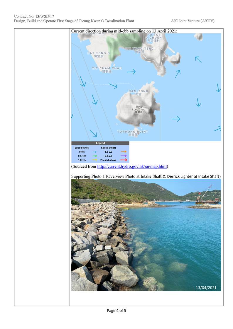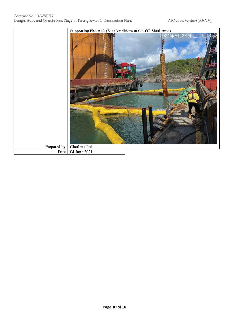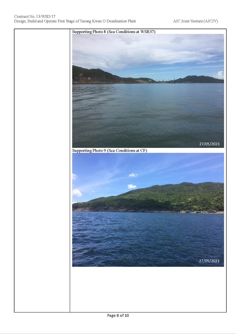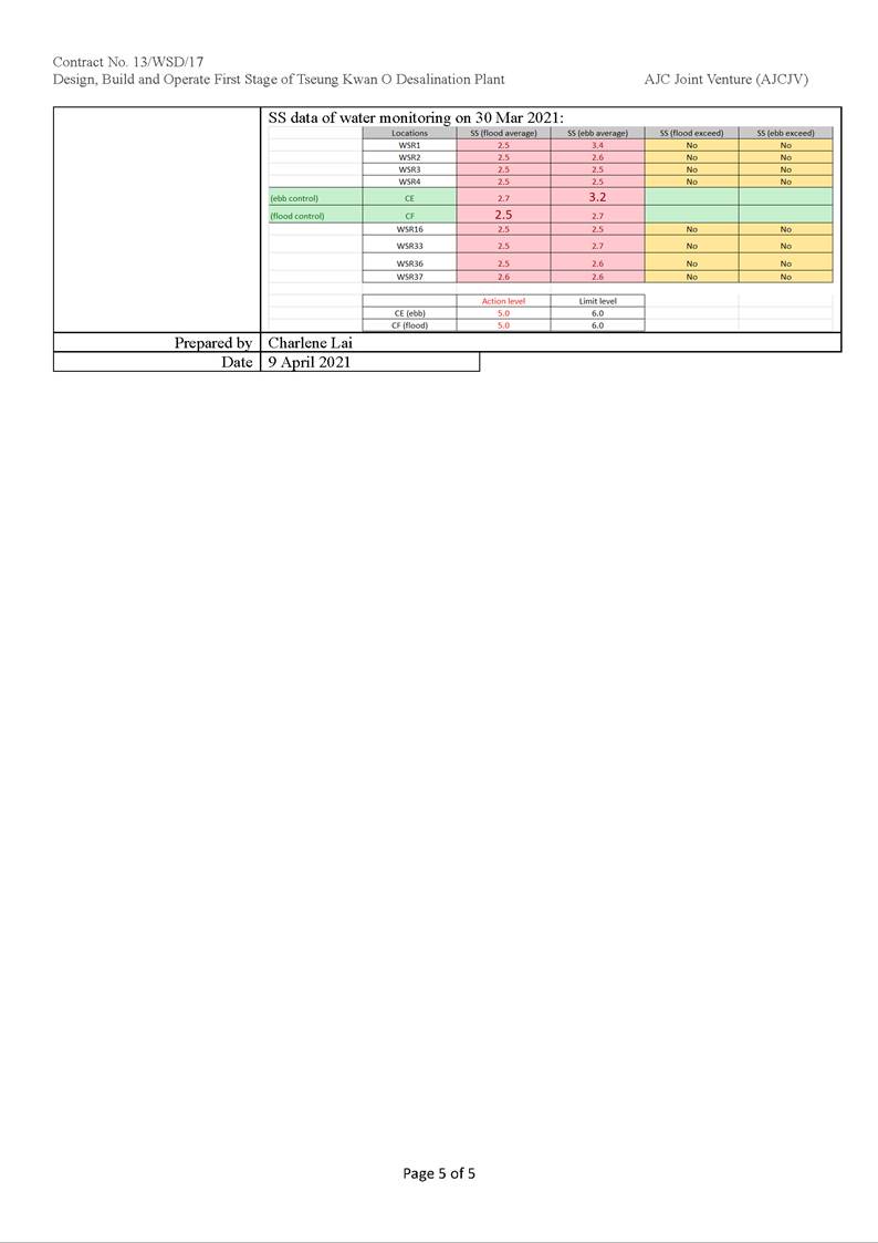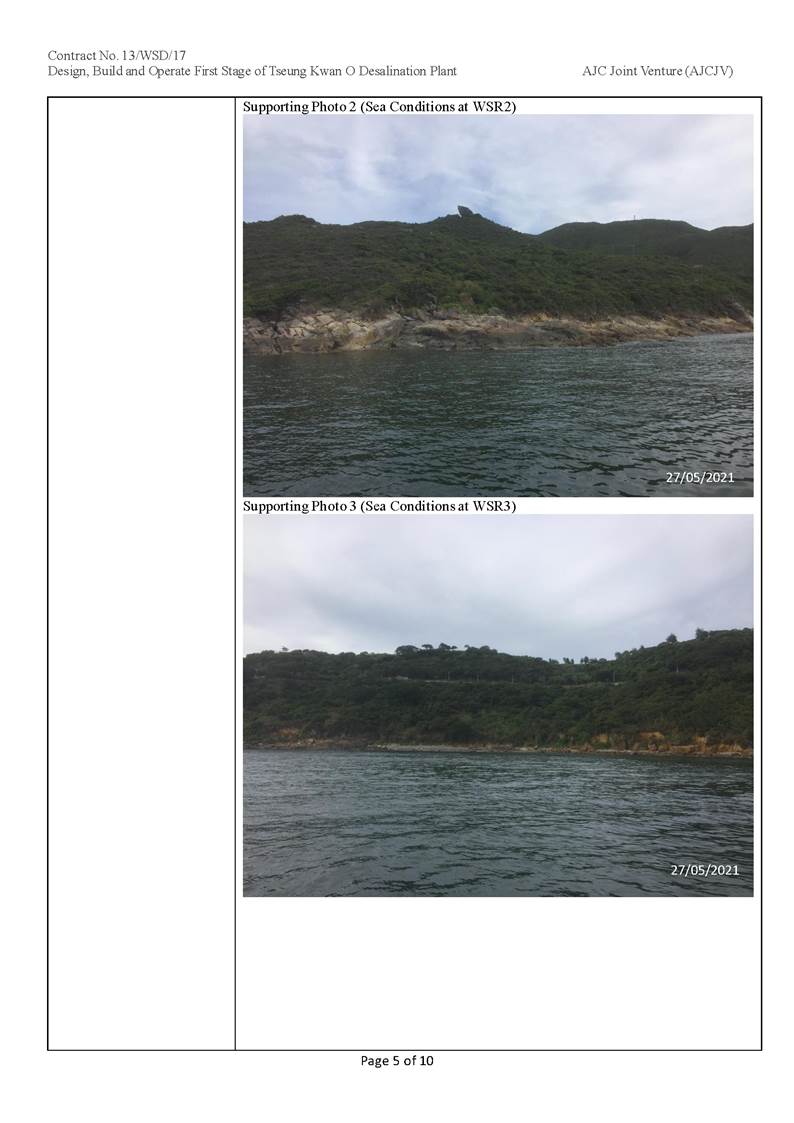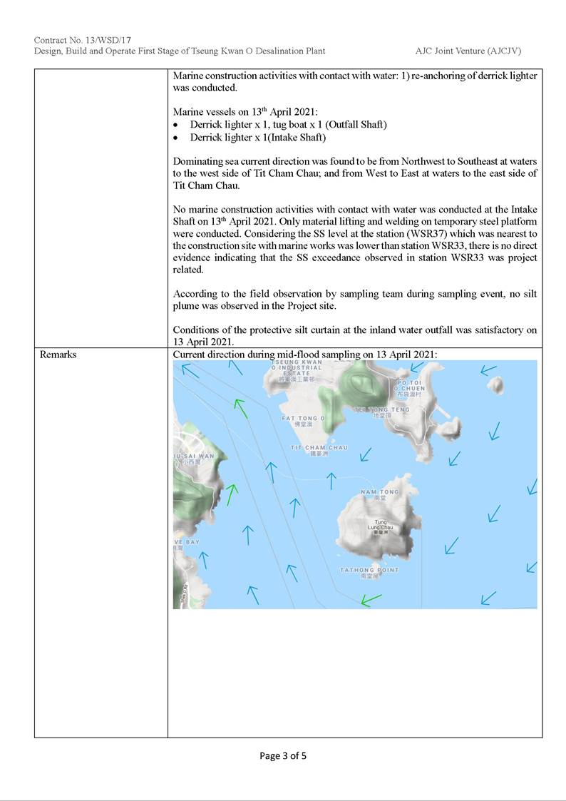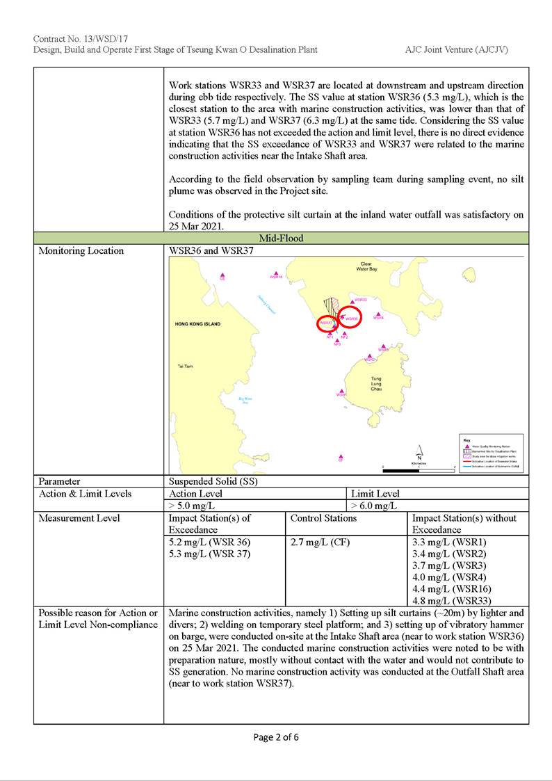 A10. General water quality monitoring at the ten monitoring stations (CE, CF, WSR1, WSR2, WSR3, WSR4, WSR16, WSR33, WSR36 and WSR37) were conducted on 1, 3, 5, 8, 10, 12, 15, 17, 19, 23, 25, 27 and 30 March 2021; 1, 3, 6, 8, 10, 13, 15, 17, 20, 22, 24, 27 and 29 April 2021 and 1, 4, 6, 8, 11, 13, 15, 18, 20, 22, 25, 27 and 29 May 2021.