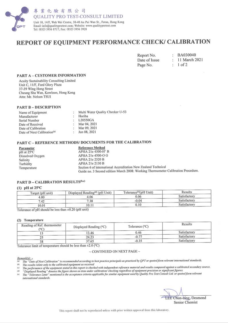 A2. In accordance with the Environmental Monitoring and Audit (EM&A) Manual for the Project, EM&A works for marine water quality, noise, waste management and ecology should be carried out by Environmental Team (ET), Acuity Sustainability Consulting Limited (ASCL), during the construction phase of the Project.