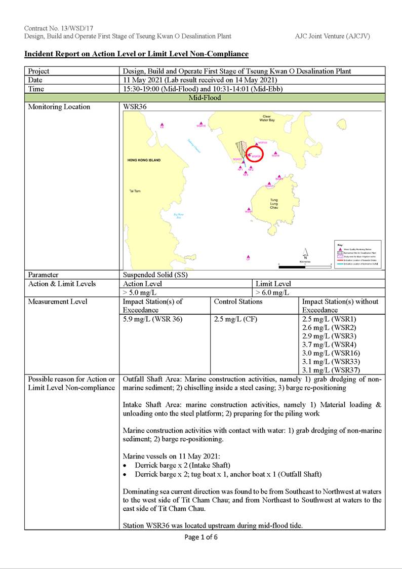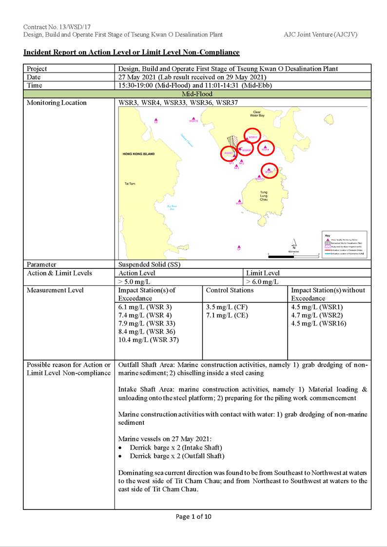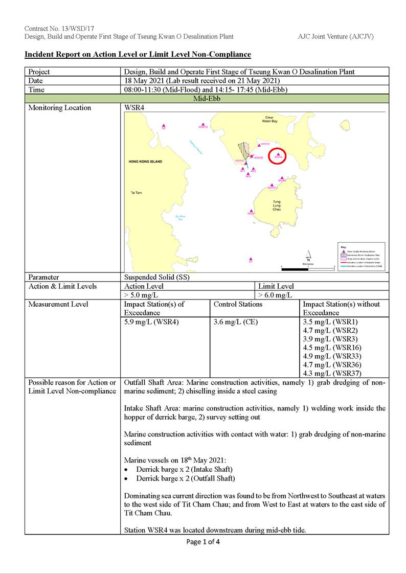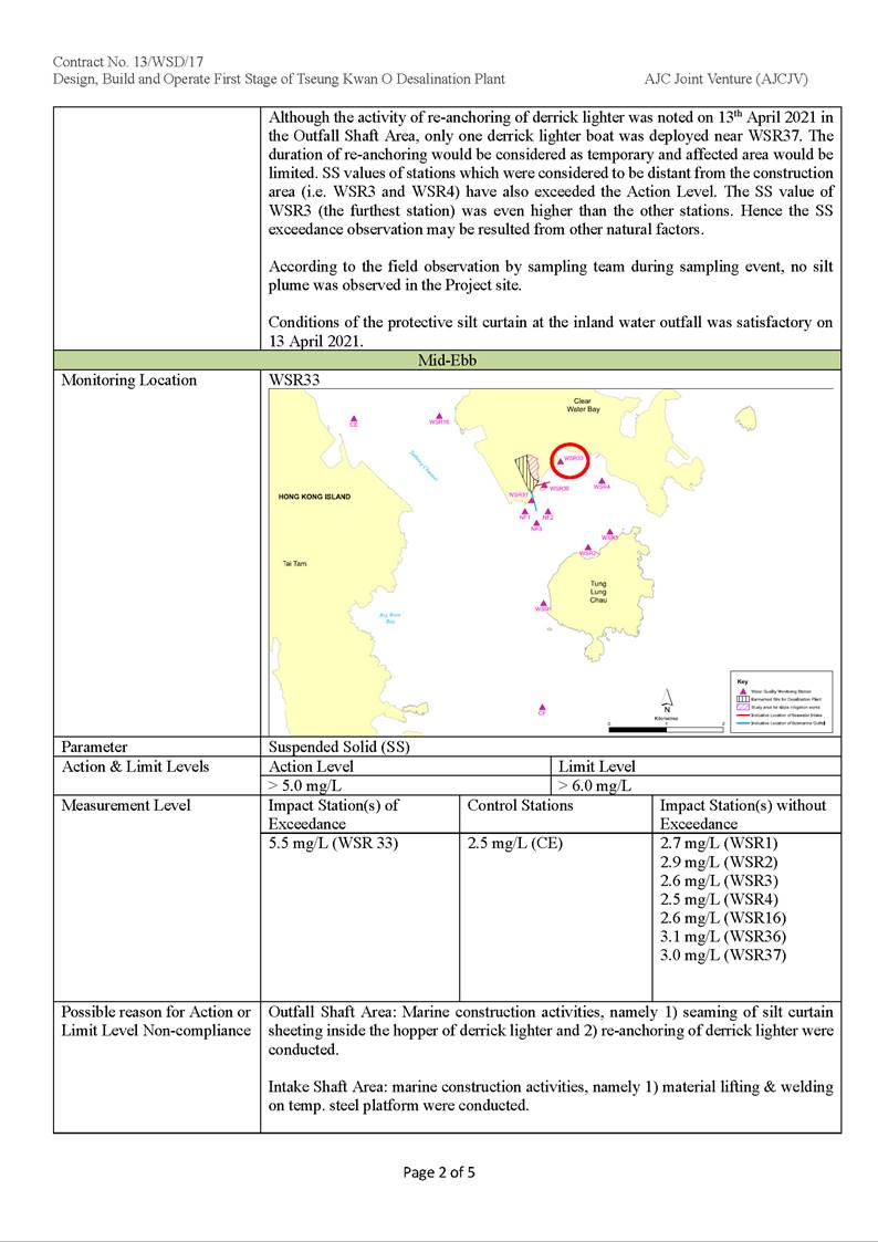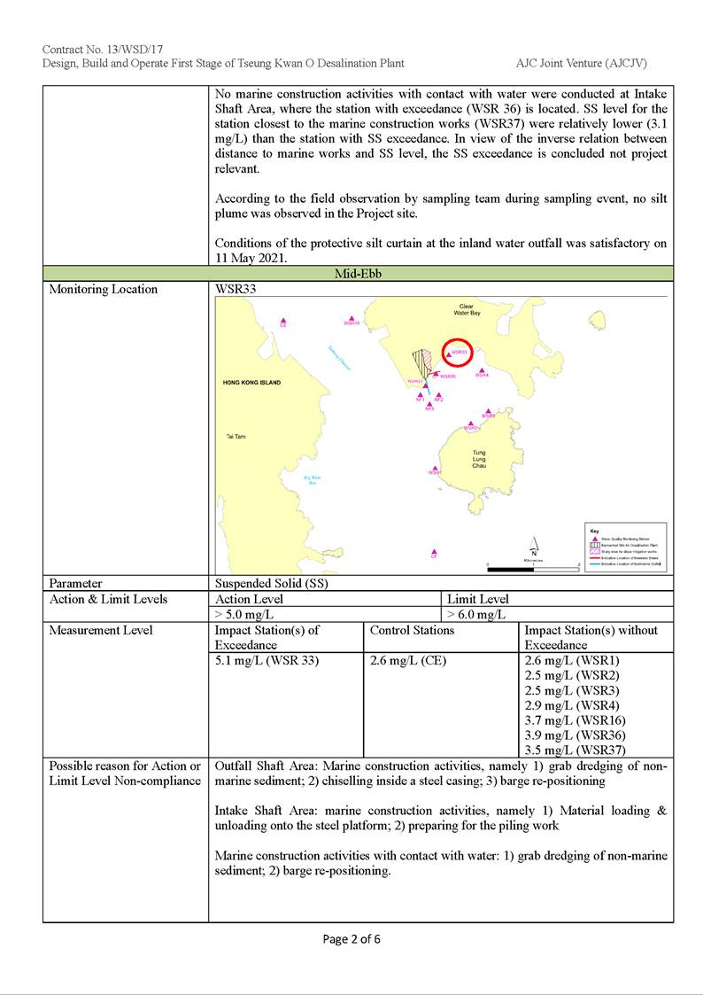 A11. During the impact monitoring period between March 2021 to May 2021, thirty-two (32) of the general water quality monitoring results of suspended solids (SS) obtained had exceeded the Action Level. Twelve (12) of the general water quality monitoring results of SS obtained during the reporting quarter had exceeded the Limit Level.
