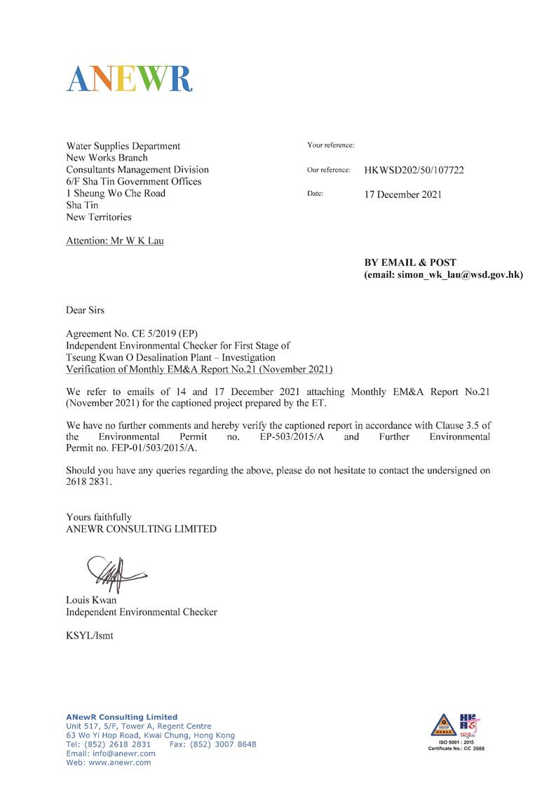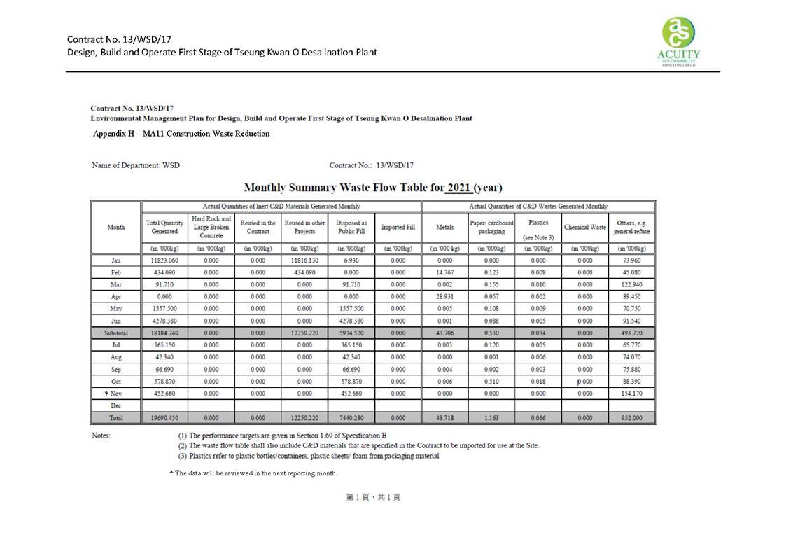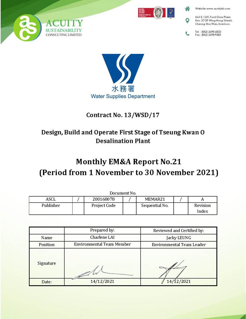 A3. This is the 21th Monthly EM&A Report, prepared by ASCL, for the Project summarizing the monitoring results and audit findings of the EM&A programme at and around Tseung Kwan O Area 137 (TKO 137) during the reporting period from 1 November 2021 to 30 November 2021.
