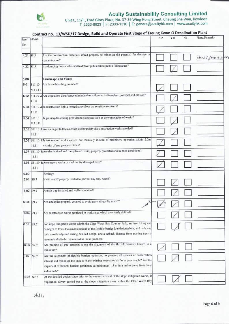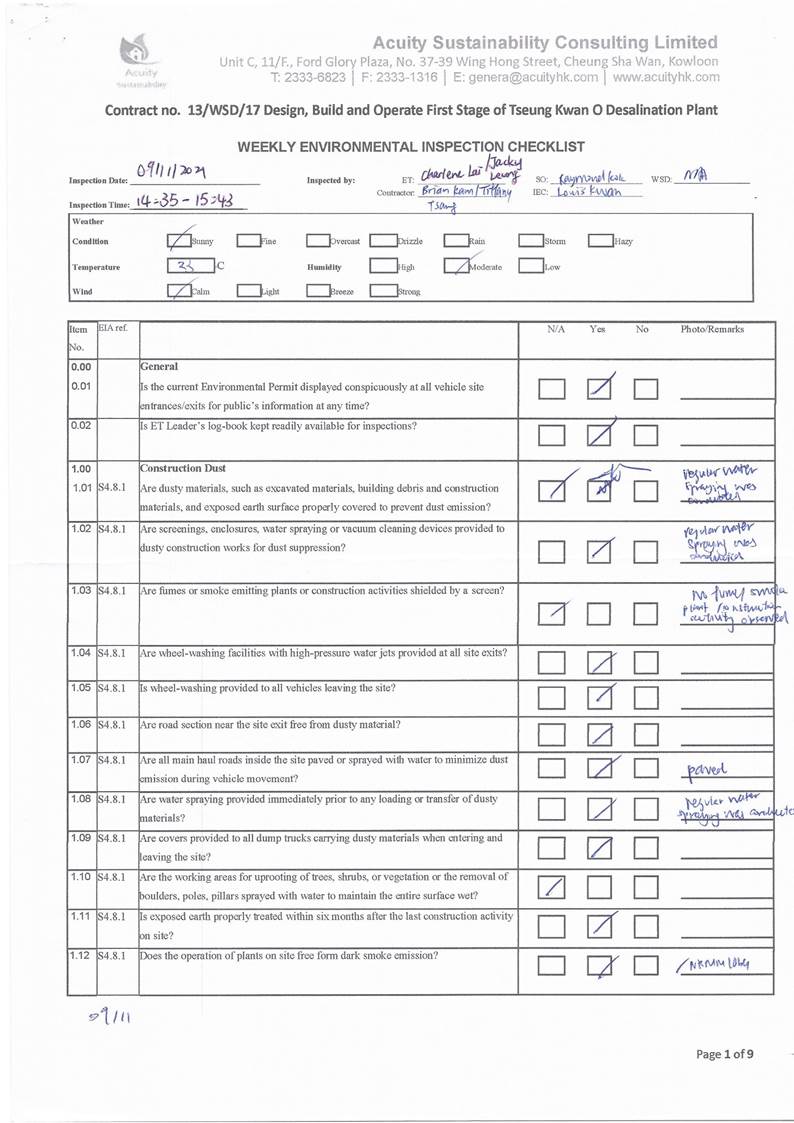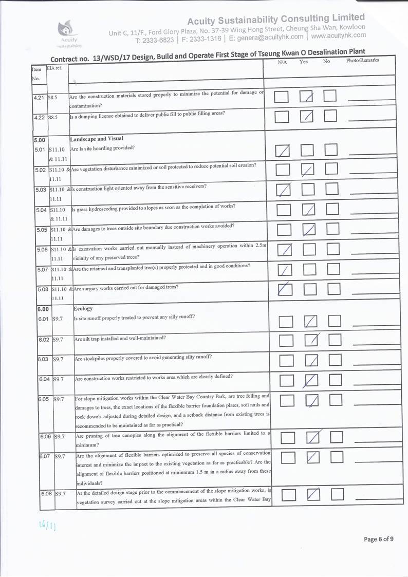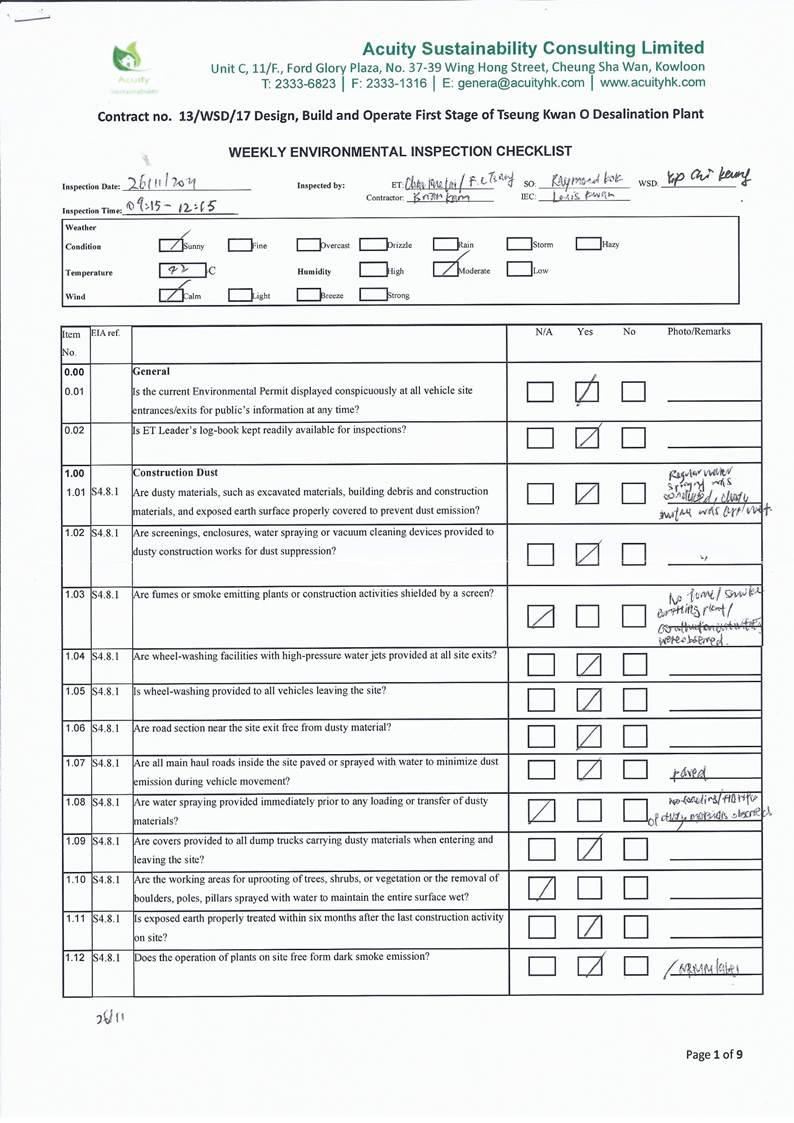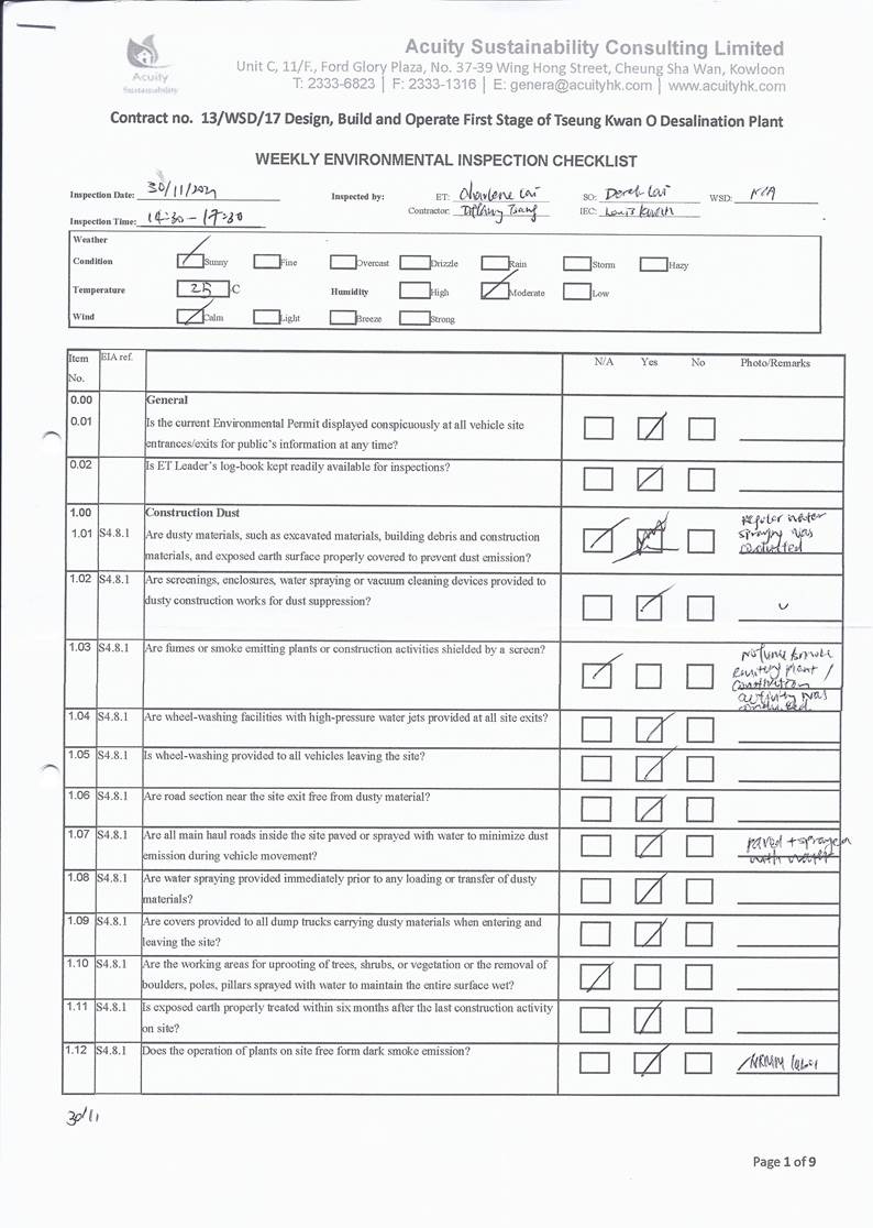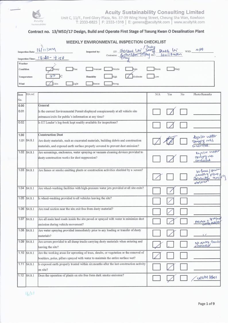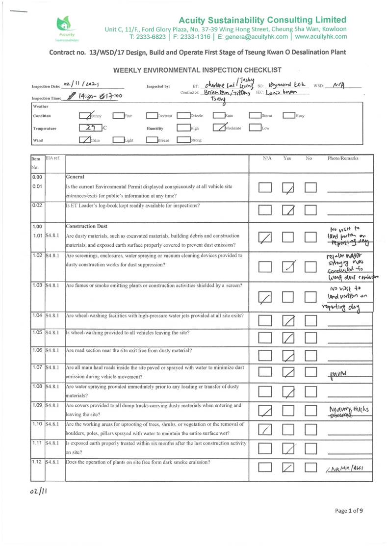 A15.Joint site inspections of the construction work by ET and IEC were carried out on 2, 9, 16, 26 and 30 November 2021 to audit the mitigation measures implementation status. Observations were recorded in the site inspection checklists and provided to the contractors together with the appropriate follow-up actions where necessary.